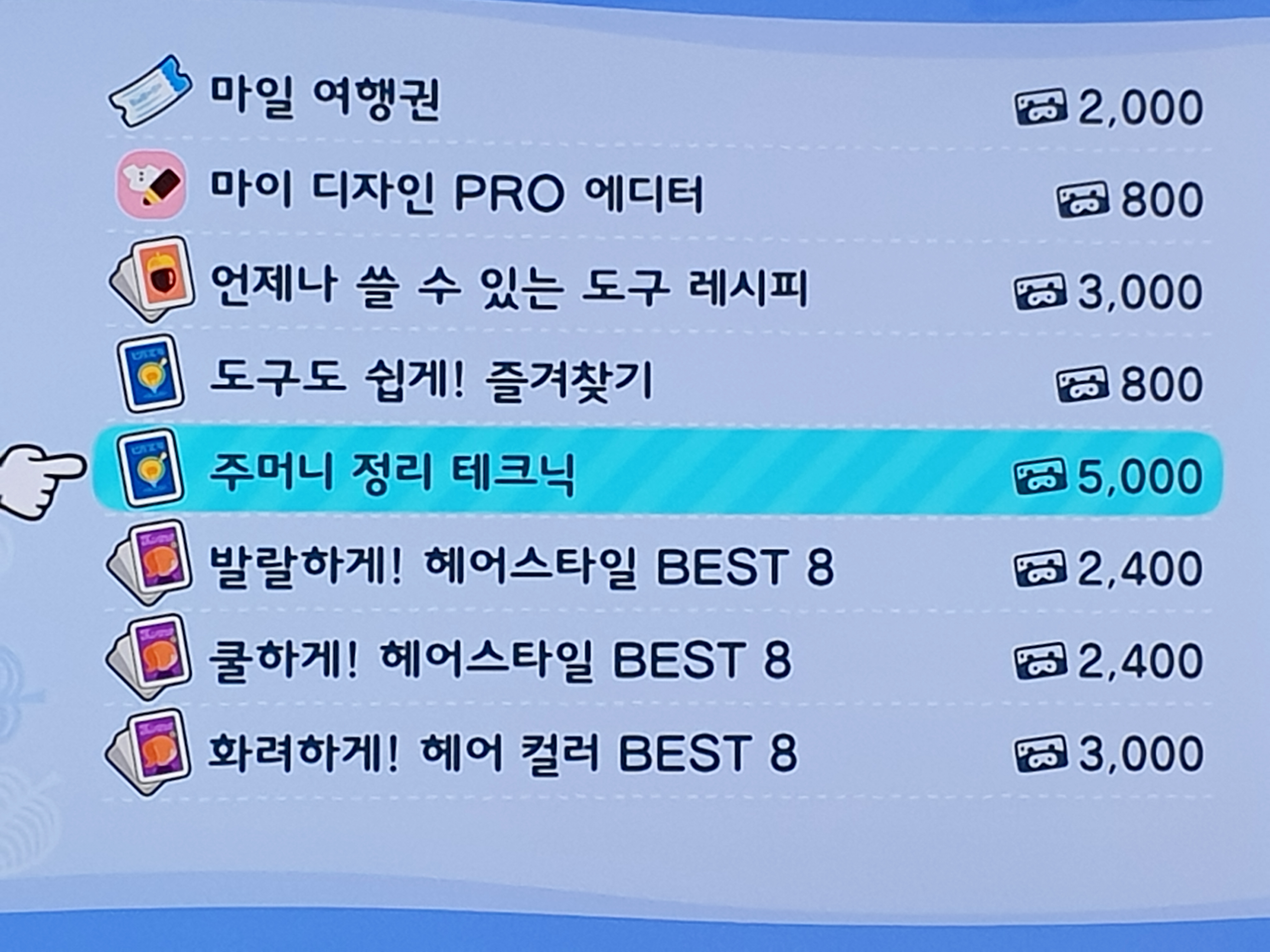 너굴 마일 교환을 누르면 주머니 정리 테크닉 5000마일을 클릭해줍니다.
