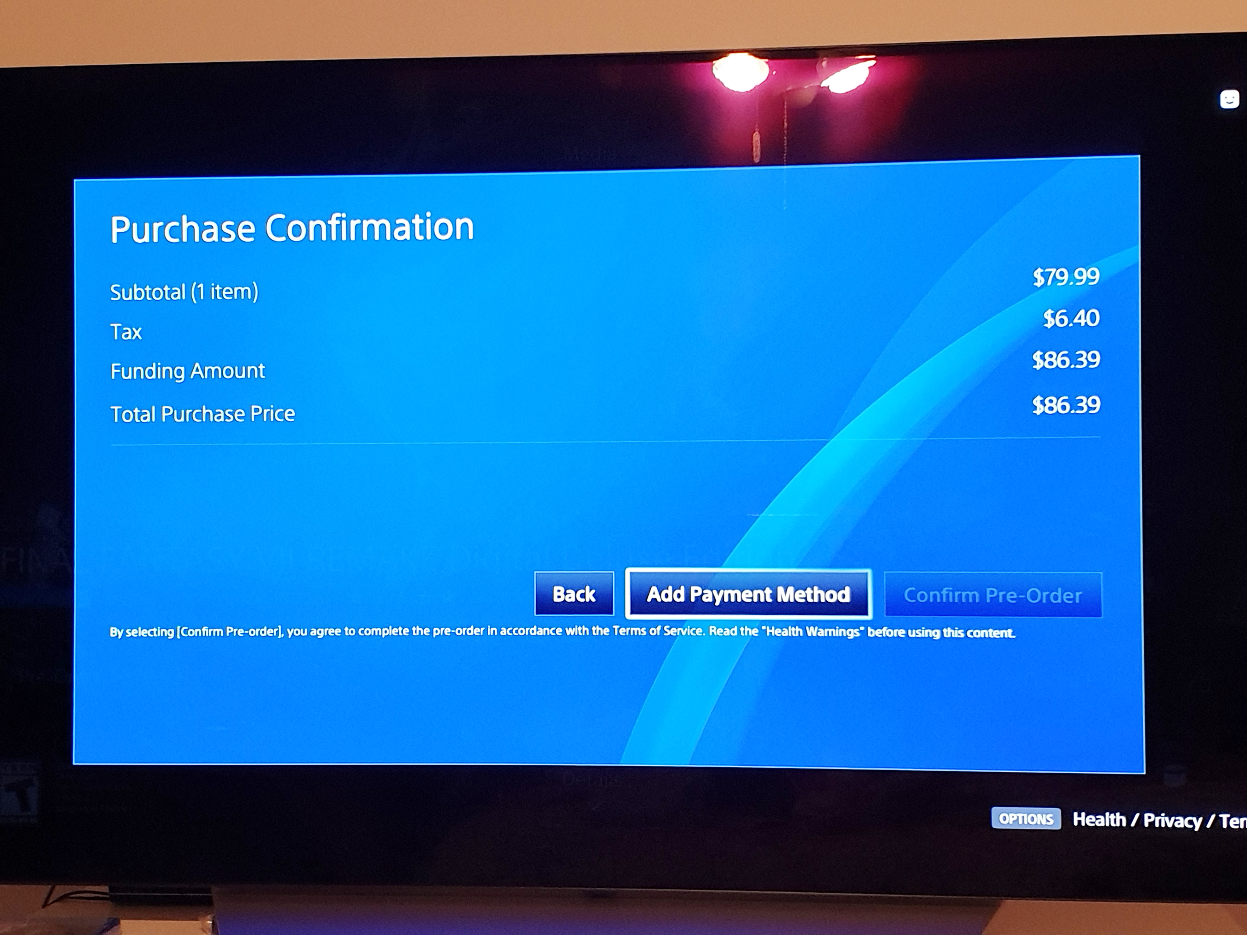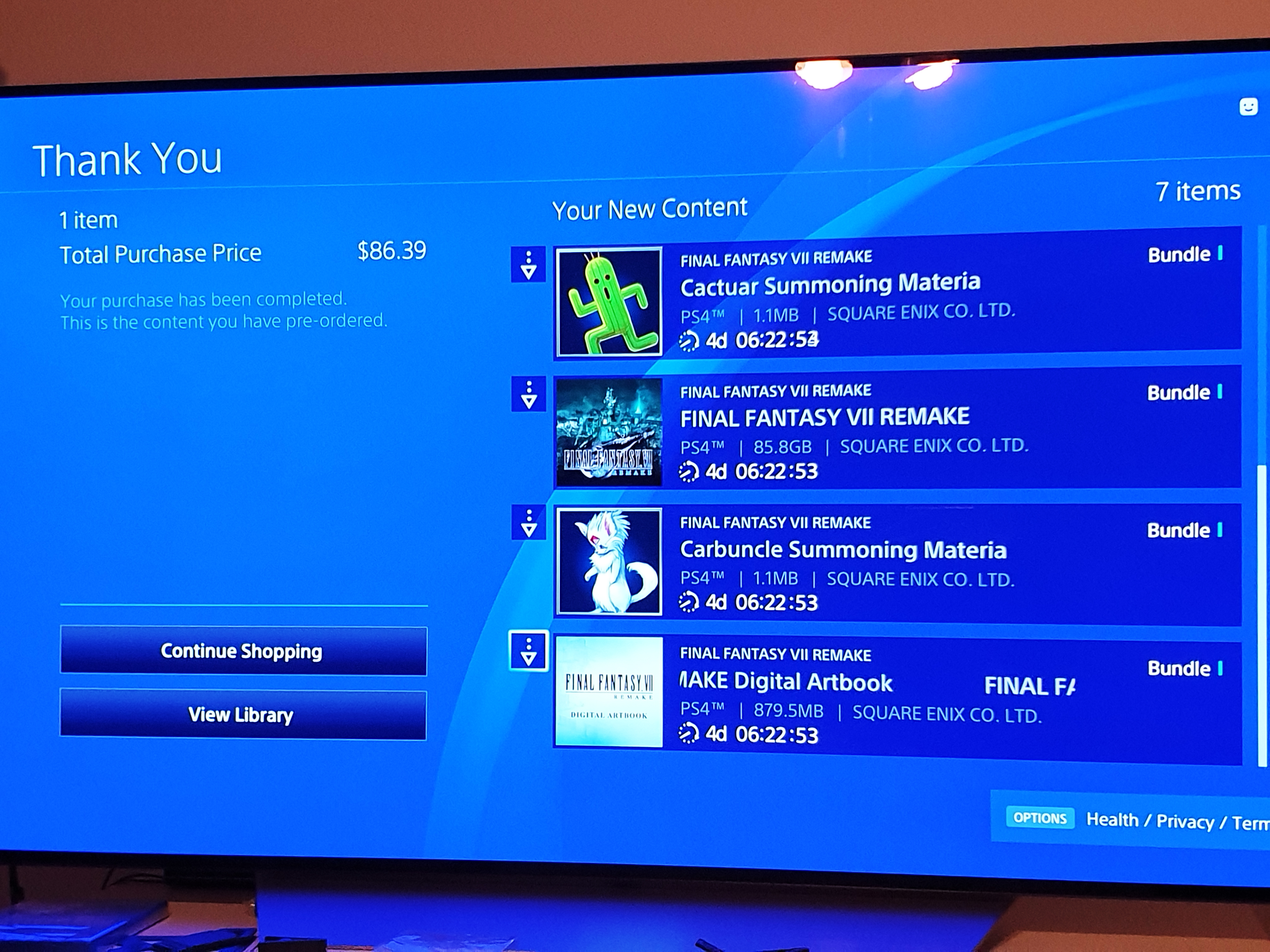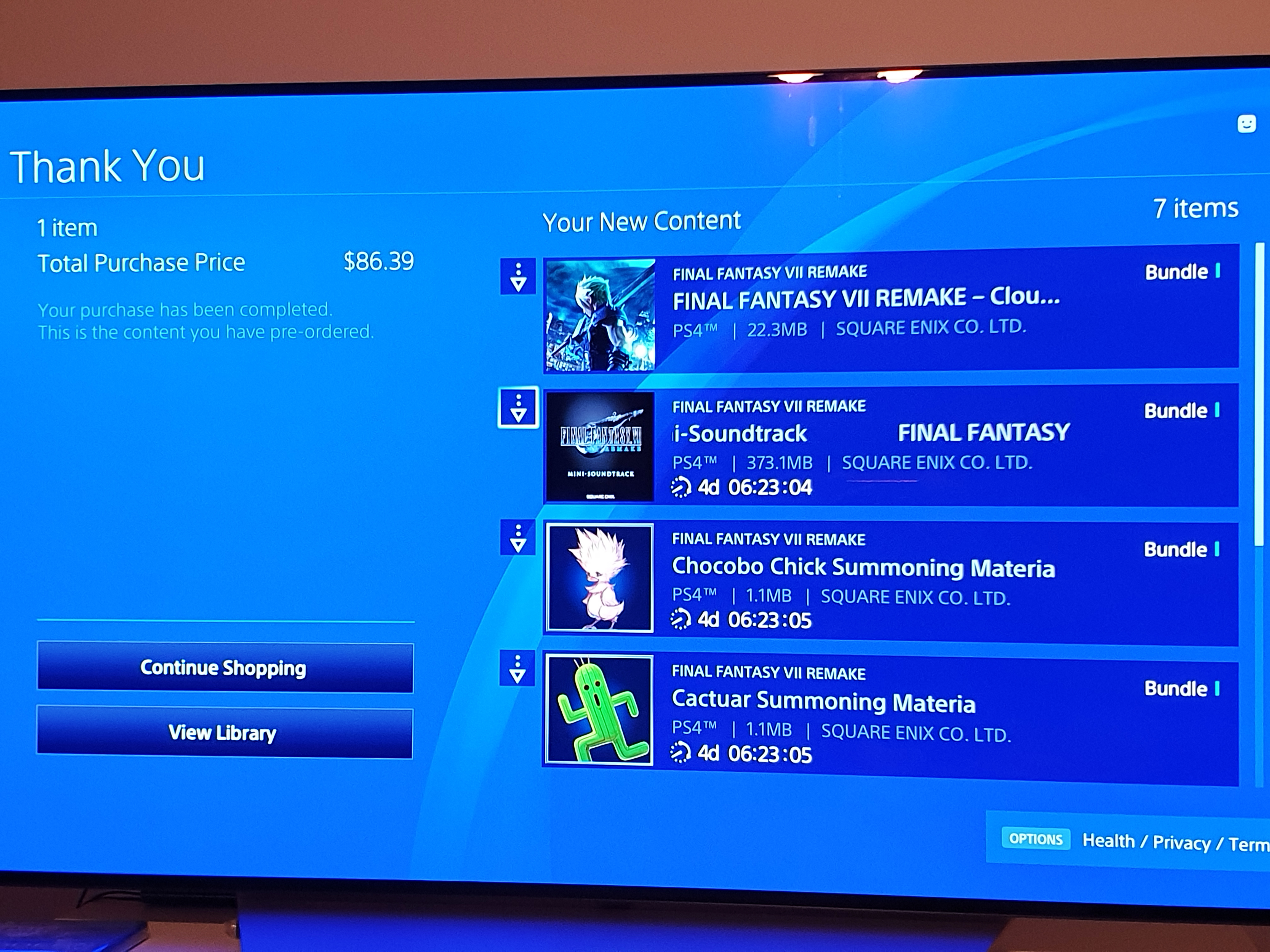 PS4는 준비가 됐으니 파이널 판타지 7 리메이크가 배송되기만 기다리면 되나 했는데 플레이스테이션 스토어를 보니 파이널 판타지 7 리메이크(디지털)를 구매할 수 있더라고요, 가격은 세금 포함 86.39달러 한화 약 106,100원 이 게임을 하기 위해 약 60만 원 넘게 투자했네요 ㅋㅋㅋㅋ;; 남편은 출시 당일날 게임을 하고 싶다고 해서 디스크는 주문을 취소를 하고 디지털로 다시 구매를 했습니다.