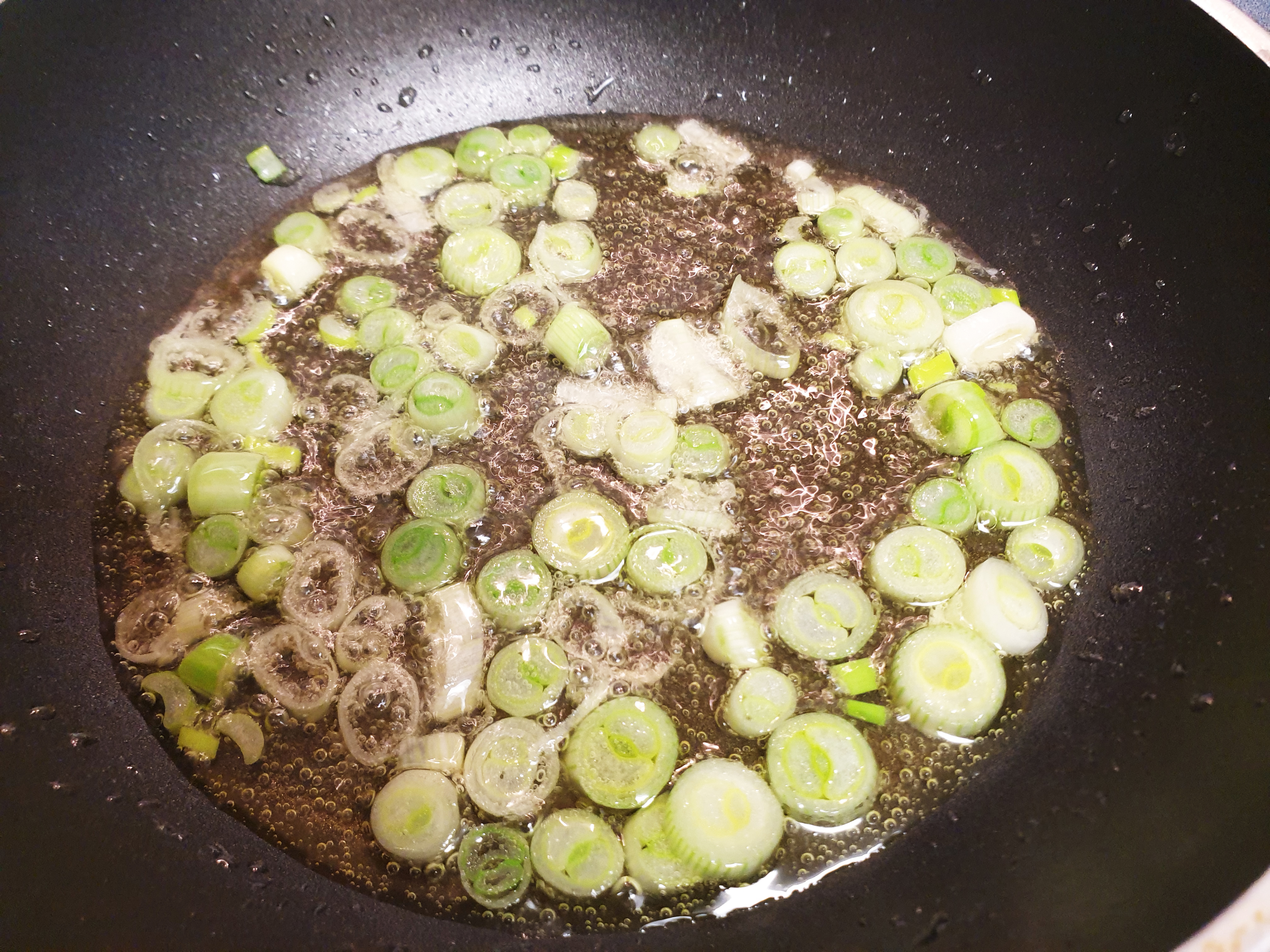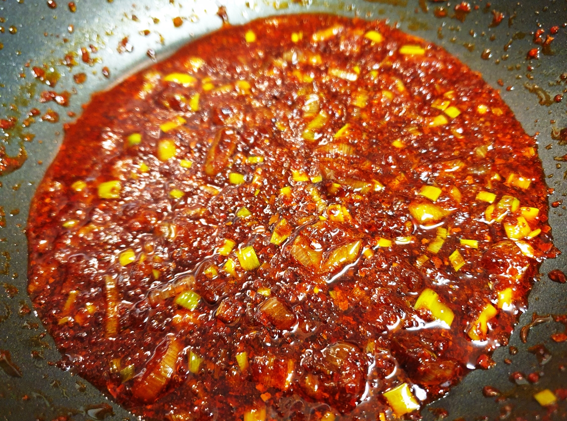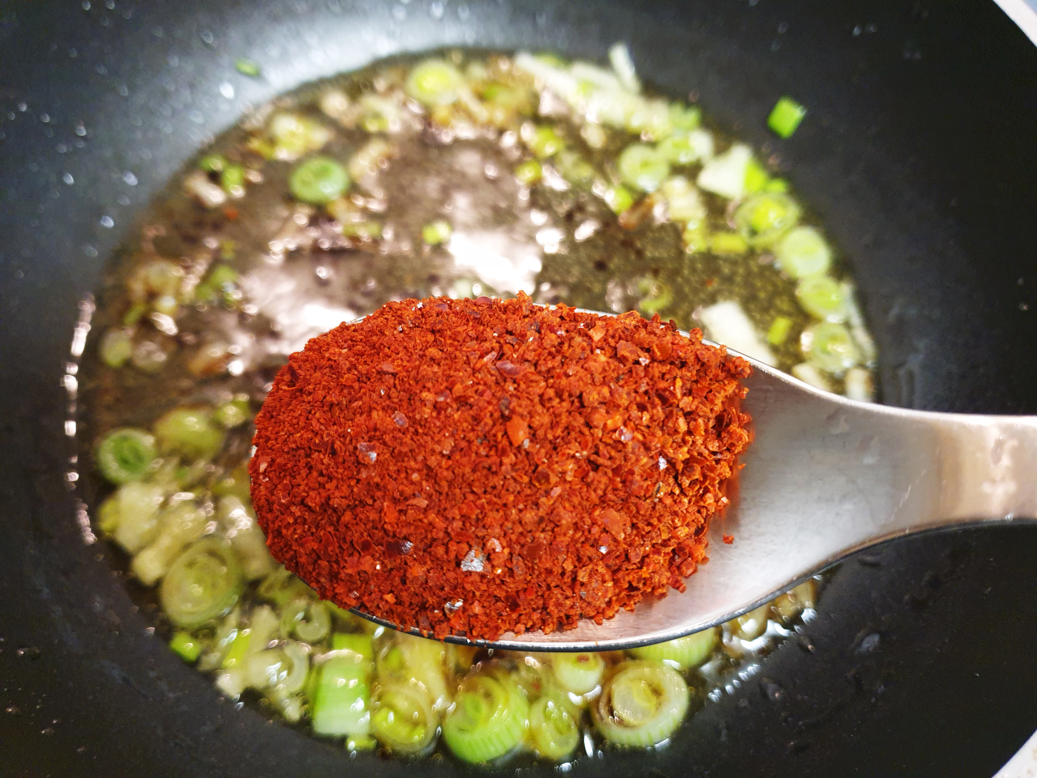 고추기름을 만드는 법은 아주아주 간단해요! 우선 파를 총총 썰어 준비해 주시고 불은 약불에 맞춰주고 식용유 4스푼, 고춧가루 2스푼, 간장 1스푼, 약간의 설탕을 넣고 약 10분간 잘 저어주세요,