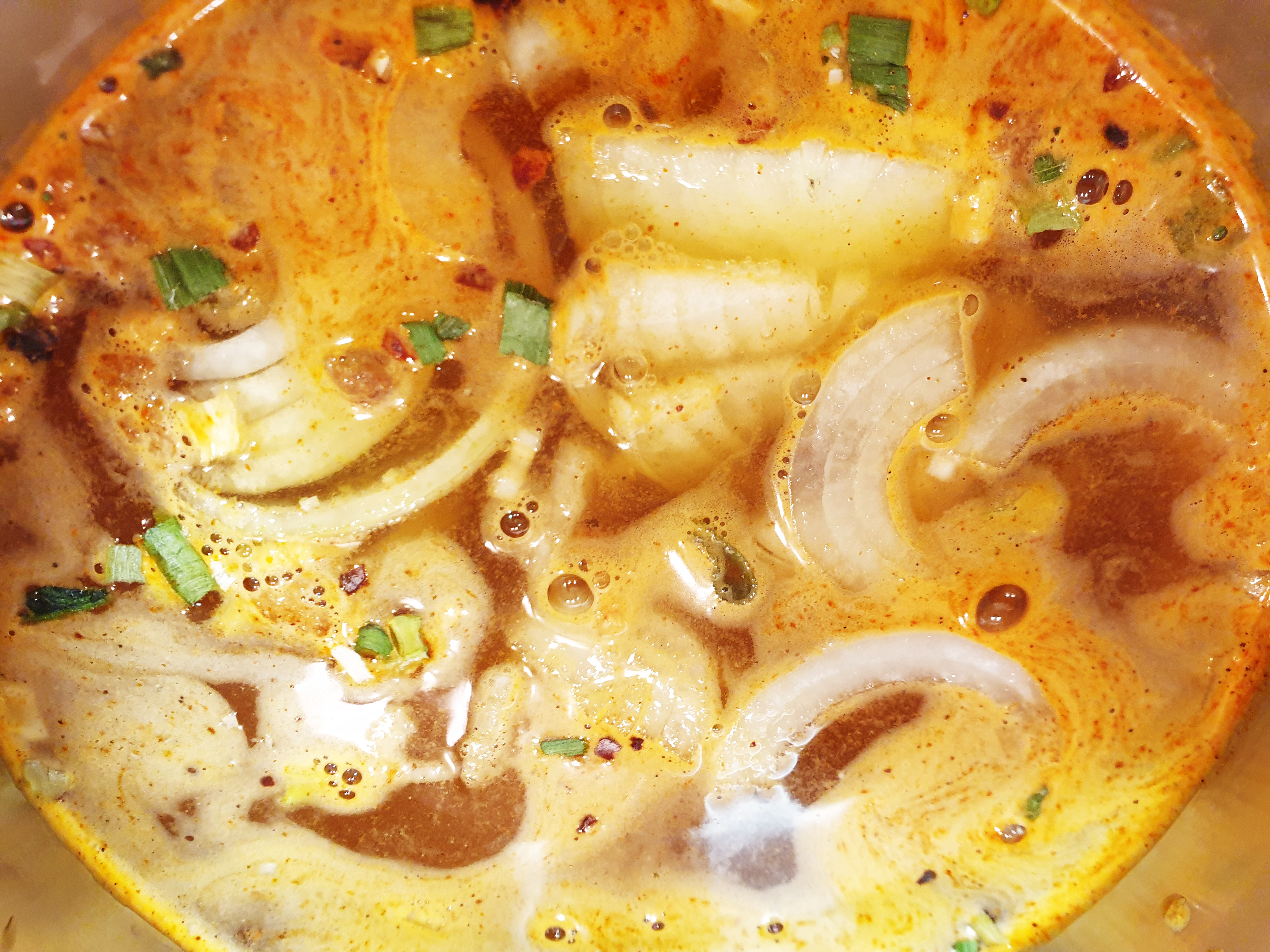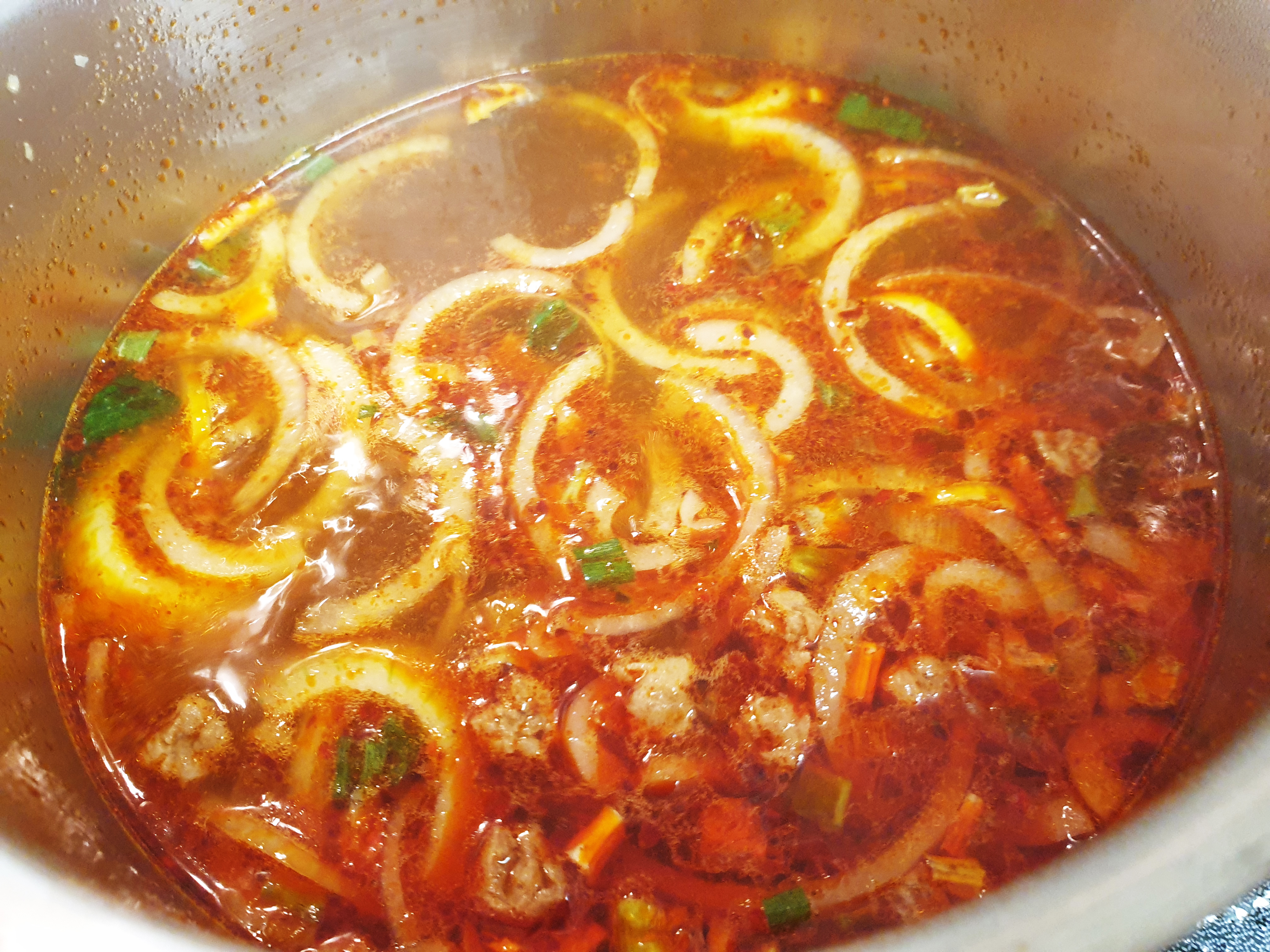 (라면 1봉 기준) 고추기름을 넣었을 때 맛이 짜지지 않도록 라면 물을 맞출 때 반 컵 정도 더 넣어주세요! 물이 끓기 시작하면 고추기름 2스푼, 양파, 파, 라면수프를 넣고 재료에서 국물이 우러날 수 있도록 5분 정도 끓어준 후 라면을 넣어 끓여주면 끝!