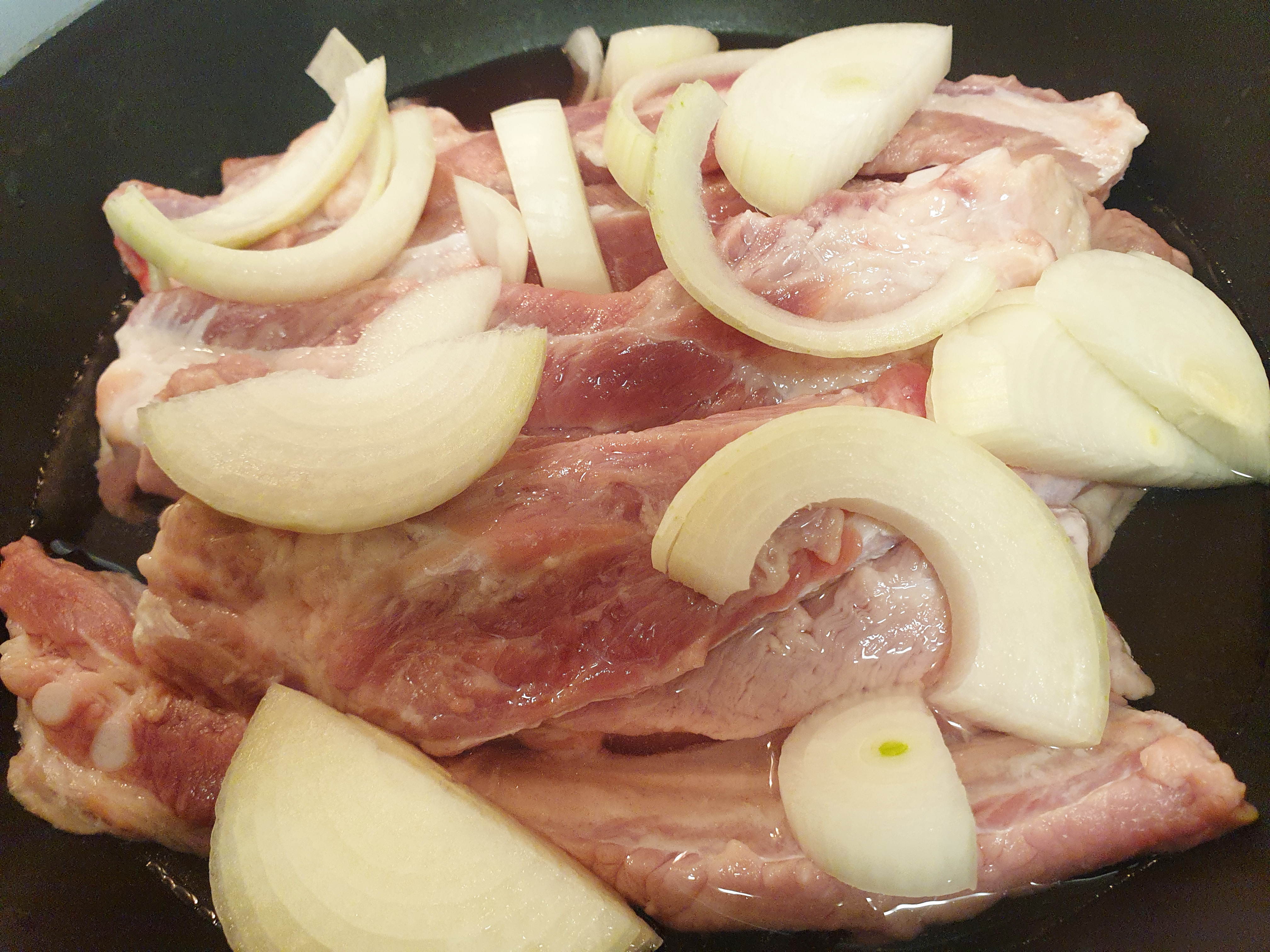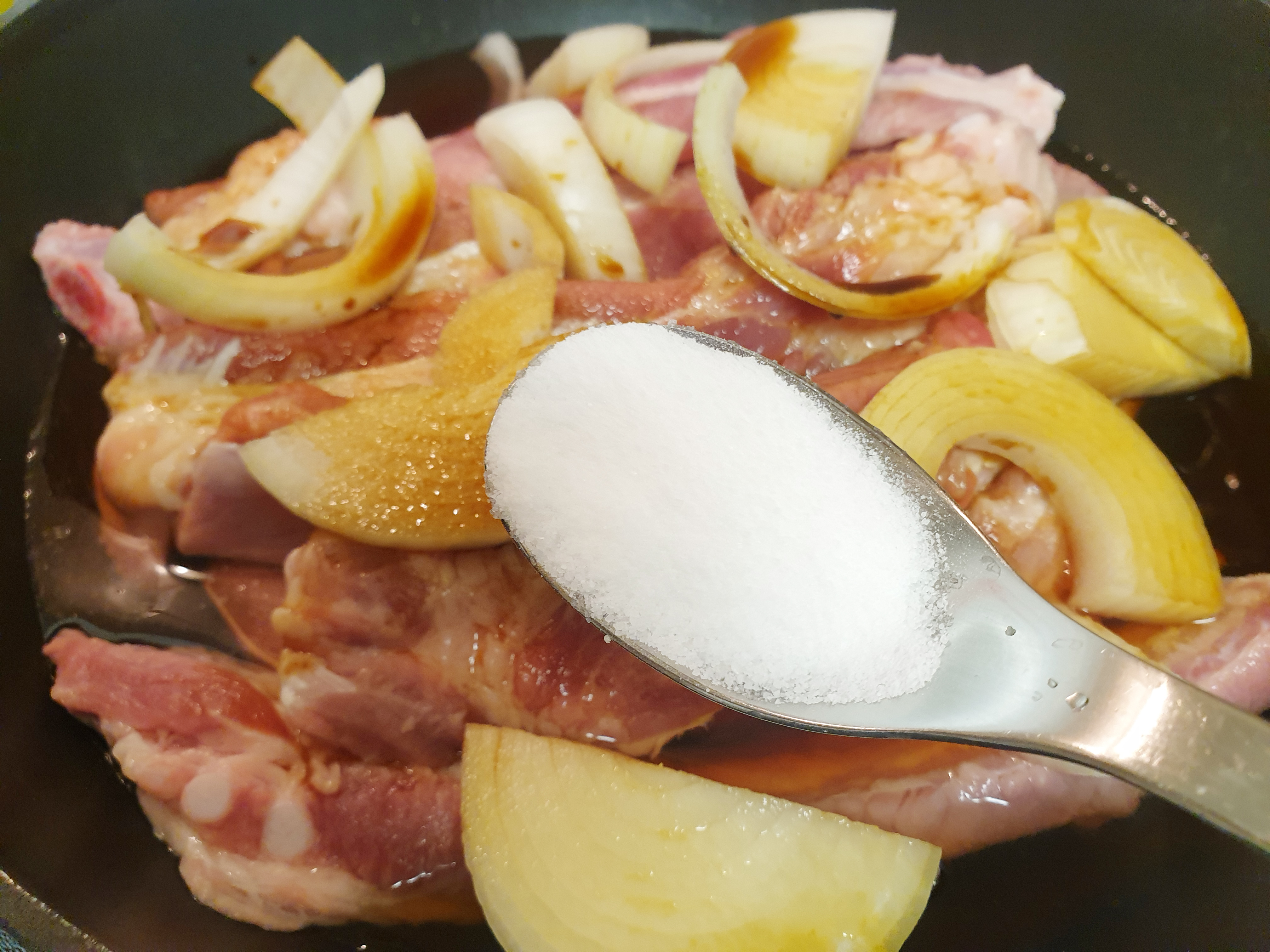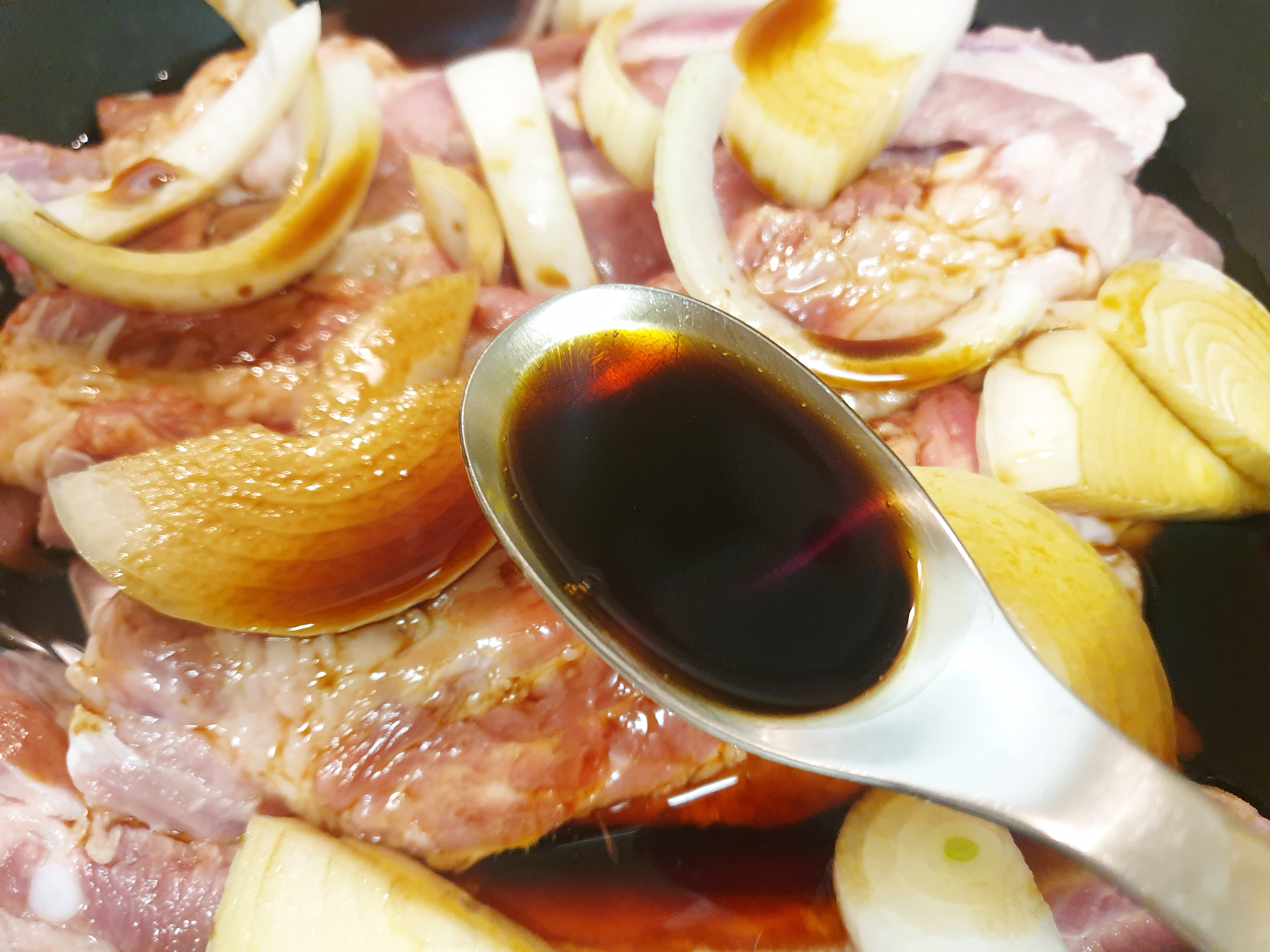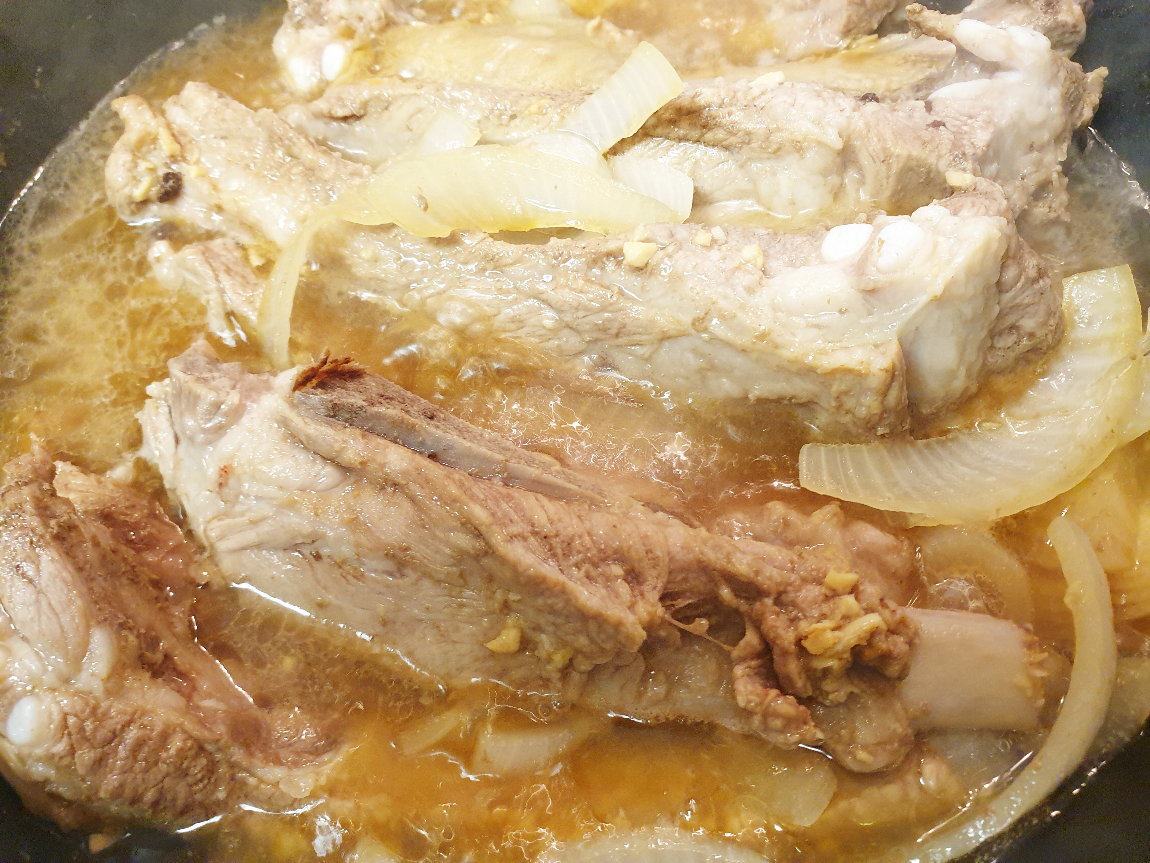 재료가 준비됐다면 냄비에 등갈비를 넣고 물 한컵 반을 부어준 뒤 설탕 2스푼, 간장 8스푼, 다진 마늘 1스푼, 채 썬 양파를 넣어주고 고기가 어느 정도 익을 때까지 중불에 맞춰 끓여주세요~!