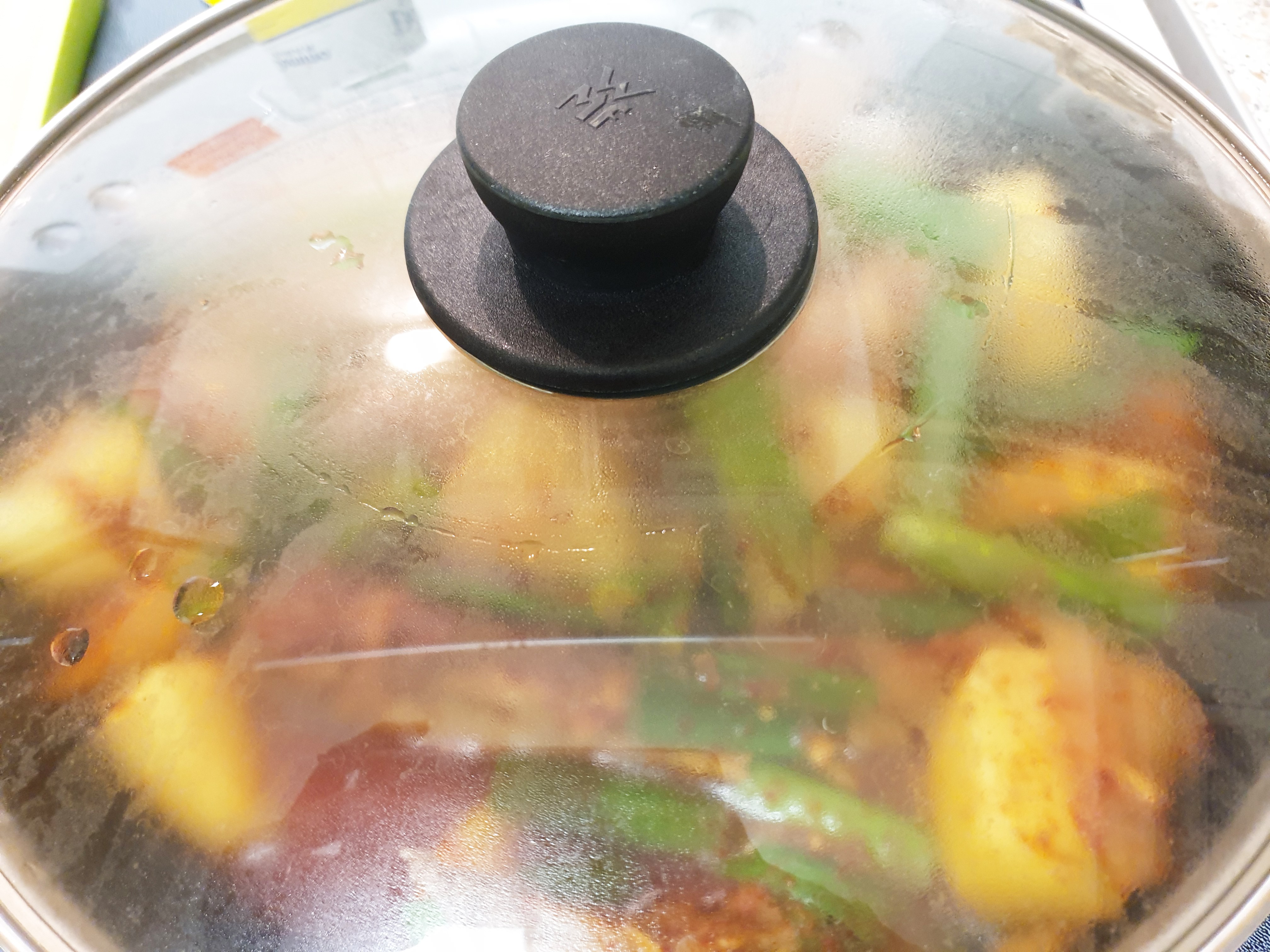 약 10분 뒤 고기가 어느 정도 익고 양파가 흐믈흐믈해졌다면 썰어둔 감자 , 고춧가루 5스푼, 대파 1(크게 썰어주세요) 넣어주고 뚜껑을 닫고 불은 중불보다 약하게 맞춘 후 감자와 고기가 잘 익을 때까지 조리해주세요! 마무리가 될 때쯤에 물엿을 한번 둘러주세요~!