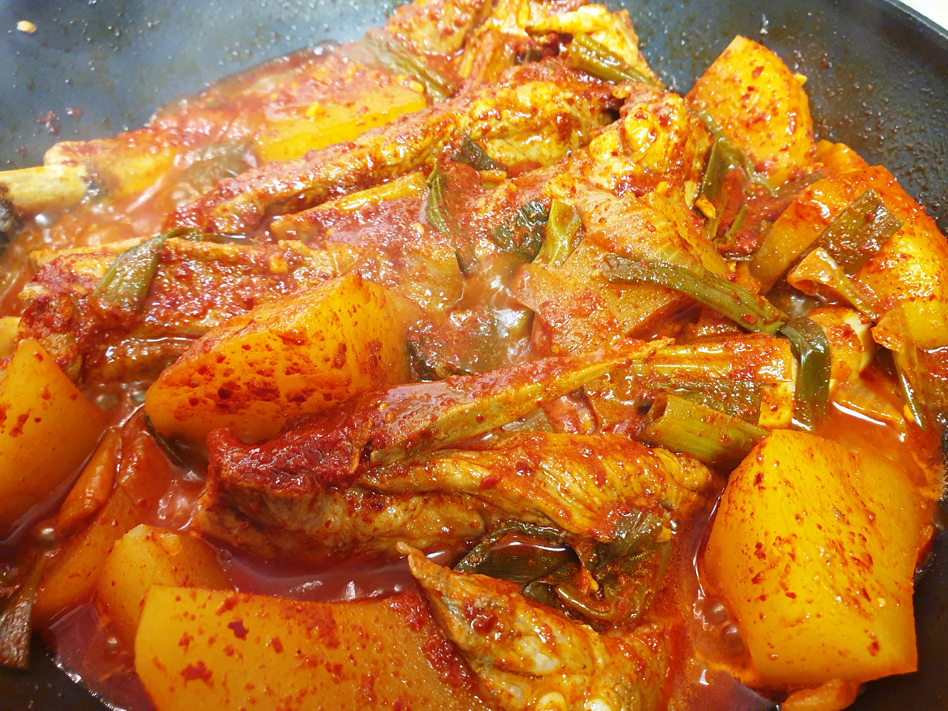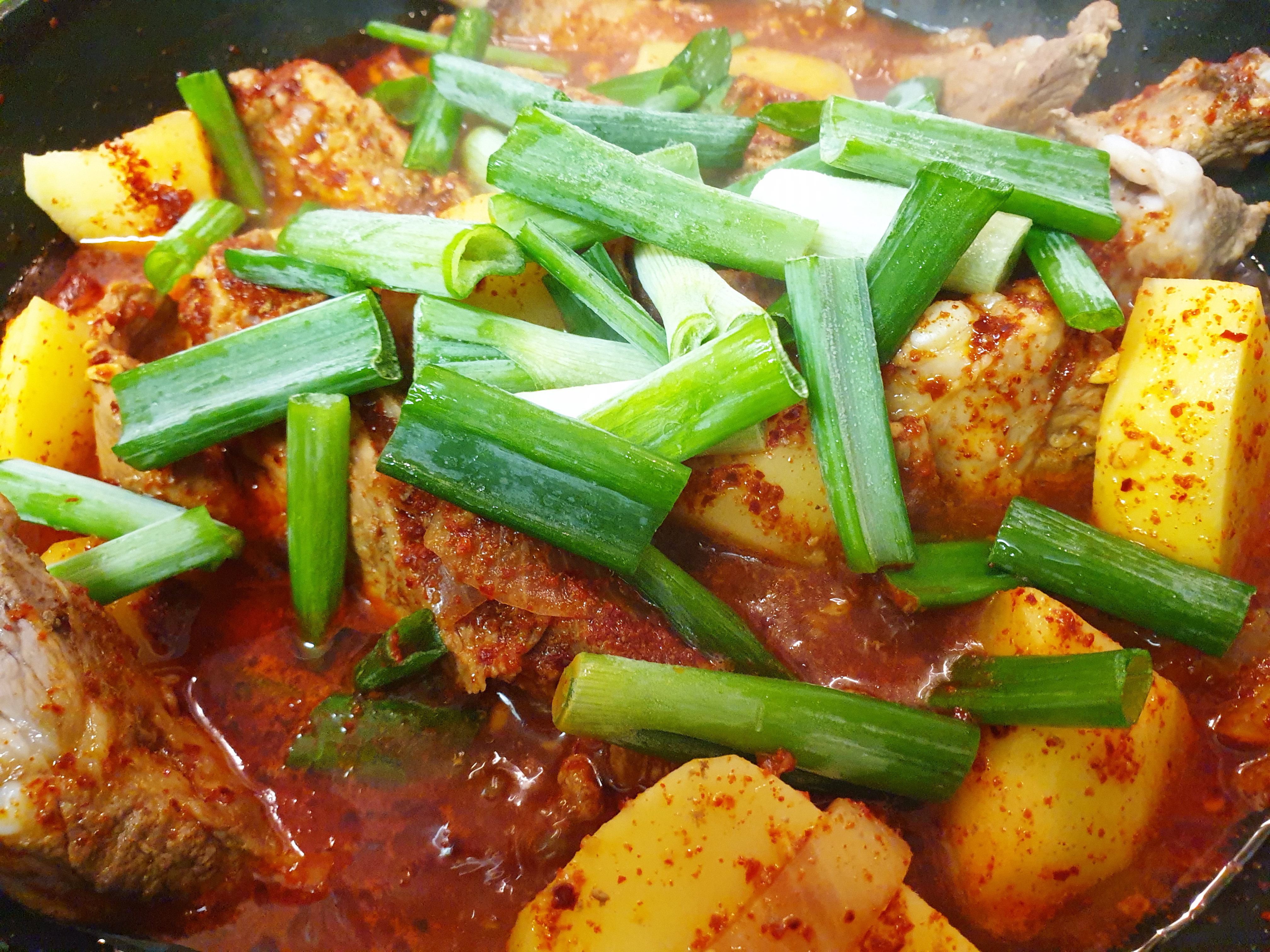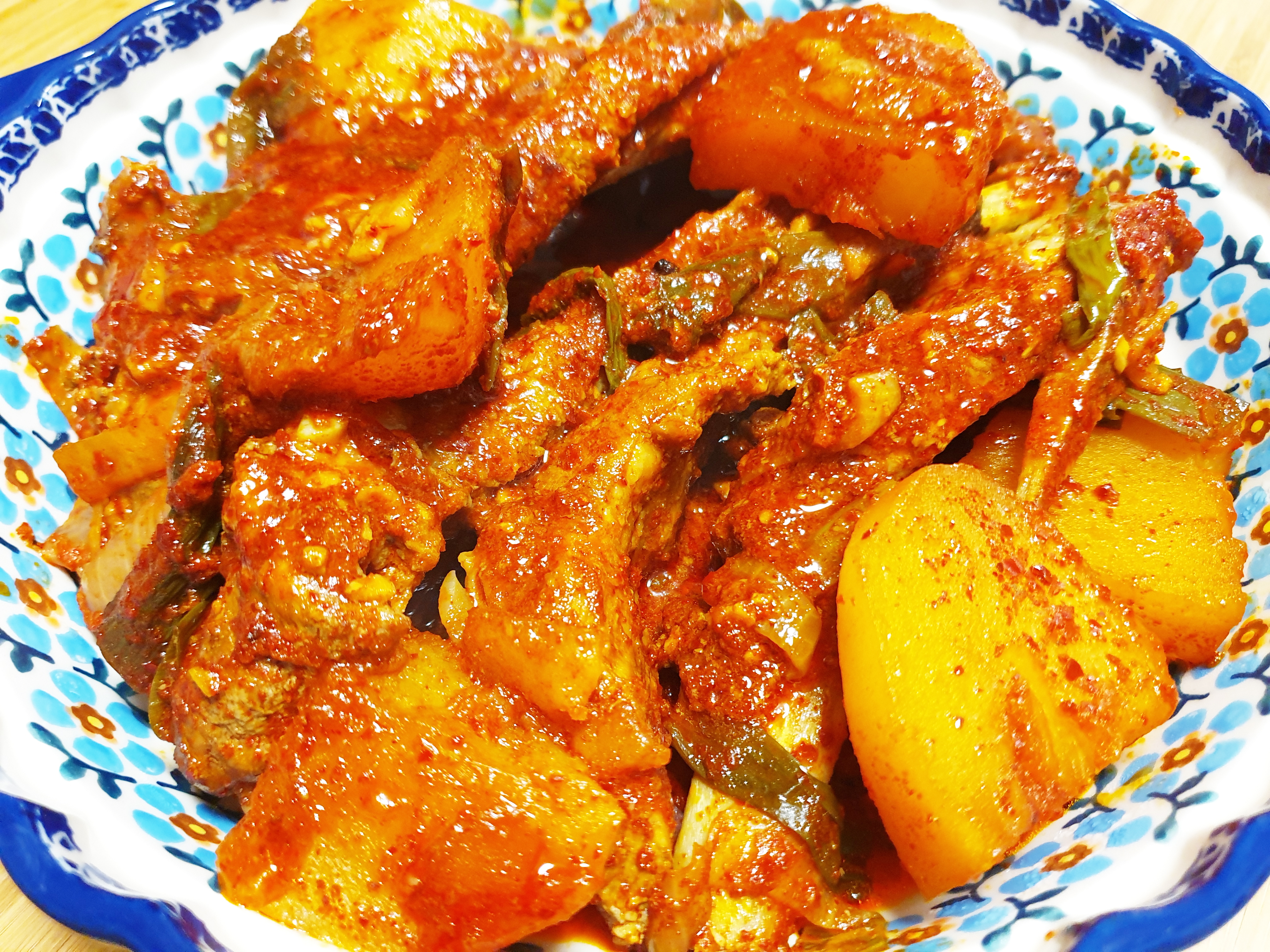 짠! 맛있는 매운 등갈비찜이 완성되었습니다.!! 저는 약 30분 동안 조리를 해줬습니다. 맵기는 중간 정도라 더 매운맛을 원하시는 분들은 감자와 고춧가루 넣는 과정에서 청양고추도 같이 썰어 넣어주세요~!
