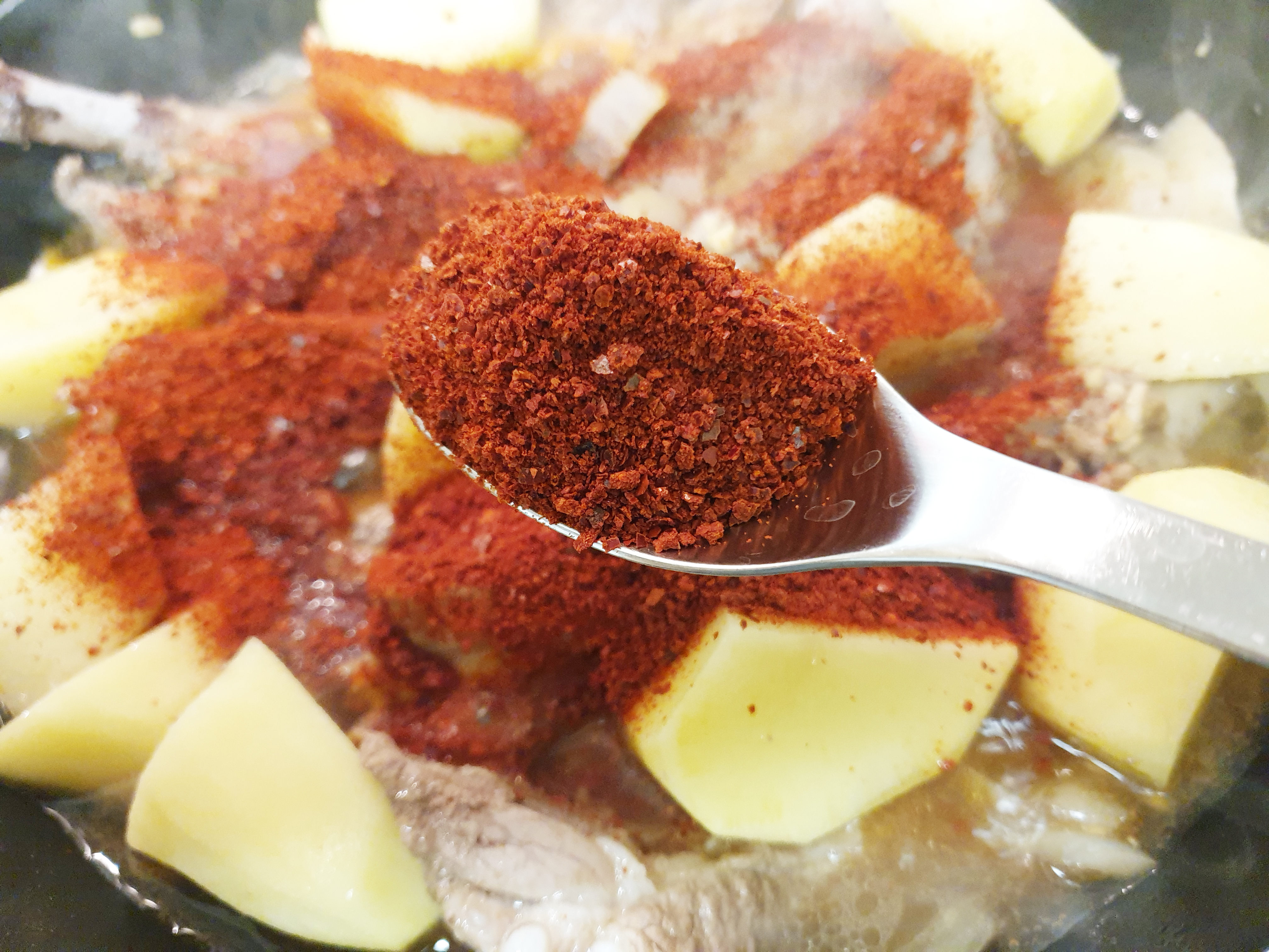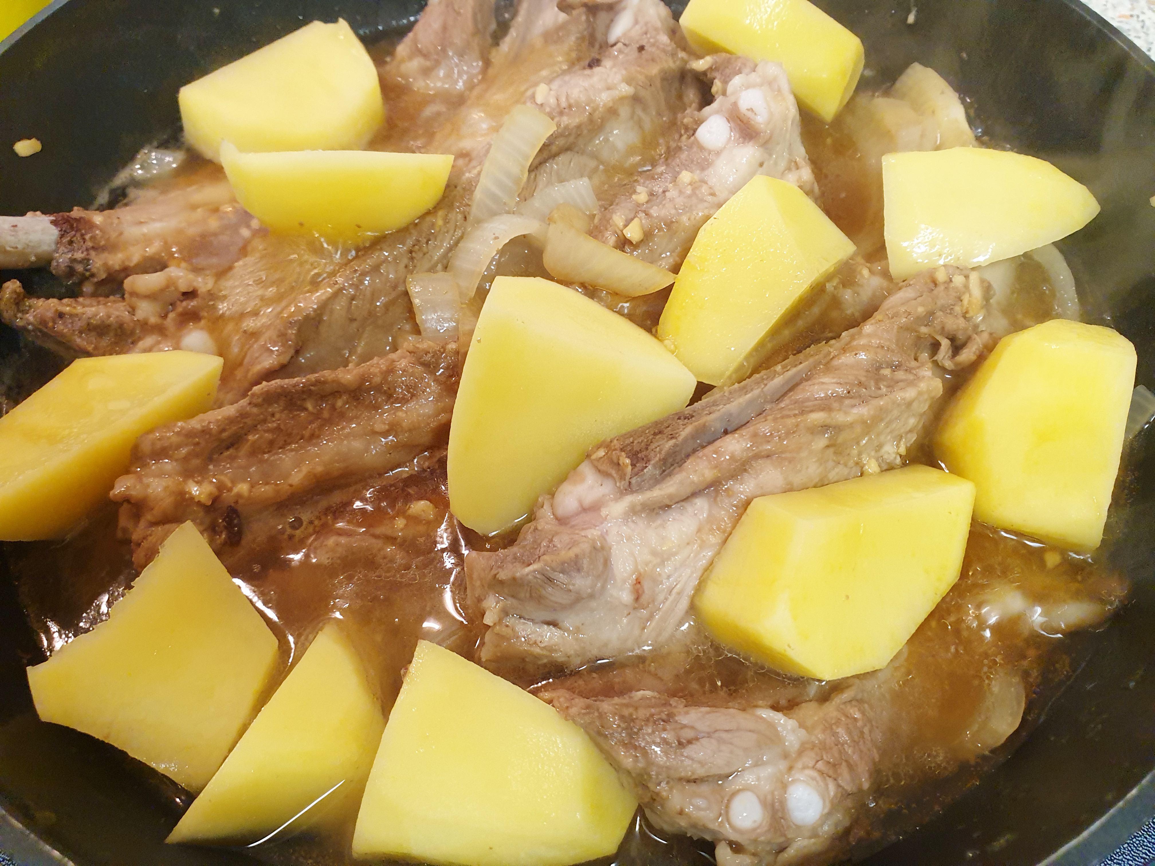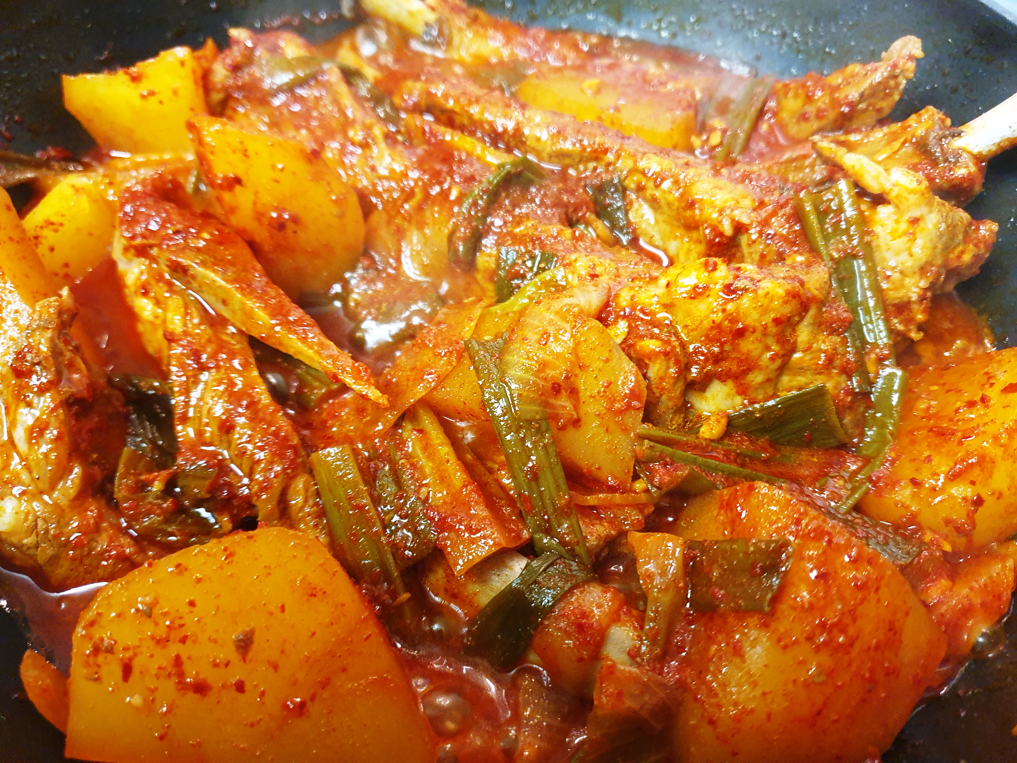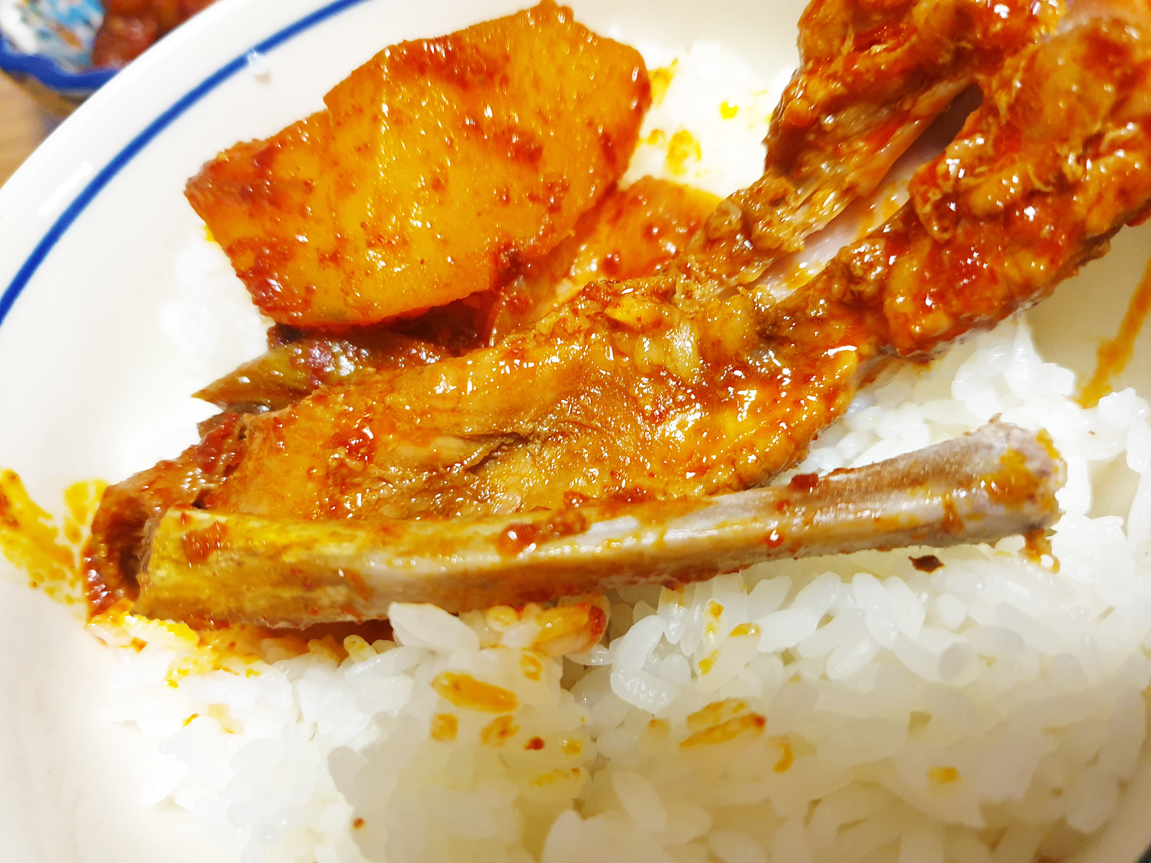 짠! 맛있는 매운 등갈비찜이 완성되었습니다.!! 저는 약 30분 동안 조리를 해줬습니다. 맵기는 중간 정도라 더 매운맛을 원하시는 분들은 감자와 고춧가루 넣는 과정에서 청양고추도 같이 썰어 넣어주세요~!