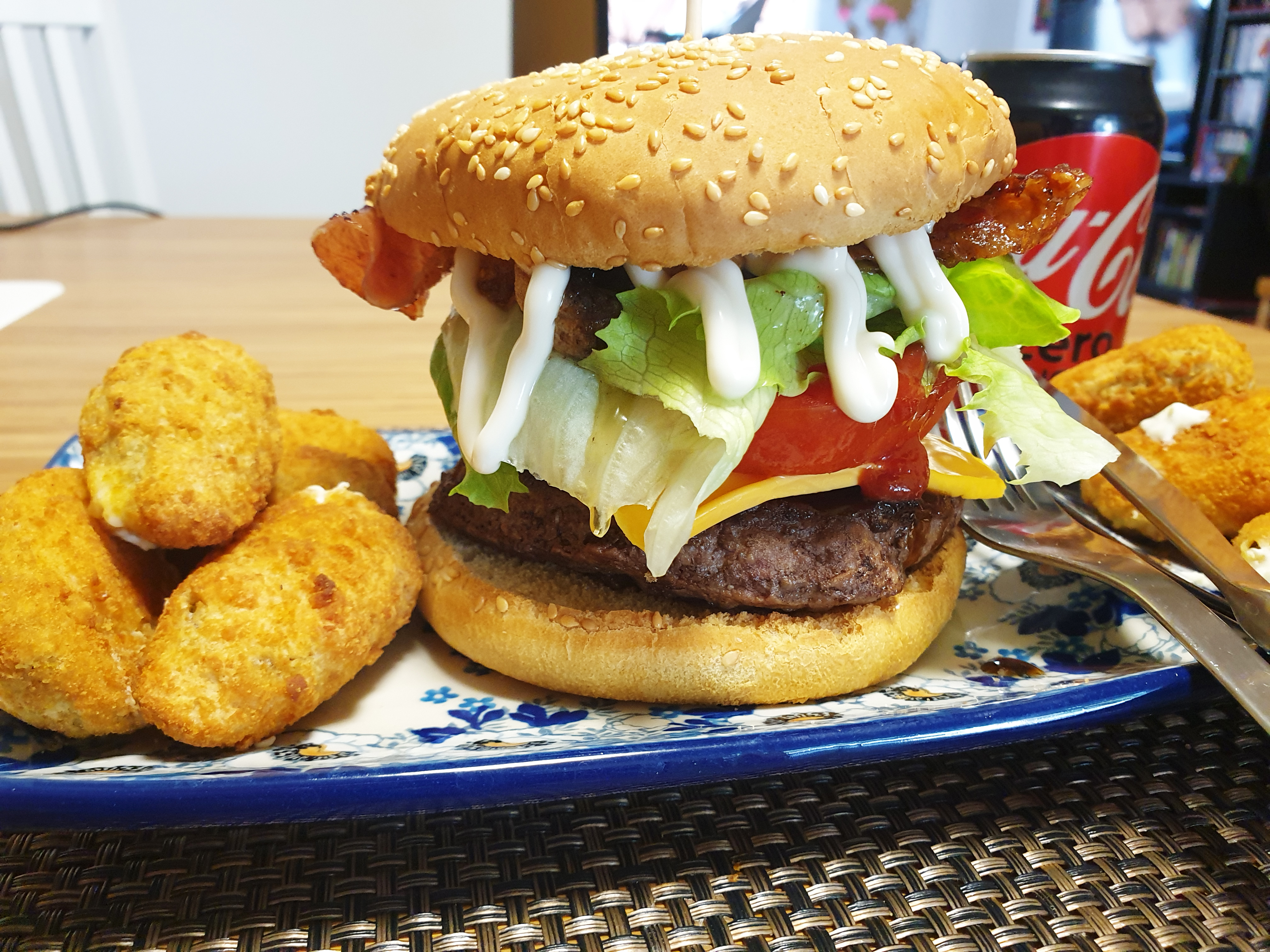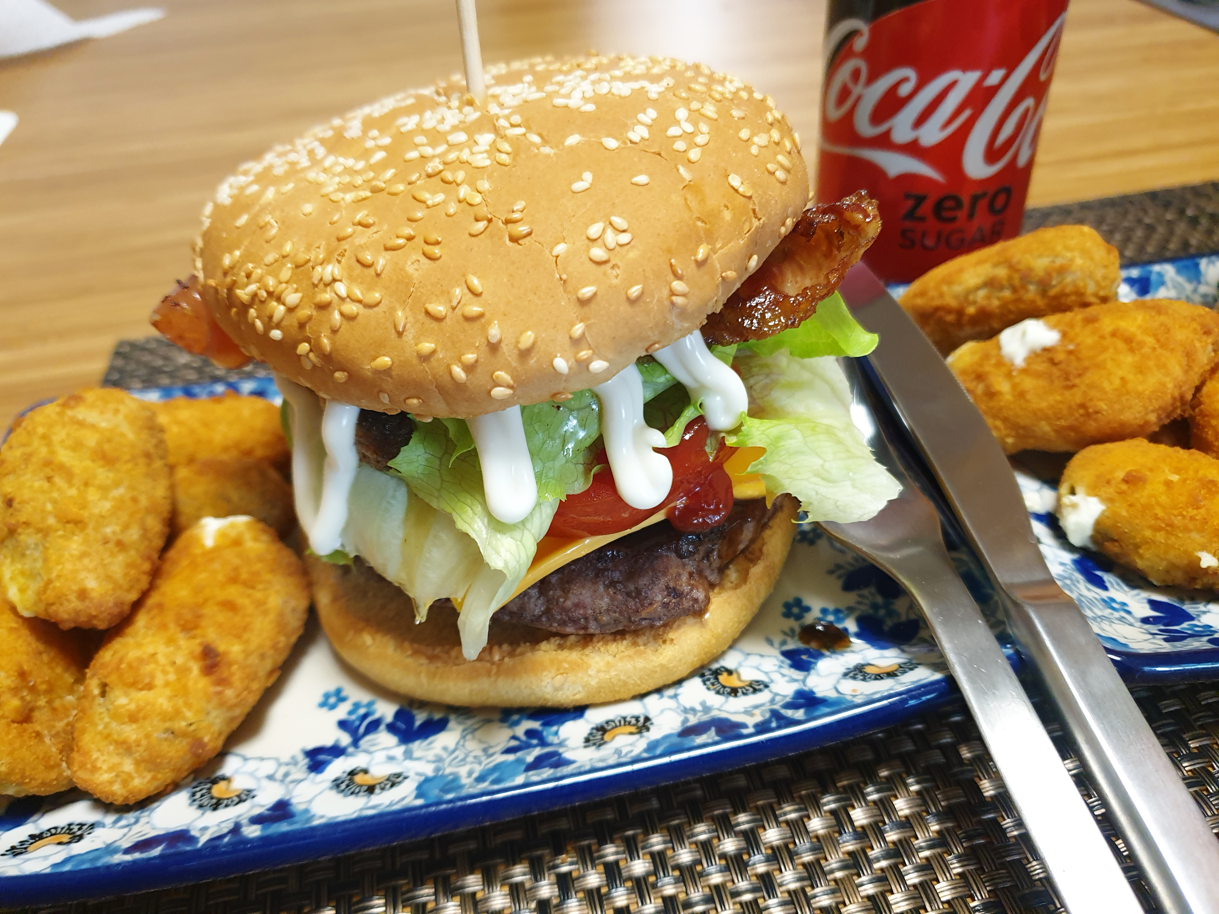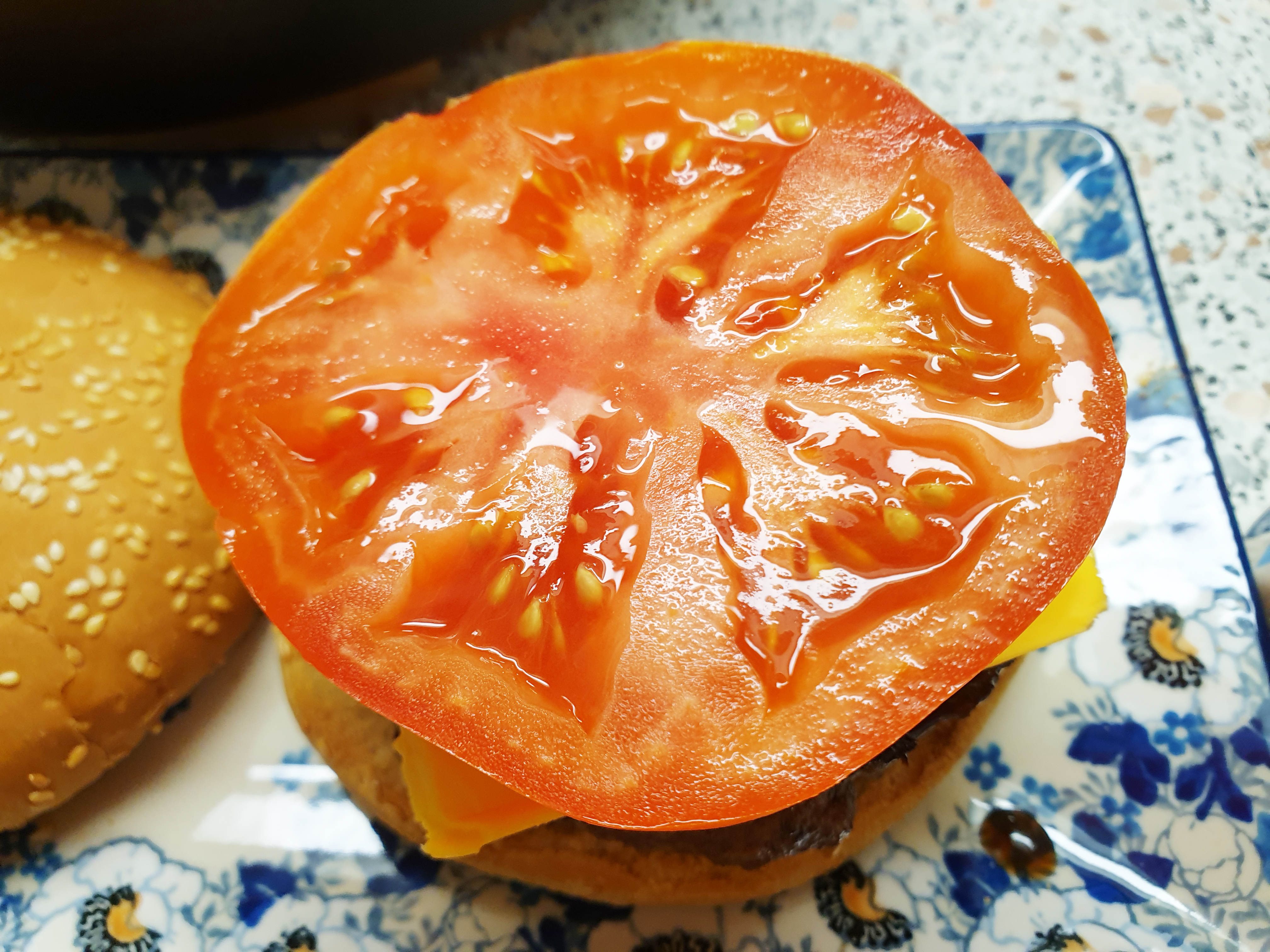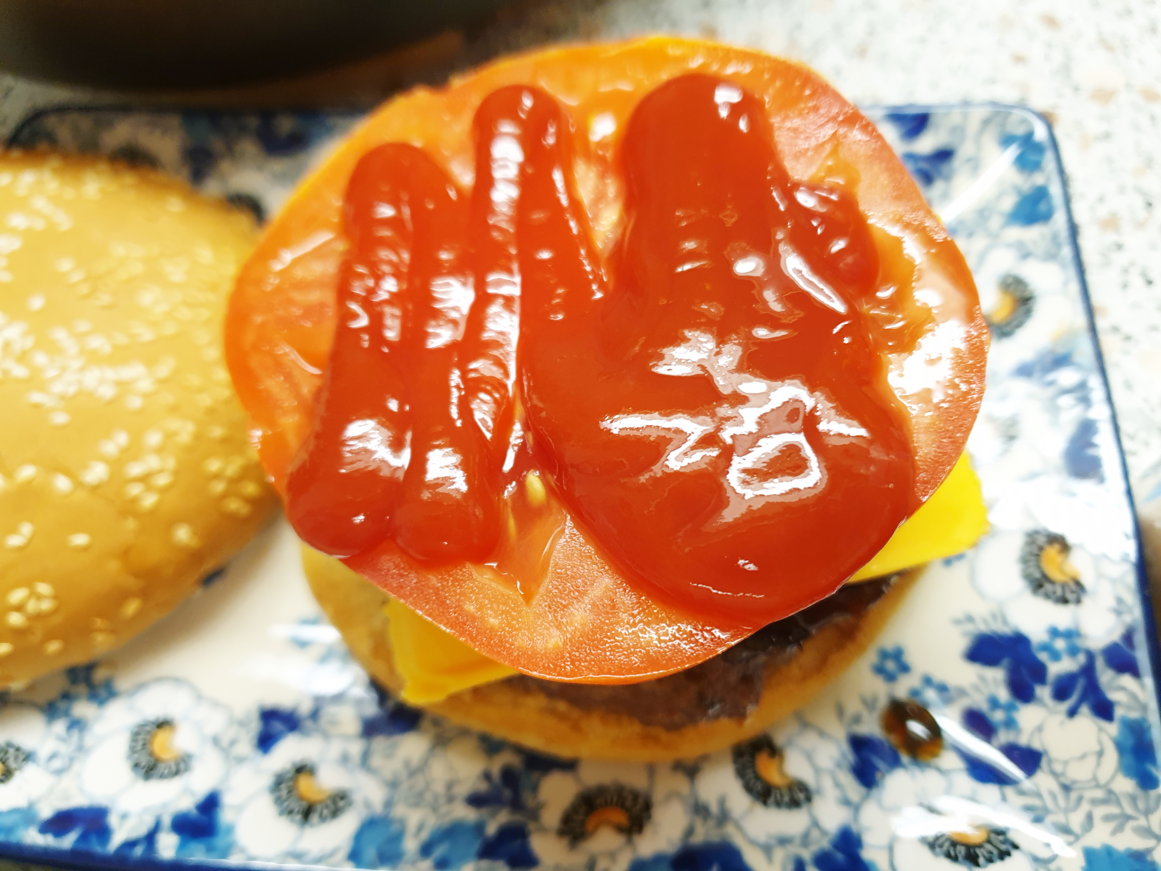 이렇게 완성된 수제버거 >< 남편이 대만족! 맛이 정말 좋았고 높이 쌓아 먹었더니 하나를 다 못 먹을 정도로 배가 불렀습니다. 아! 햄버거를 고정하기 위해 나무 꼬치를 가운데에 꽂아 주는 것도 좋은 방법입니다!