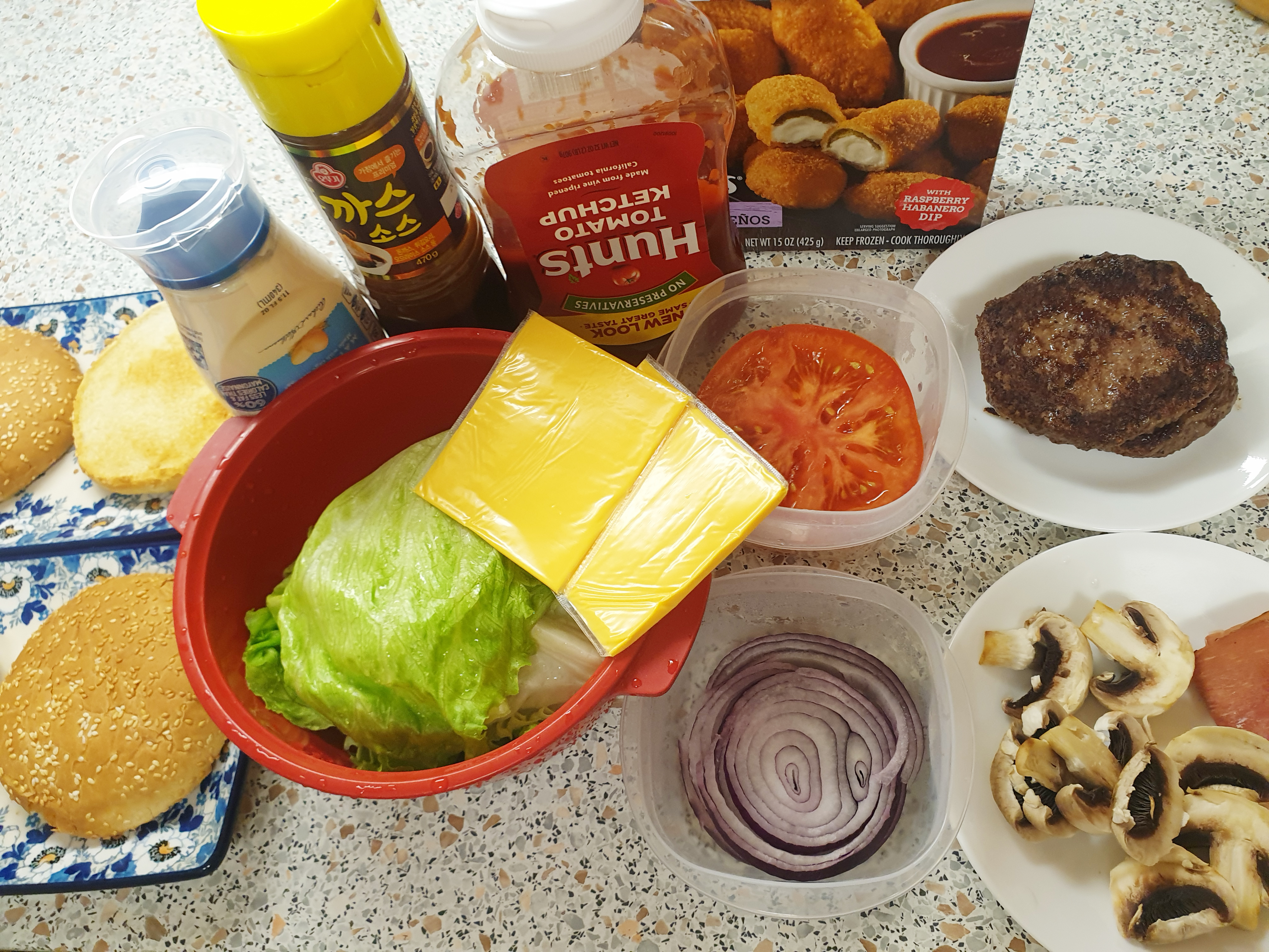수제버거 필요한 재료: 수제버거 번, 체다치즈, 자색 양파, 양송이 버섯, 햄버거 패티, 토마토, 베이컨, 피클, 햄버거 소스, 양배추 , 나무 꼬치