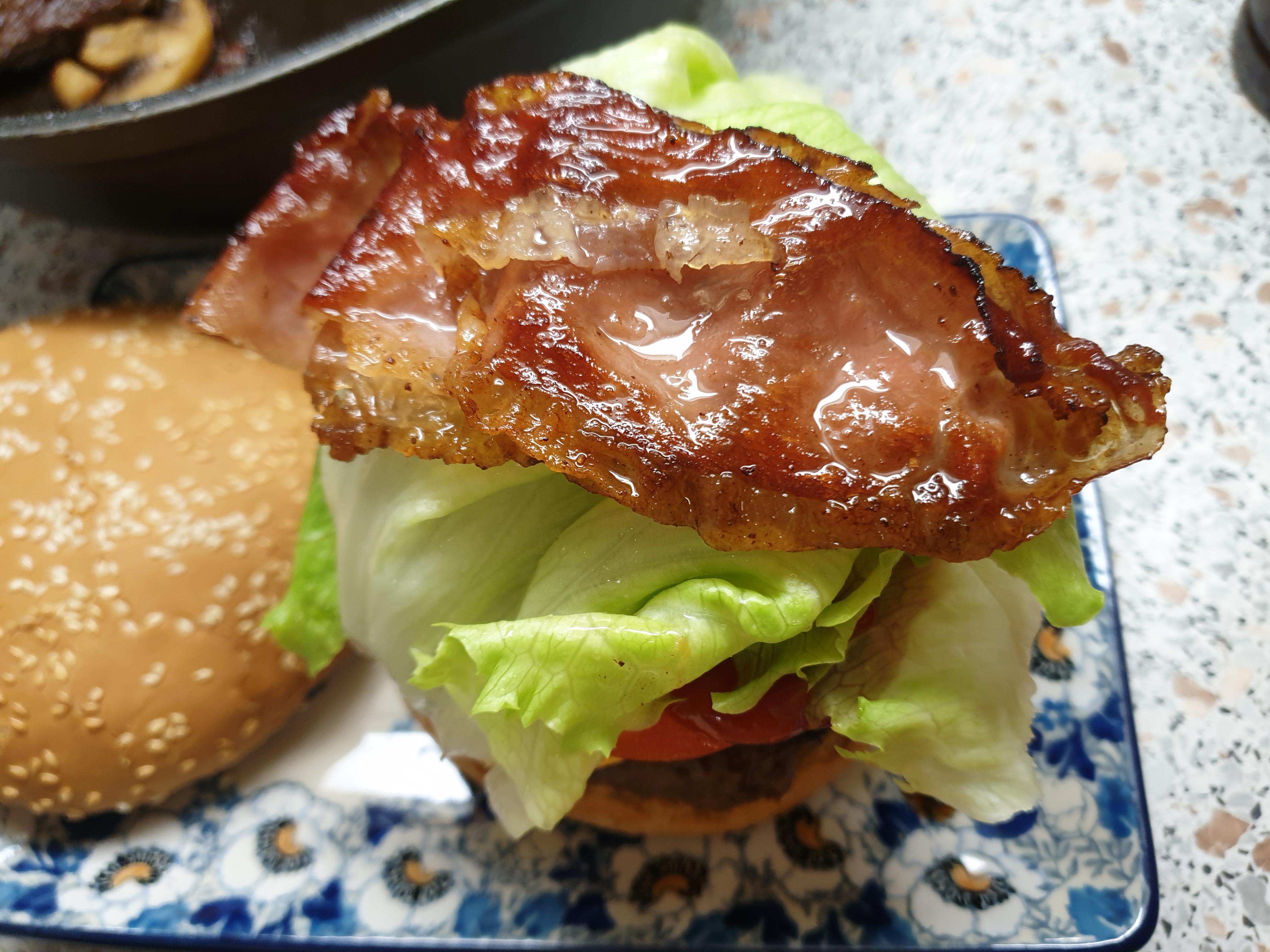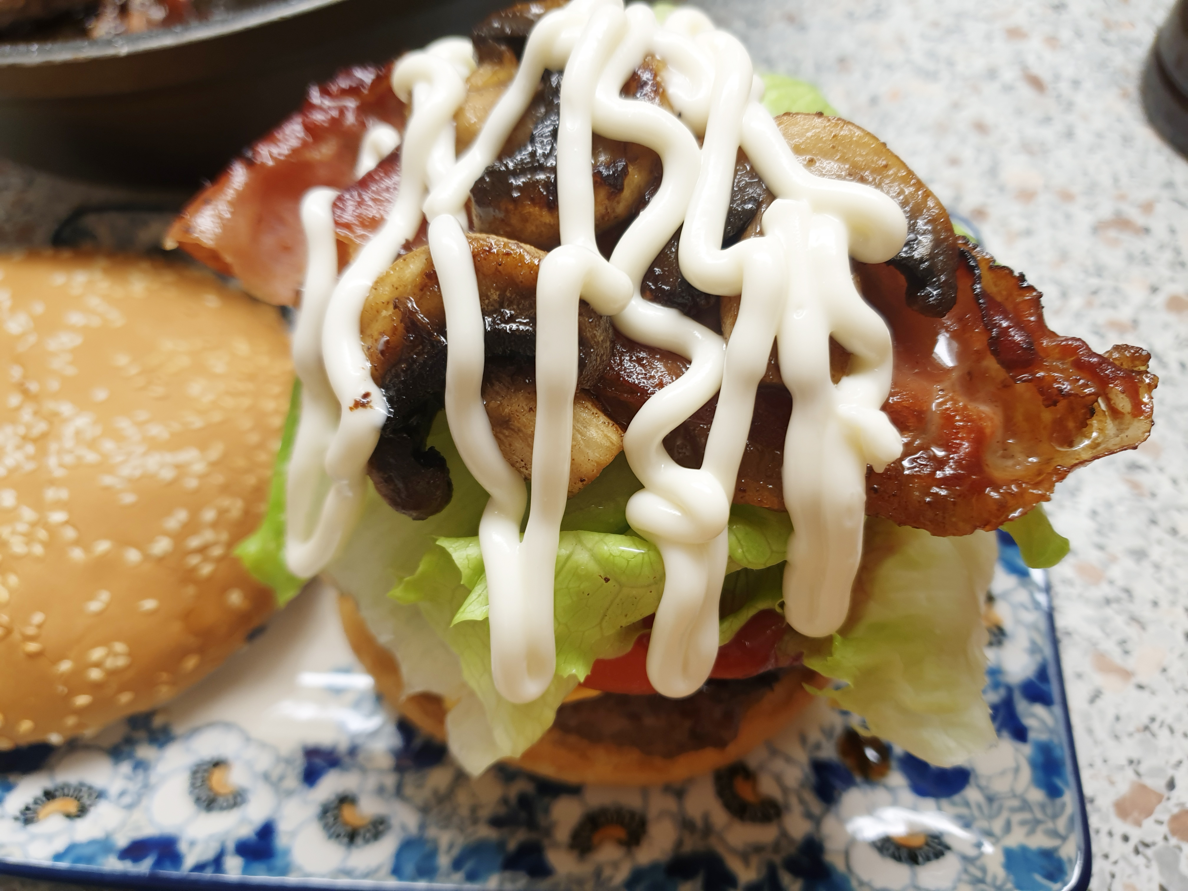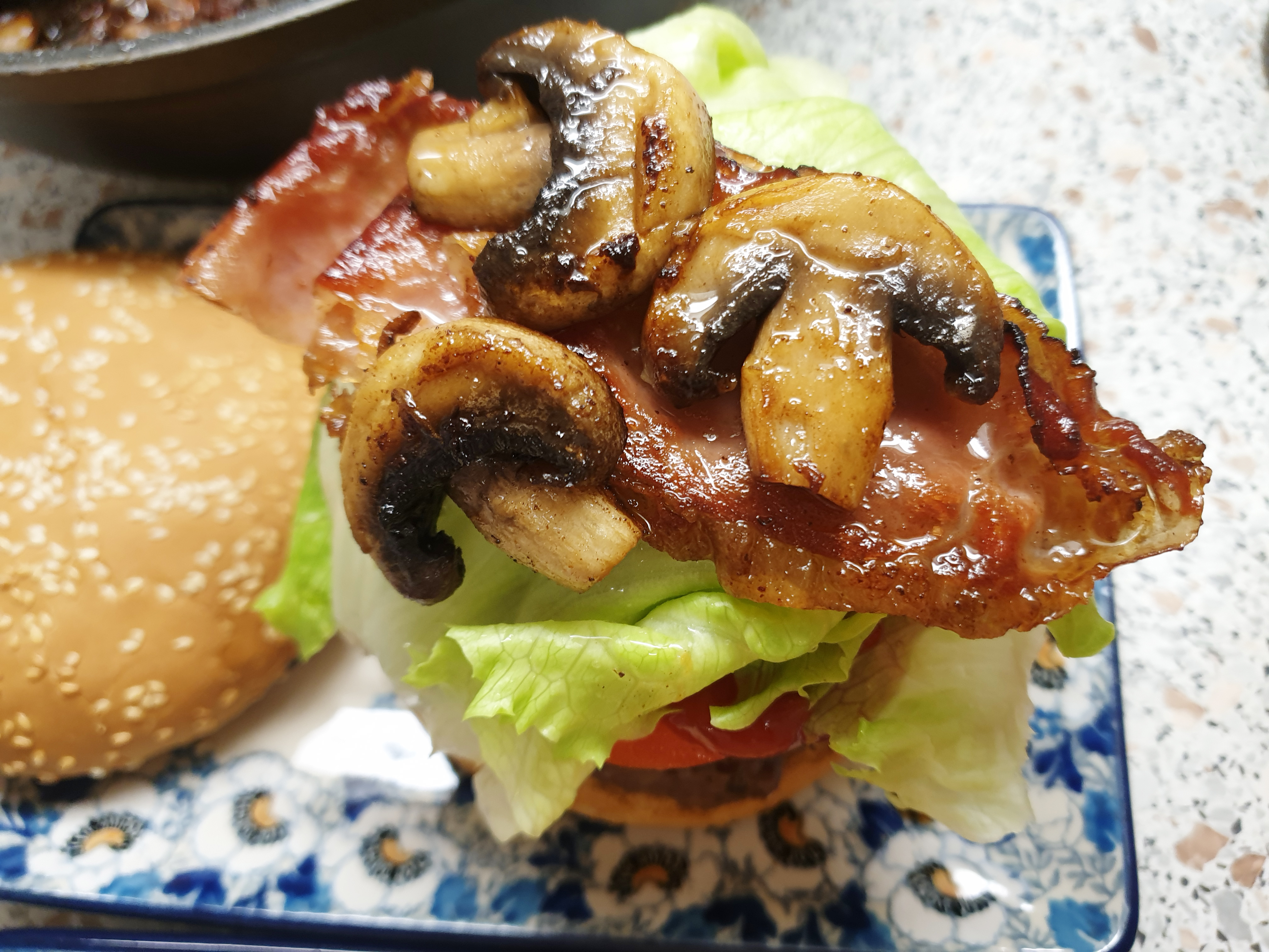 준비된 햄버거 패티와 베이컨은 후라이팬에 잘 구워 주고 햄버거 번은 살짝 바삭한 식감을 위해 에어프라이어에 2분 정도 구워주세요~ (프라이팬에도 가능해요!) 양송이버섯도 슬라이스 해서 구워주세요!