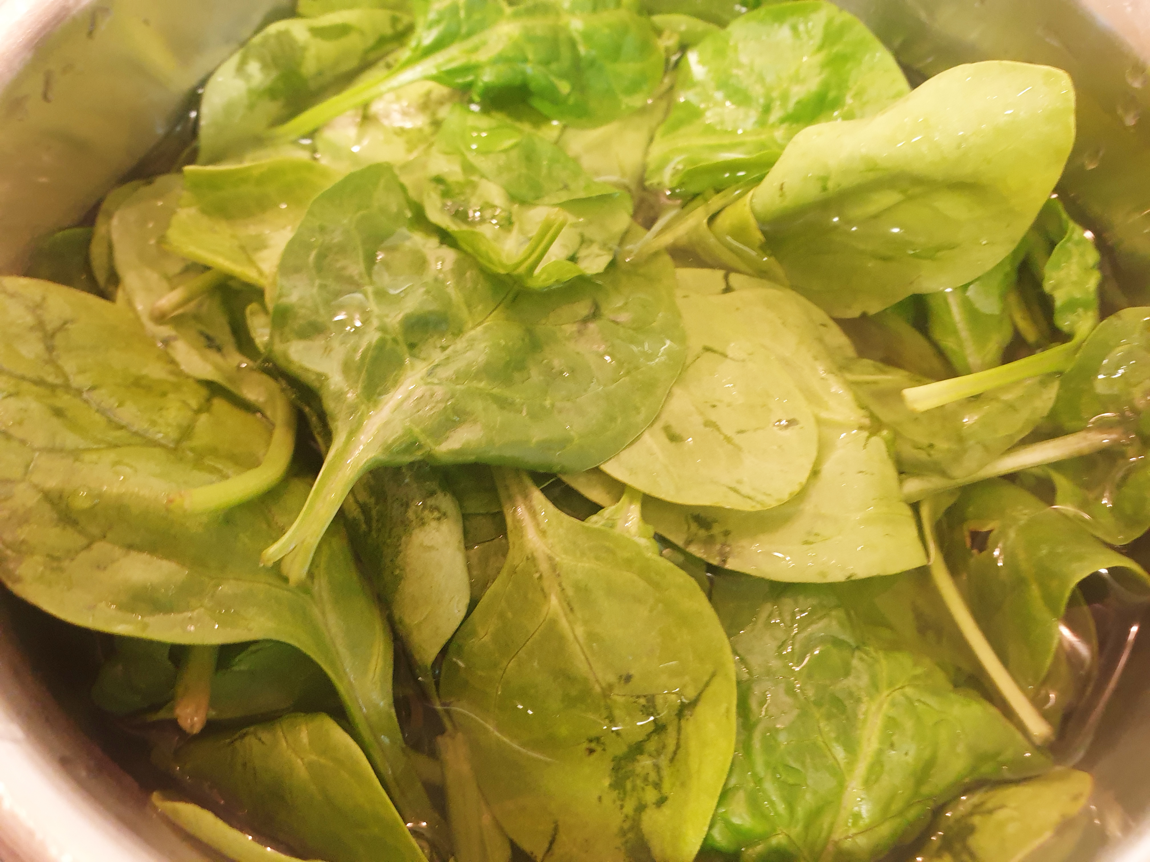 4. 시금치는 독일에 샐러드용 시금치 밖에 보지 못해서 시금치 100g 정도 끓는 물에 2분간 데쳐 찬물에 헹군 뒤 물기를 꼭 짜서 준비해줬습니다.
