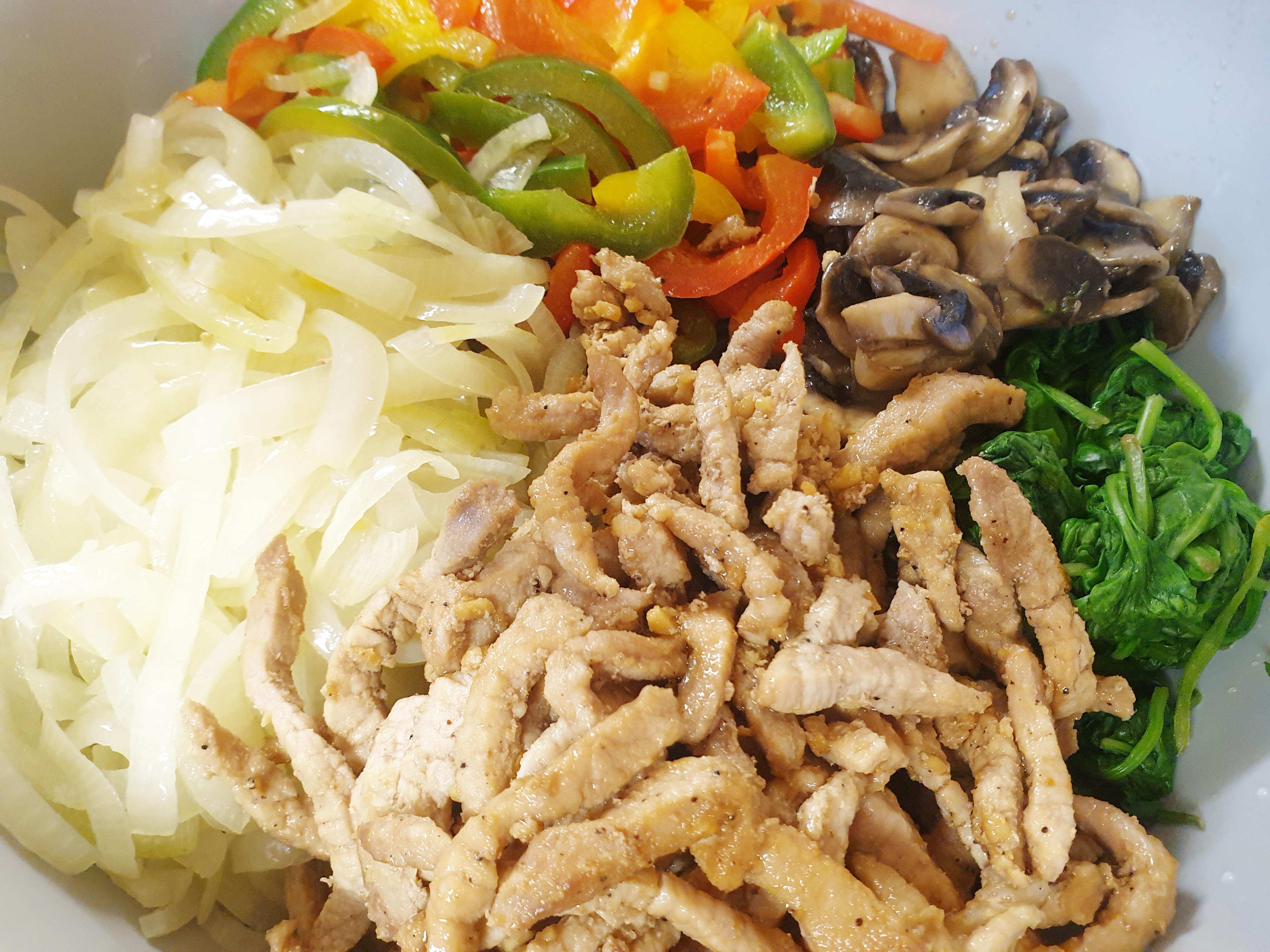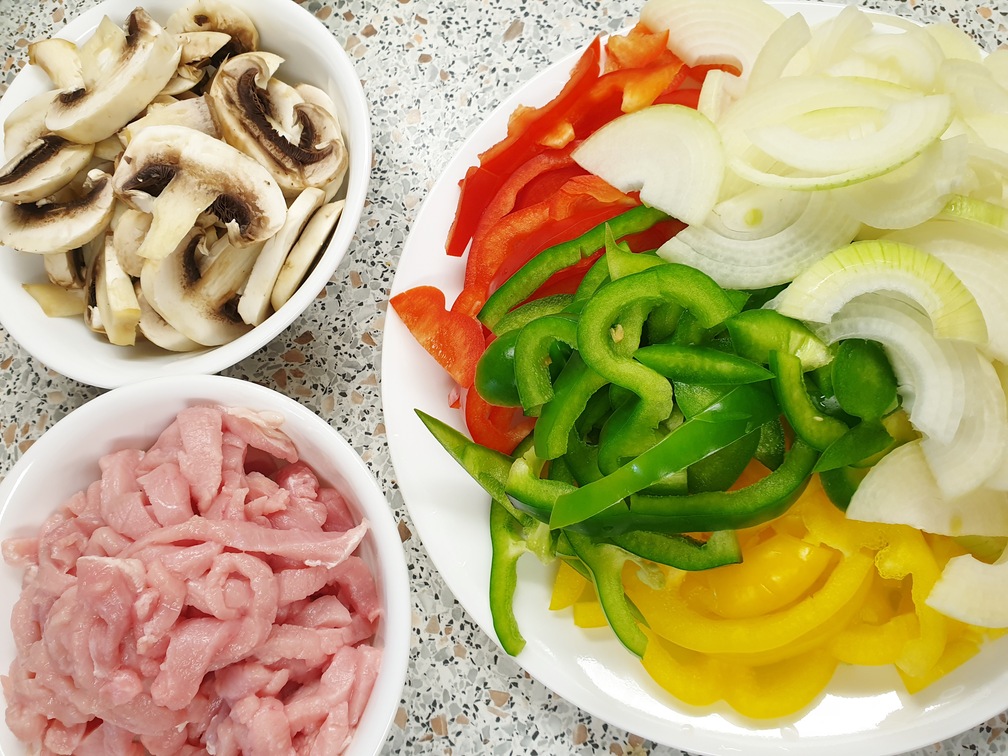필요한 재료: 당면 500g , 파프리카 (빨간, 노란, 초록 각 1개) , 시금치, 송이버섯 5개 , 돼지고기 등심 500g, 작은 양파 3개,