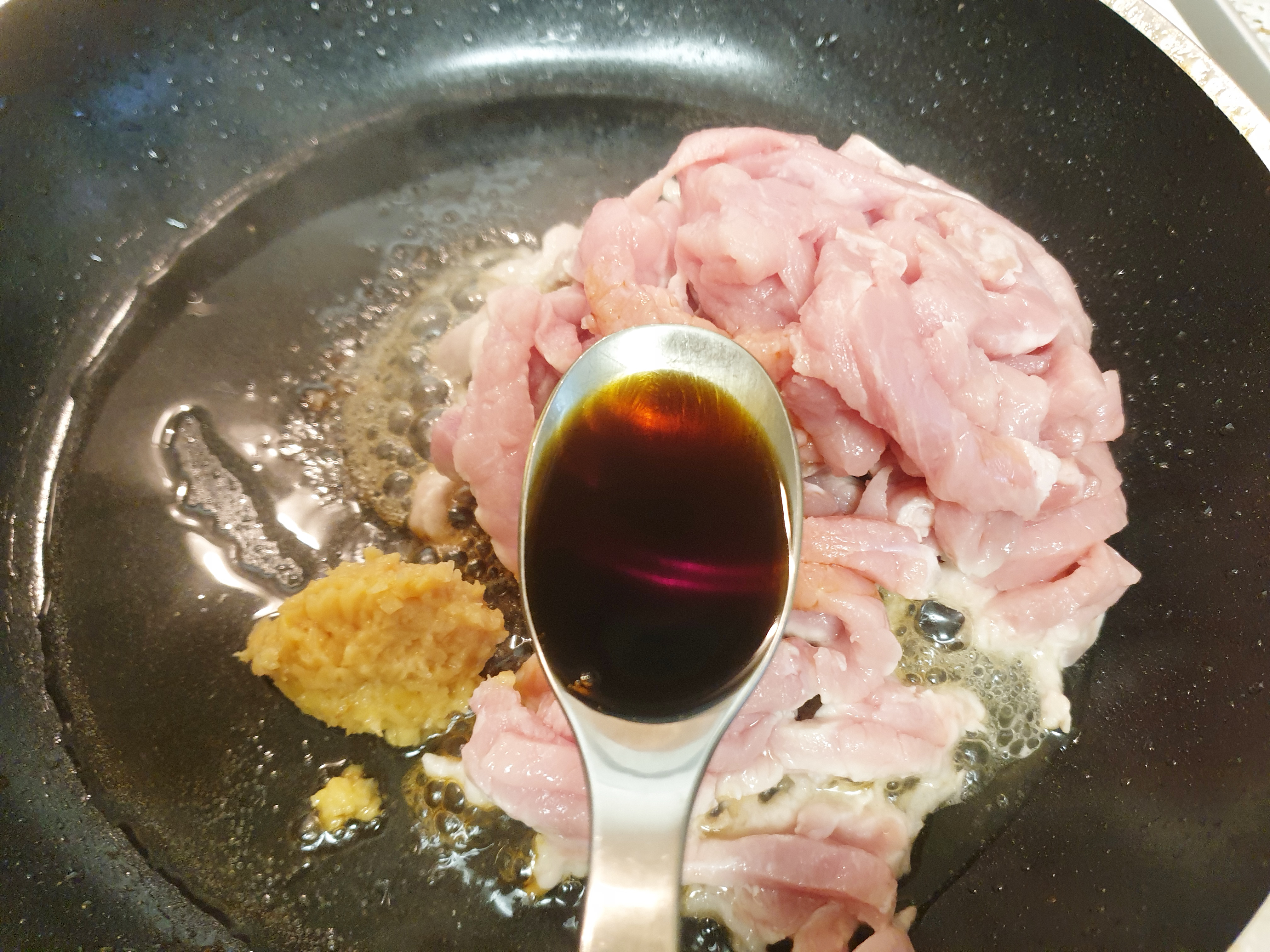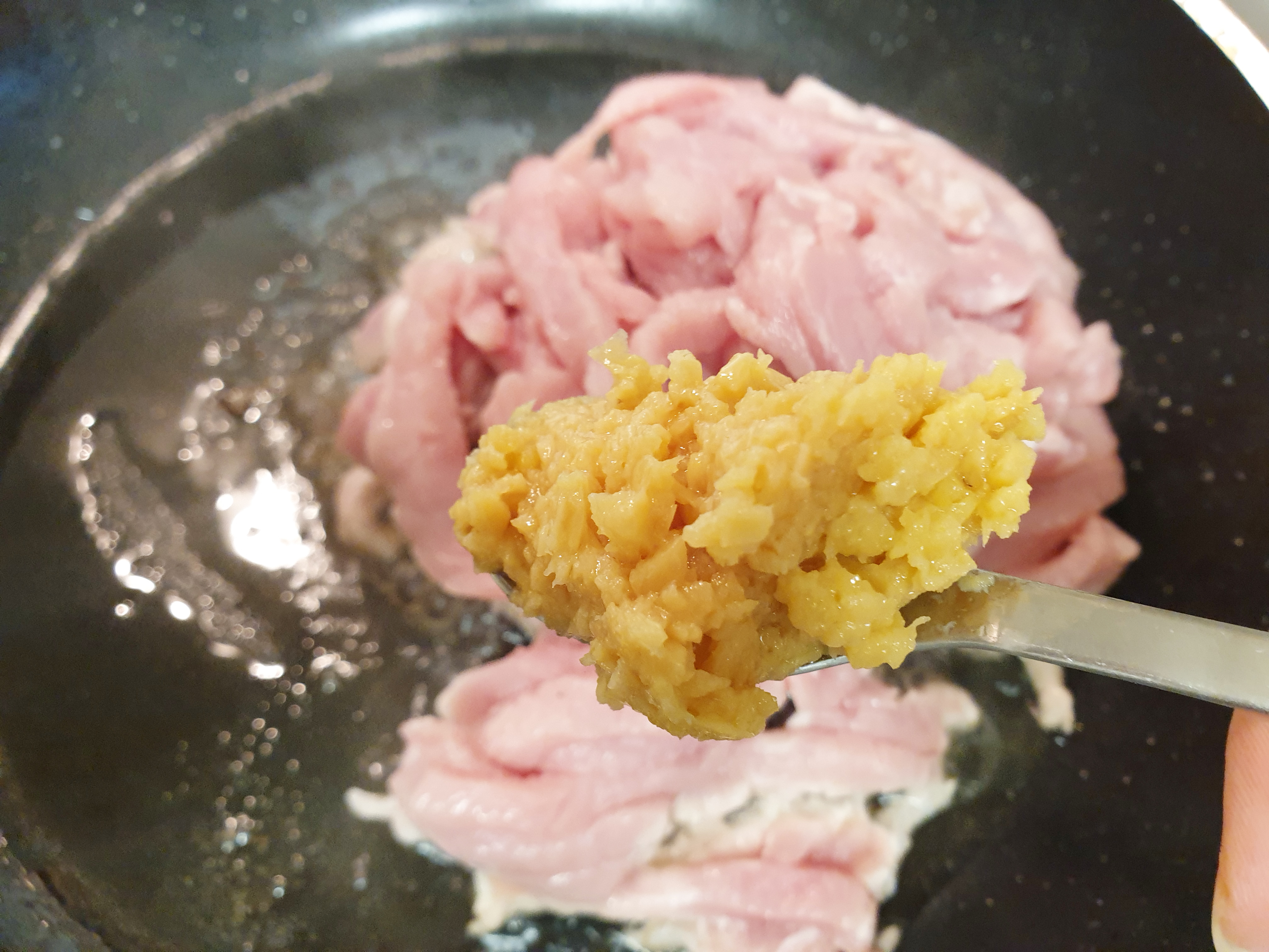 5. 돼지고기 등심(500g)을 볶을 때는 양념을 해줘야 하는데 마찬가지로 중불에 둔 뒤 프라이팬에 기름을 두르고 다진 마늘 1큰술, 간장 1스푼, 을 넣고 완전히 익을 때까지 볶아주세요!
