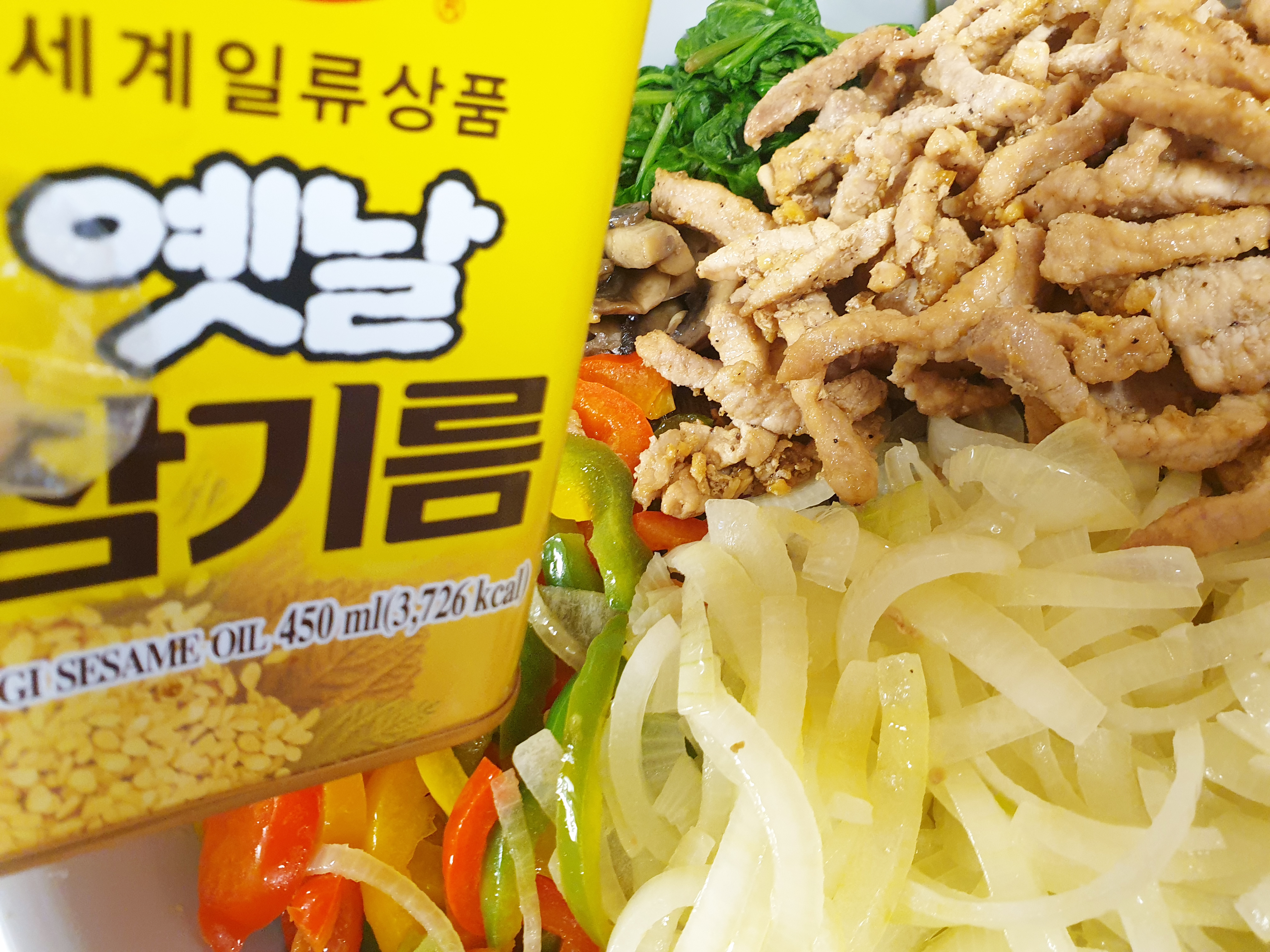 8. 당면과 재료를 통에 옮겨 담에 참기름이나 들기름을 두른 후 잘 버무려 줍니다. 저한텐 간이 딱 맞아 간을 따로 하지 않았지만 간이 심심하다면 간장이나 설탕을 넣어 간을 맞춰 주세요!