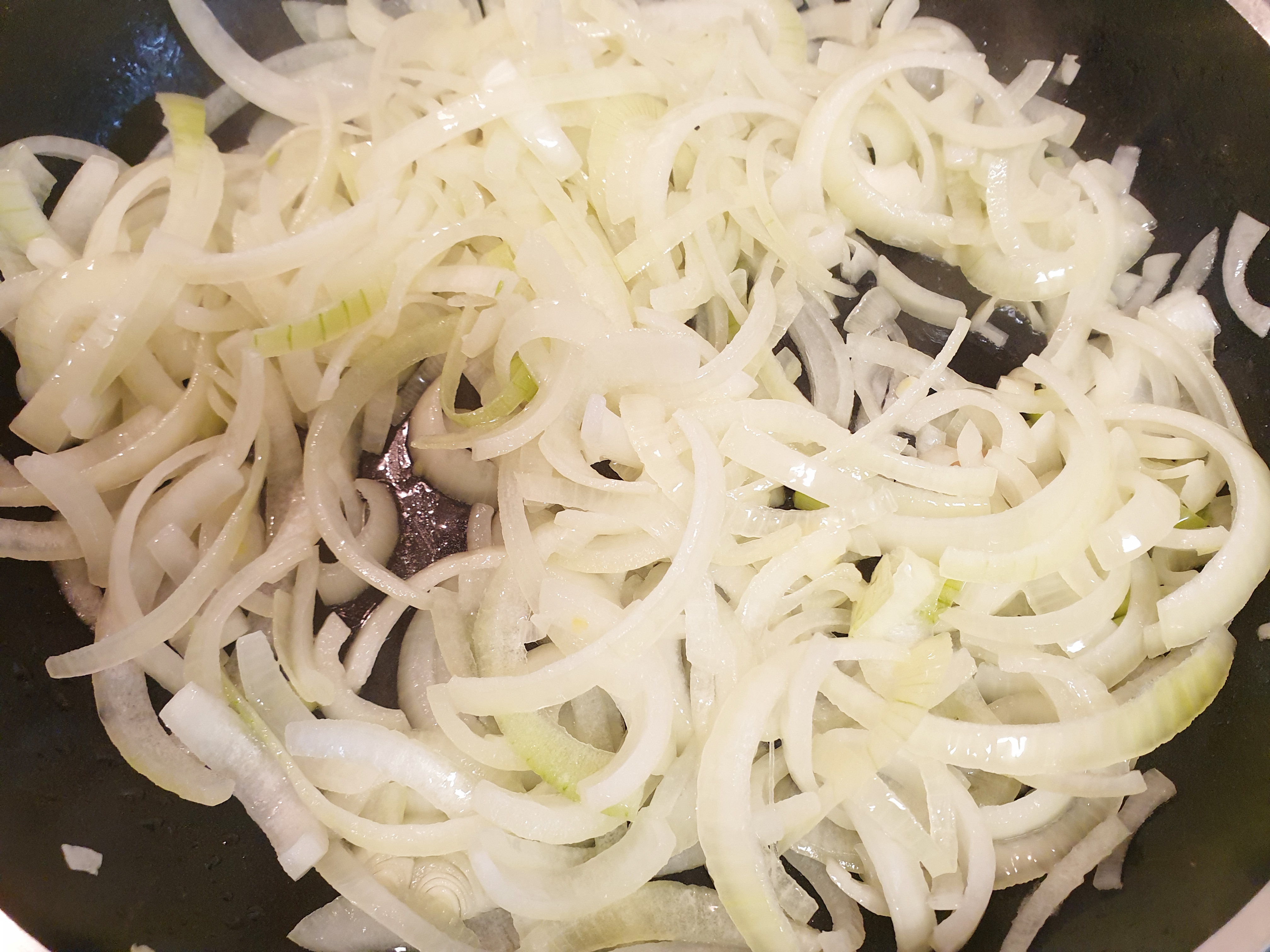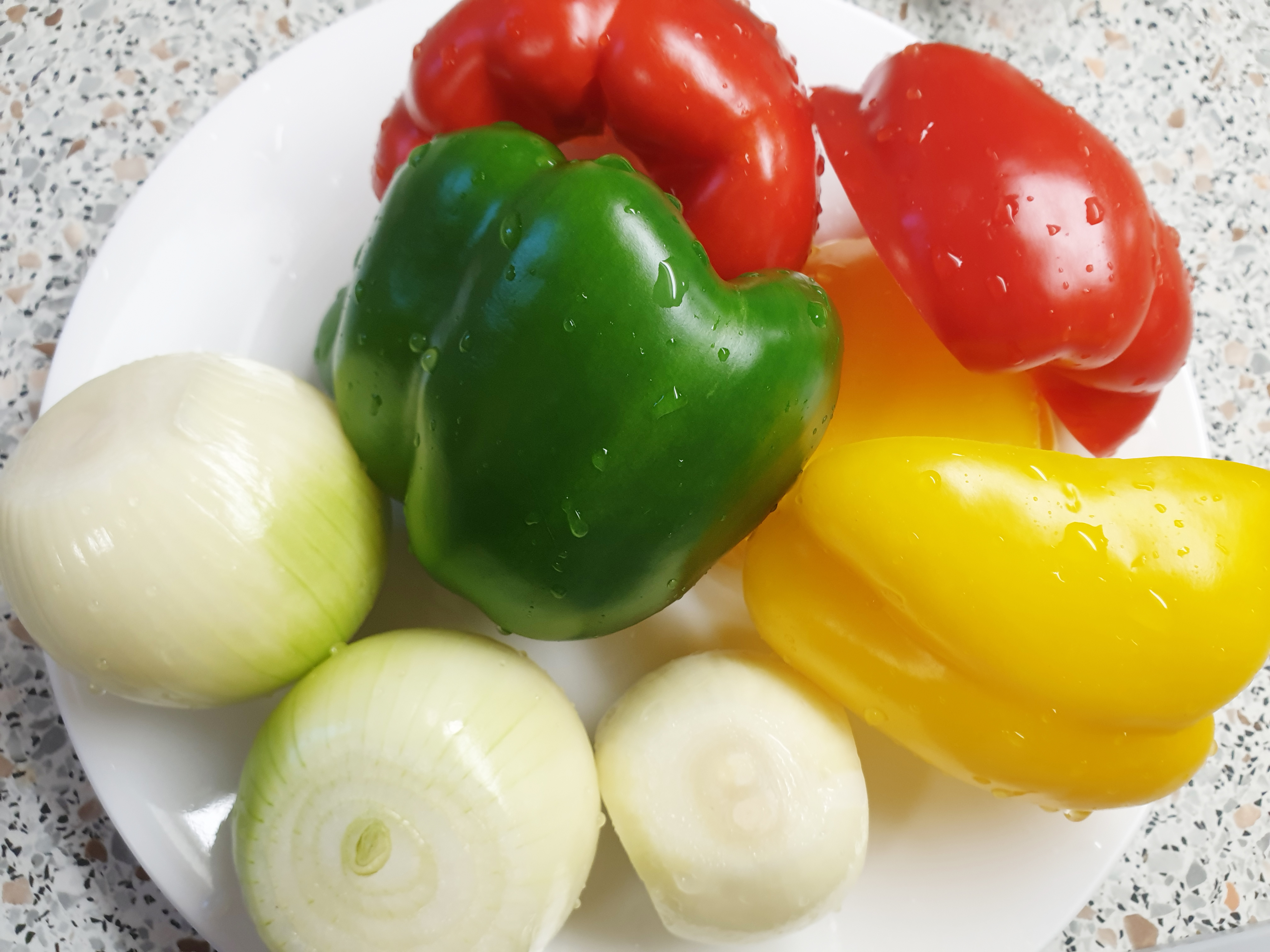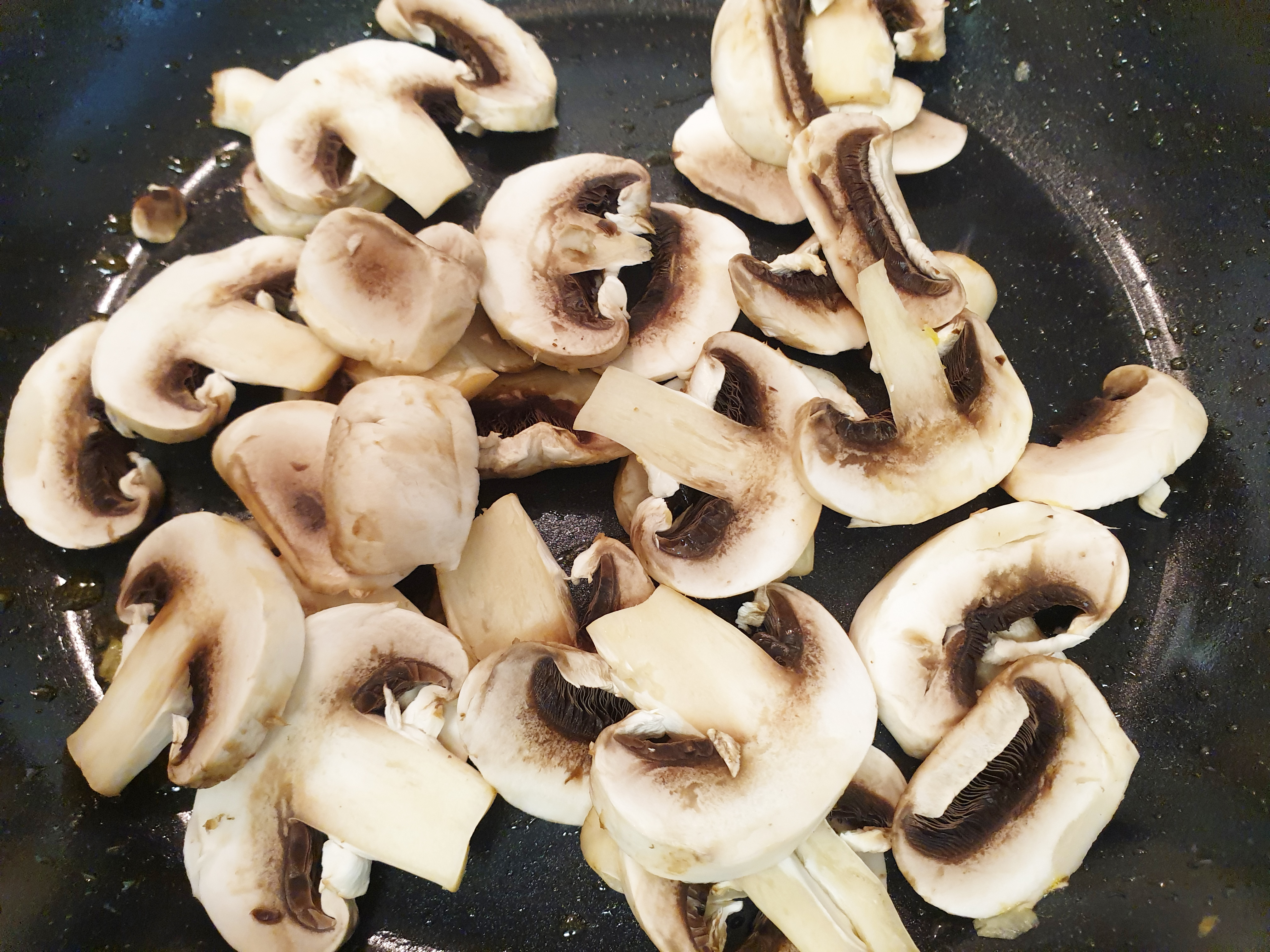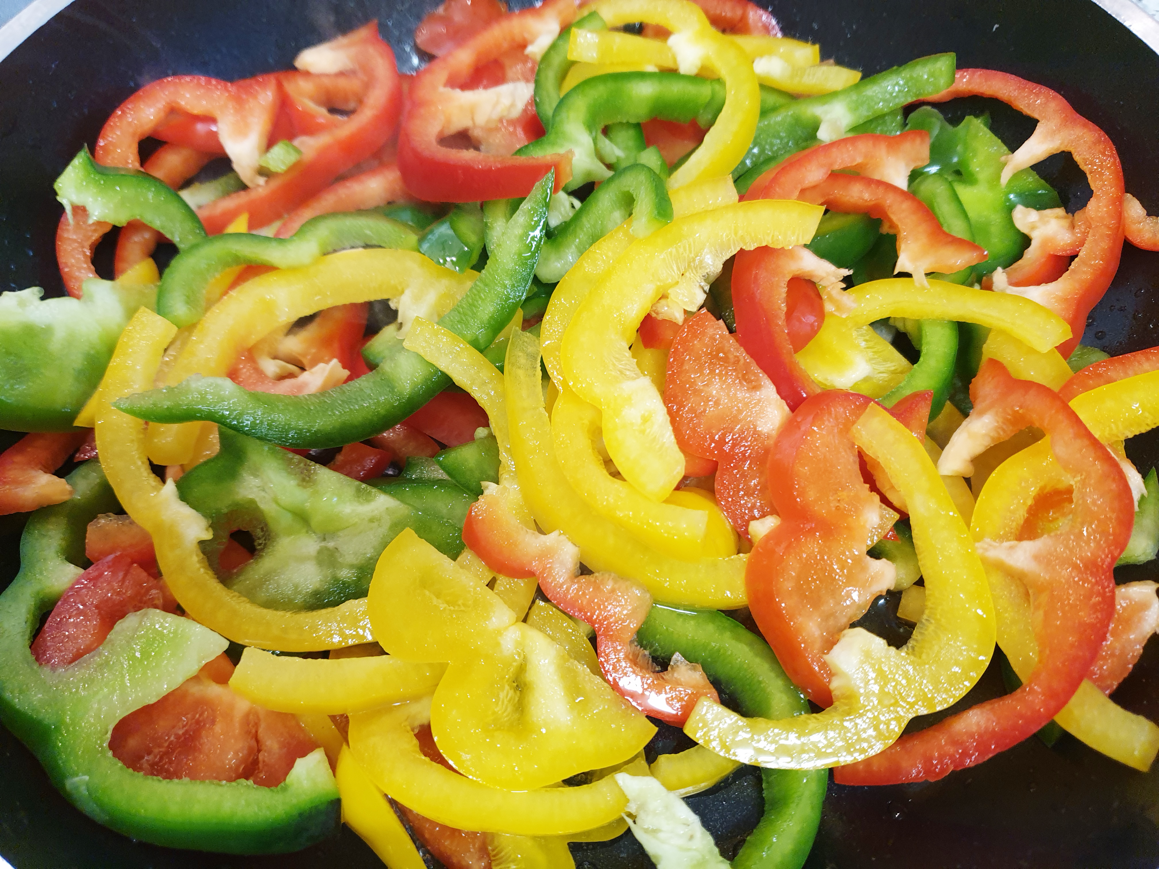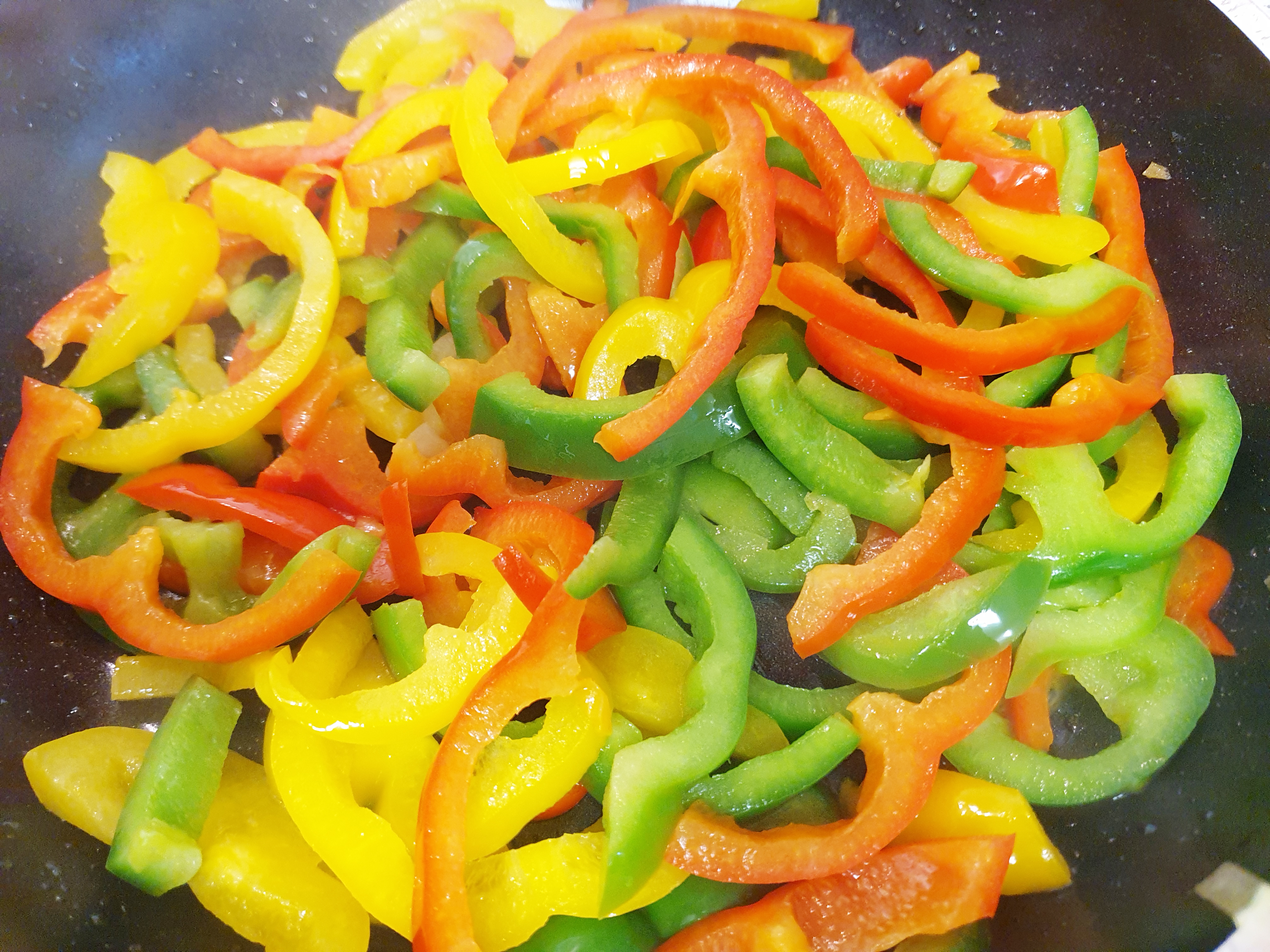3. 이제 야채를 볶아 줄 차례인데 불은 중불에 둔 뒤 프라이팬에 식용유를 두르고 달궈지면 양파를 넣고 3분 동안 볶고, 그다음 파프리카를 넣어 4분 동안 볶고, 마지막으로 버섯을 넣어 2분 동안 볶아 주세요! 파프리카는 아삭한 맛이 남아있도록 오래 볶지 마세요!