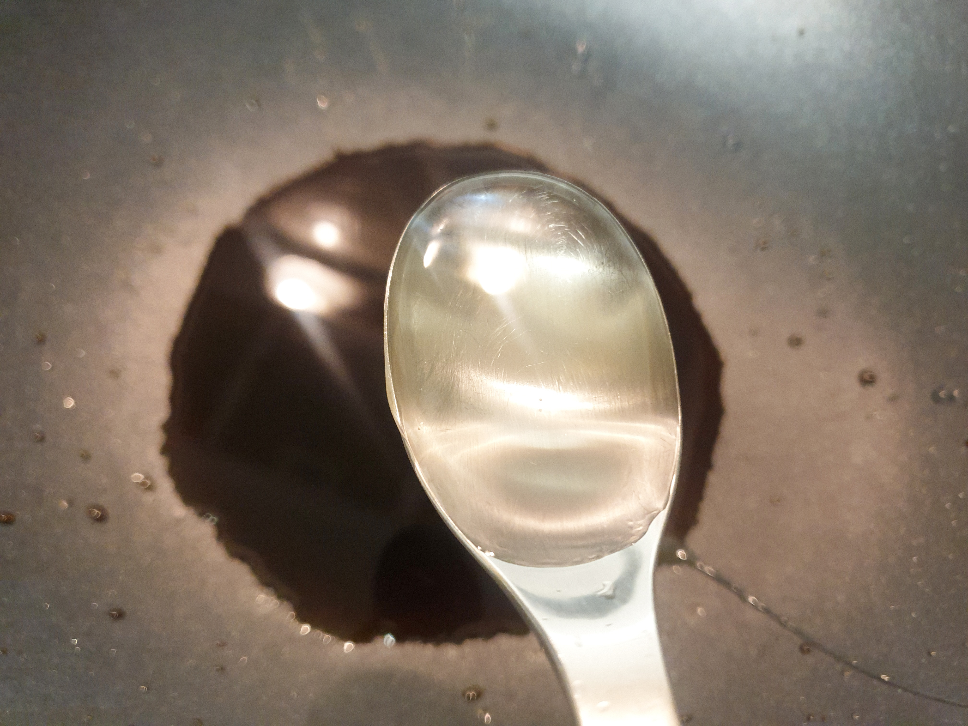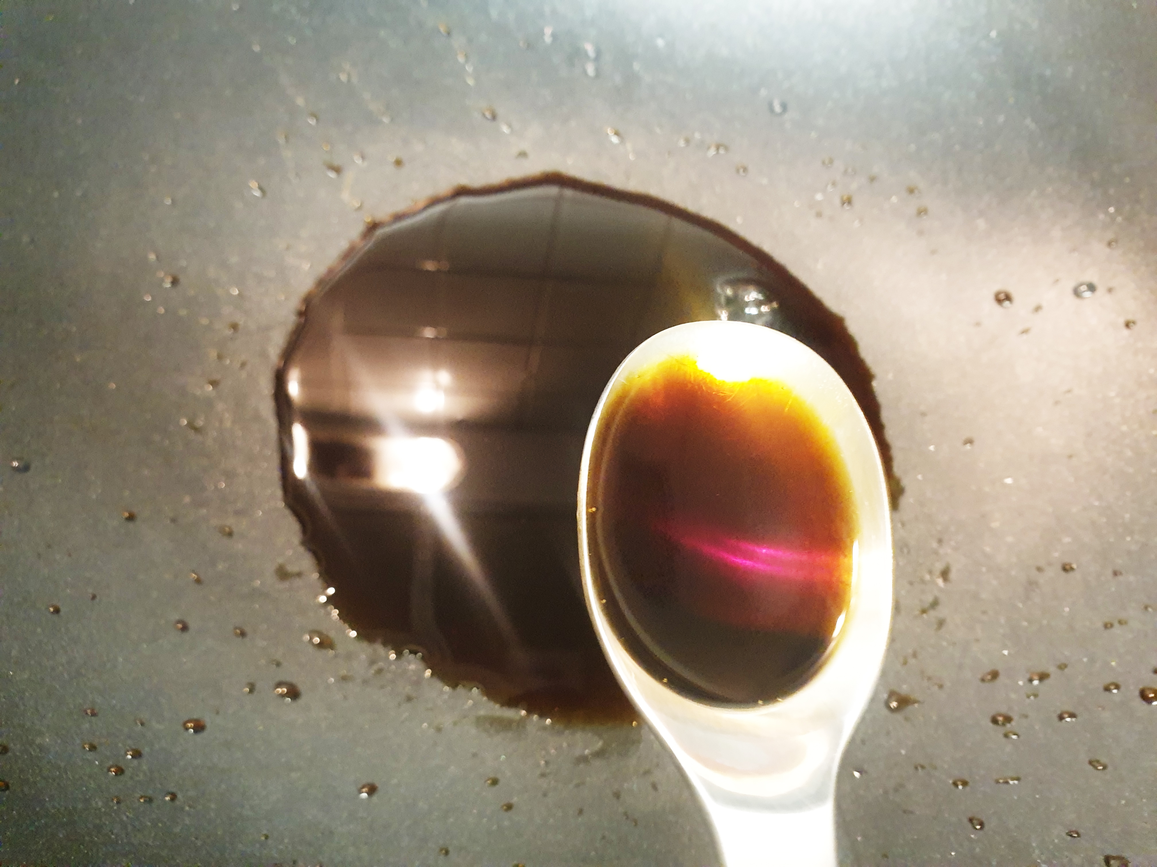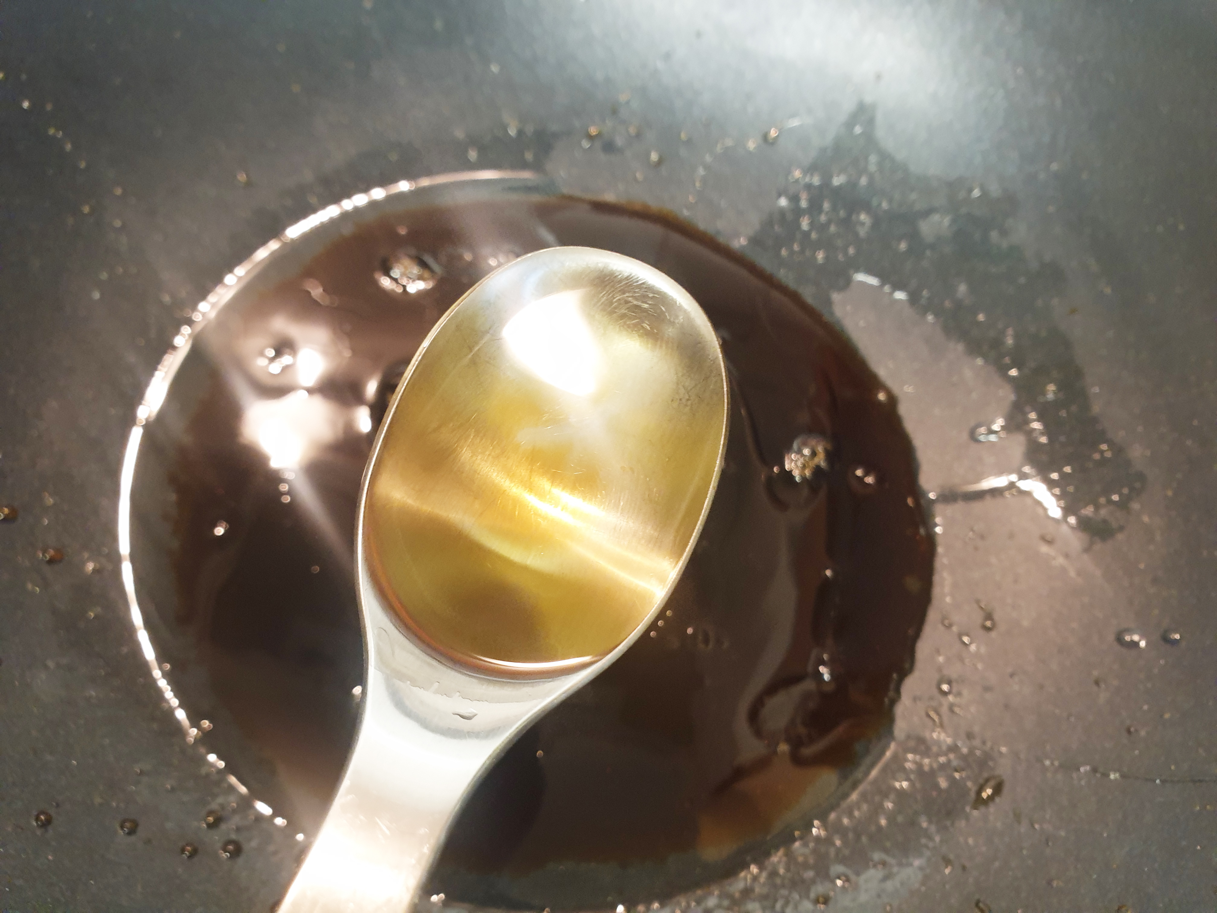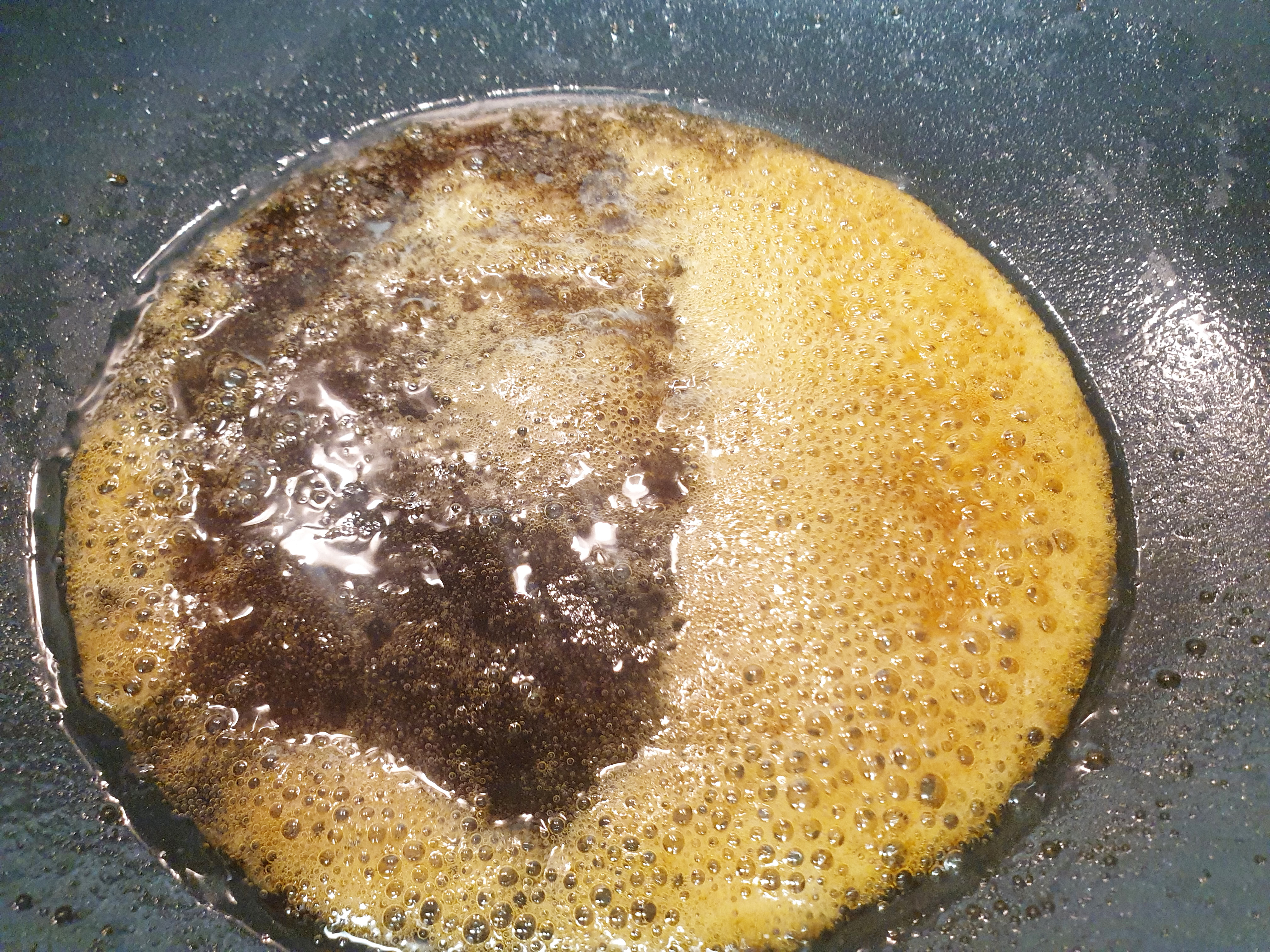 7. 당면 양념을 할 차례! 웍에 진간장 11스푼, 물엿 11스푼, 식용유 3스푼을 넣은 뒤 중불에 두고 양념이 보글보글 끓기 시작하면 당면을 넣어 당면에 양념이 잘 베도록 5분간 볶아주세요~!