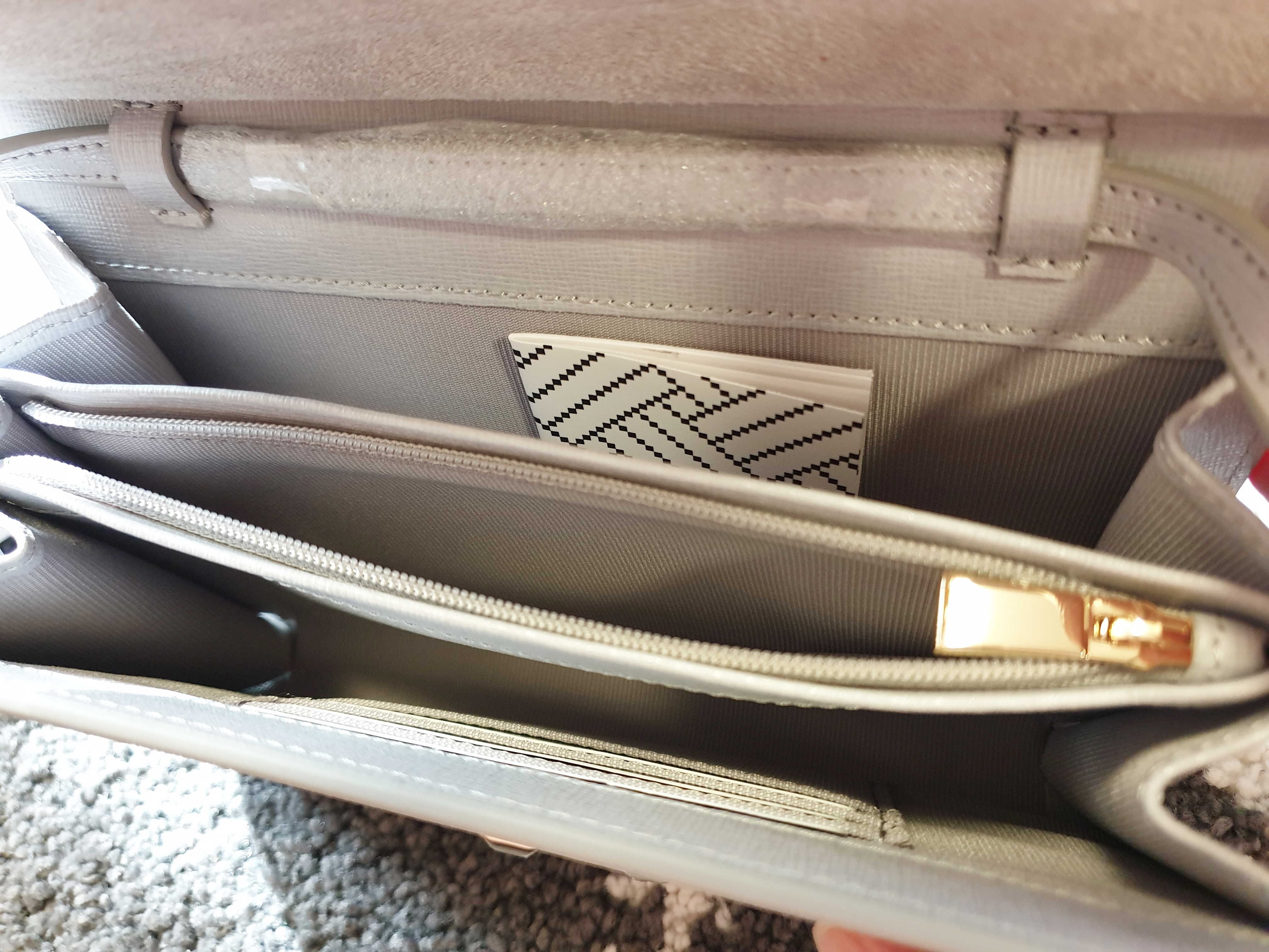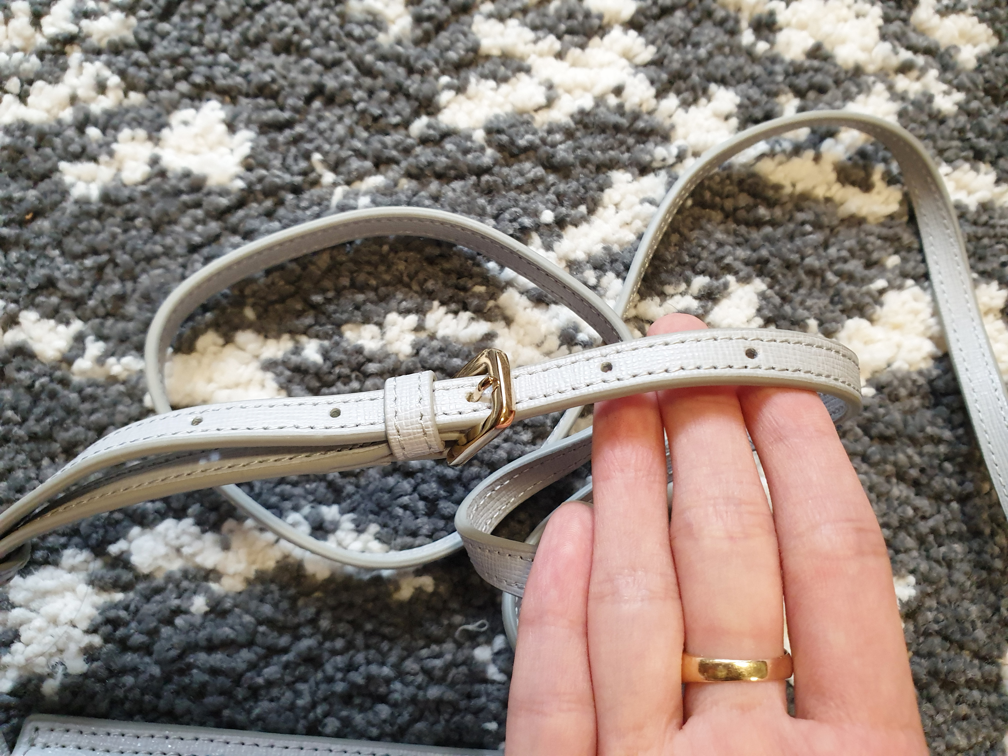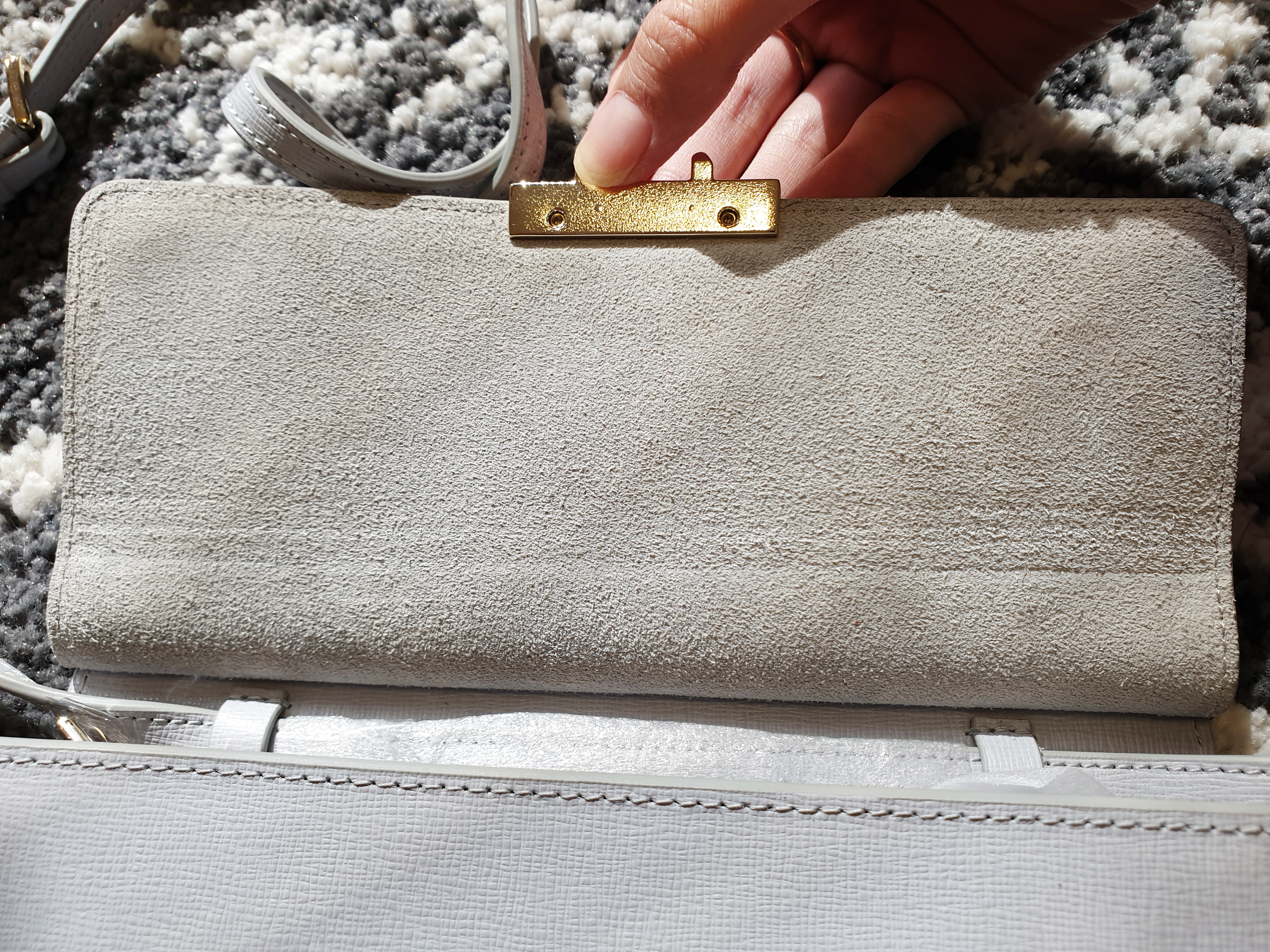 전체 적으로 연회색이었다면 너무 심플했겠지만 버클이 금색으로 되어있어 심플하면서도 고급스러움을 한층 더 했고 가방을 여는 방법은 버클 장식을 양쪽으로 누르면 열리는 방식으로 되어있어요~!