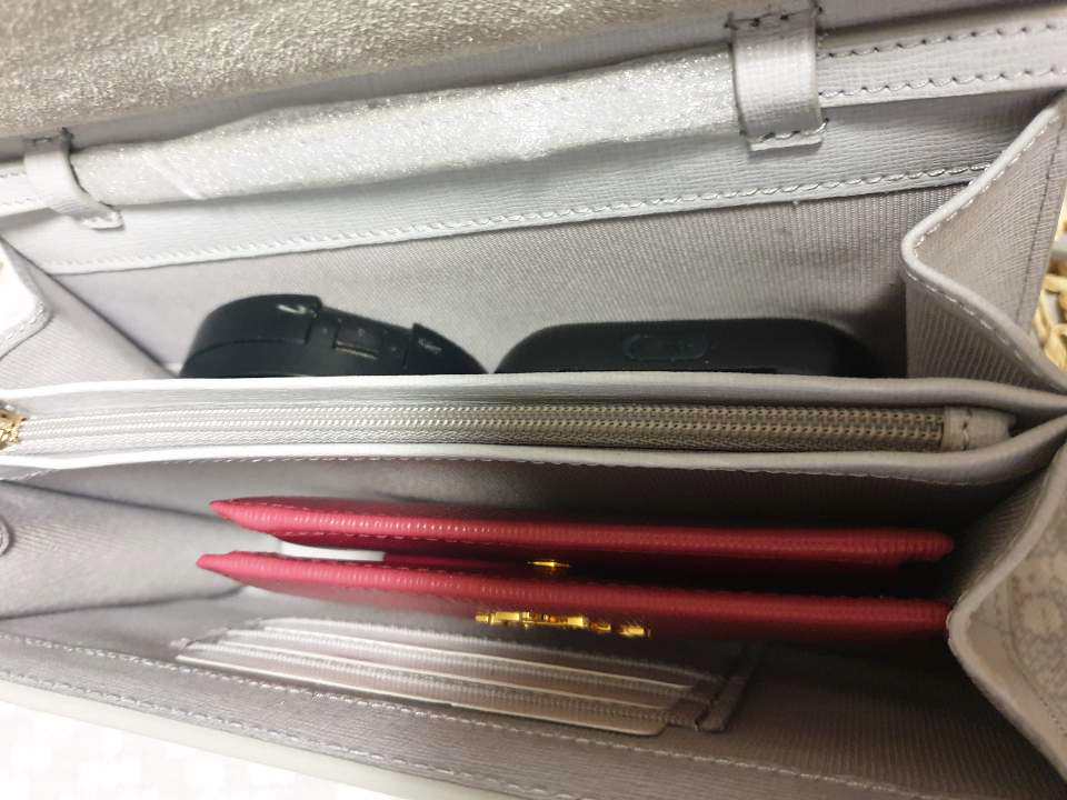 포켓이 있어 지갑을 굳이 안 들고 다녀도 되지만 가방 공간이 많이 작진 않아 반지갑, 파우더, 이어폰 케이스, 립스틱 정도는 충분히 들어갈 공간이 됩니다.