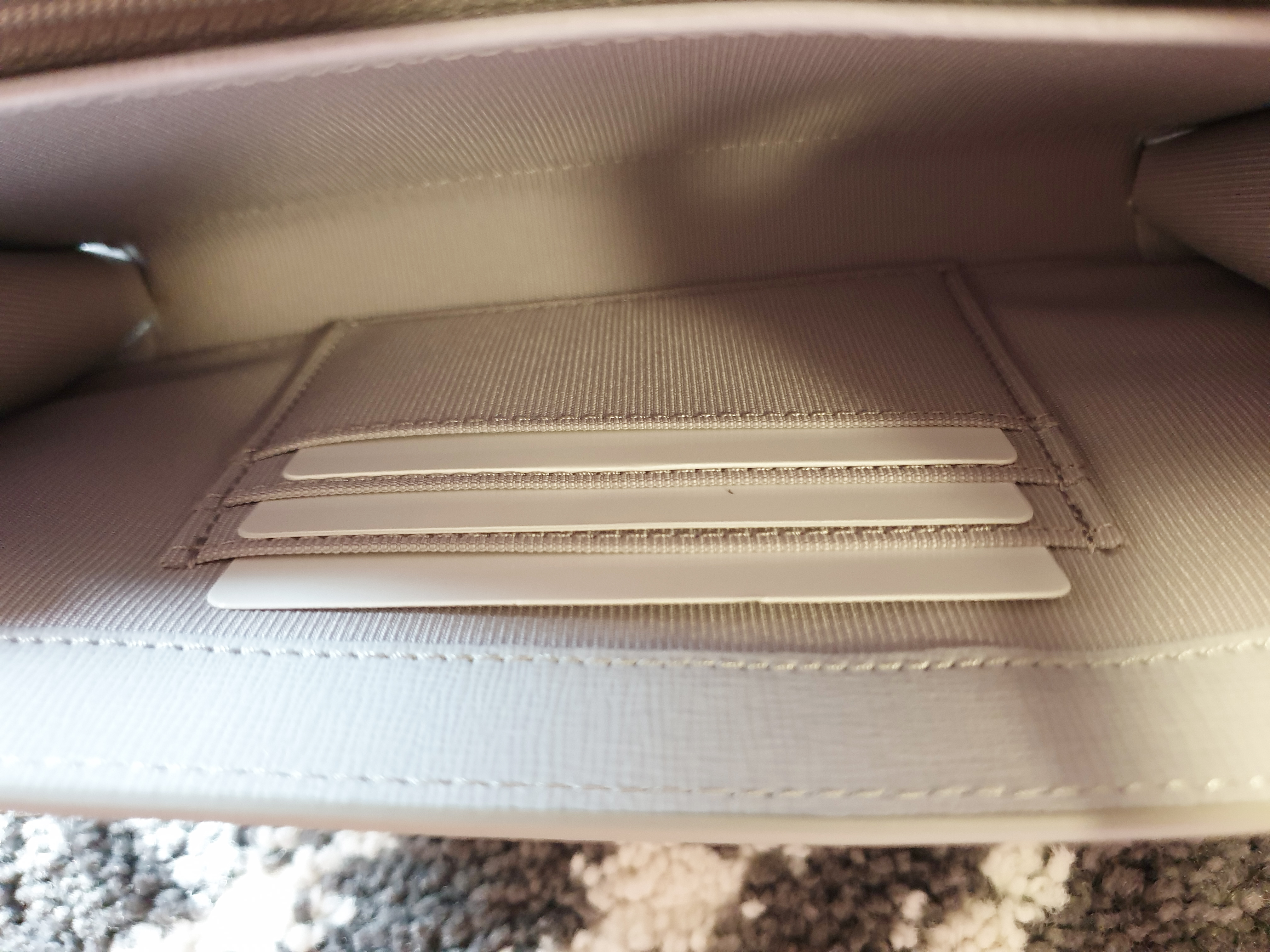 가방 안 쪽은 카드 포켓 3개 , 지퍼 포켓 1개가 있고 지퍼 포켓은 지폐가 충분히 들어갈만한 사이즈예요!