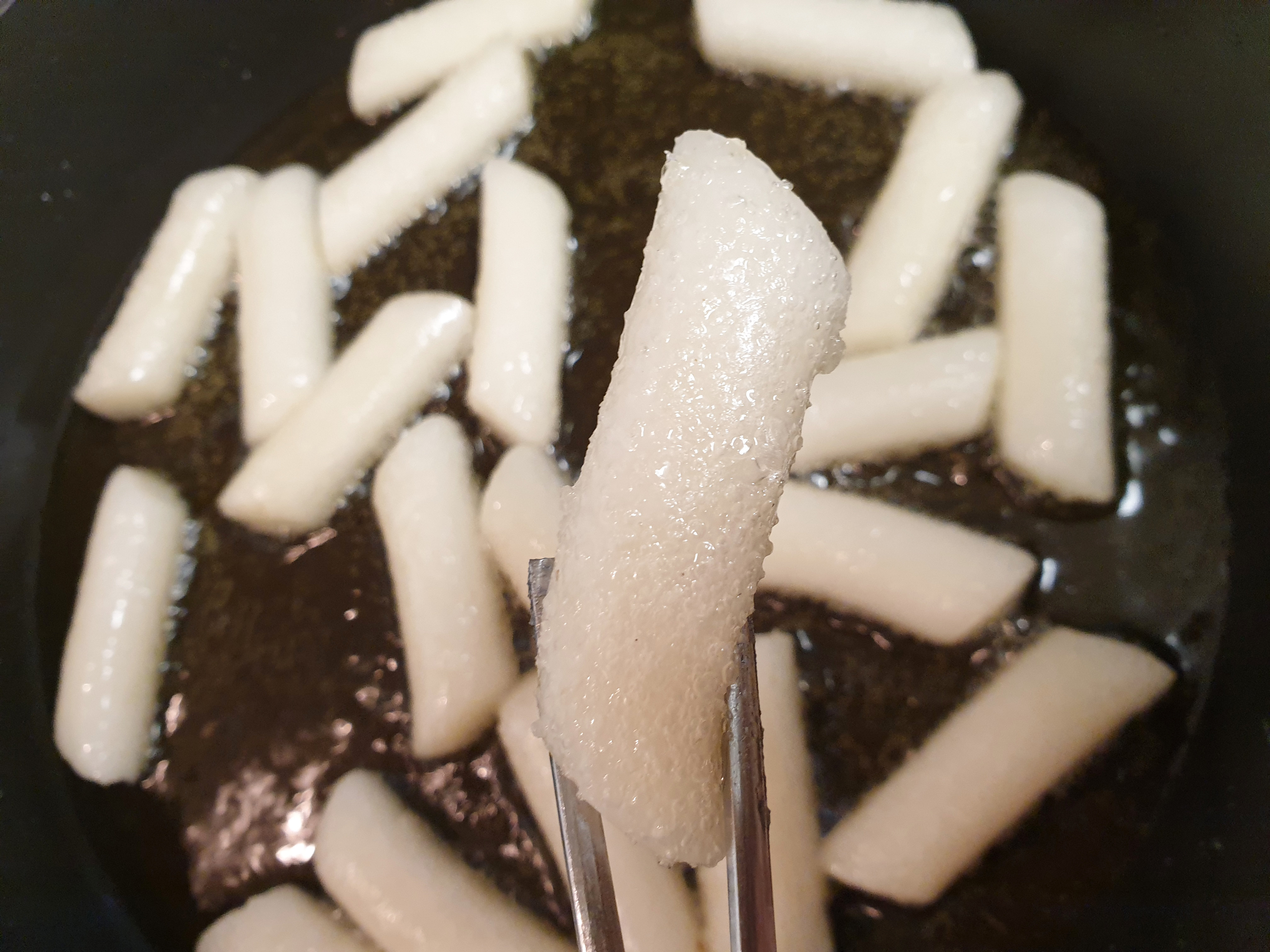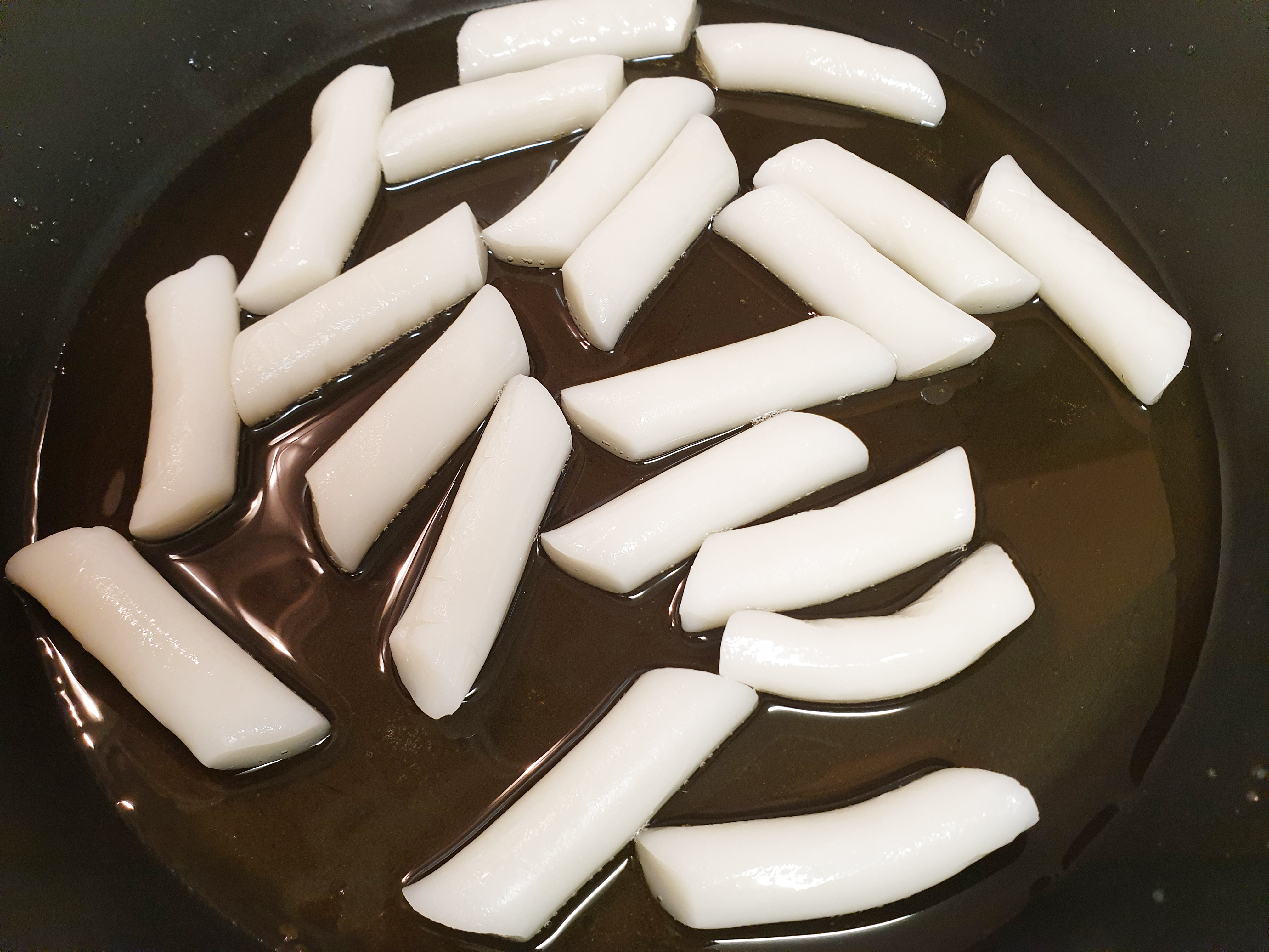 불은 중불과 약불에 맞춰 주고 기름이 달궈지면 준비해둔 밀떡 또는 쌀떡을 넣어 앞 2분 뒤 2분씩 튀겨주세요! 너무 오래 튀기면 떡이 딱딱해져요!