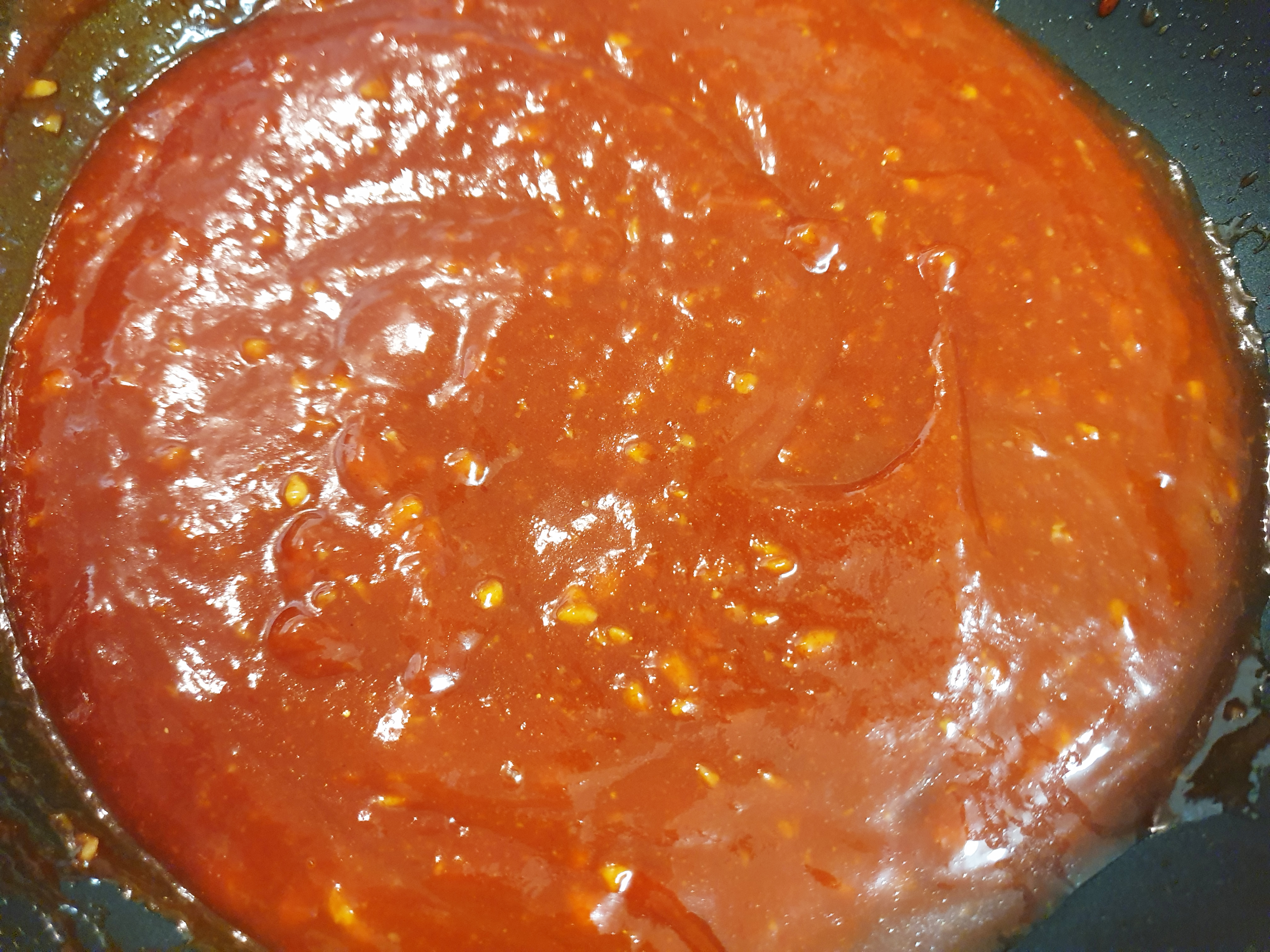떡꼬치 소스 만들기 황금 비율을 알려드릴게요! 먼저 팬을 준비를 하고 약불과 중불 사이에 맞춘 후 고추장 1스푼, 케첩 3 스푼, 설탕 3스푼, 간장 1스푼, 물 2스푼, 다진 마늘 1스푼을 넣고 설탕이 완전 녹을 때까지 저어줍니다. 저는 양념치킨도 만들려고 고추장 3, 케첩 9, 설탕 9, 간장 3, 물 6, 다진 마늘 3스푼을 넣고 양을 넉넉히 만들었습니다.