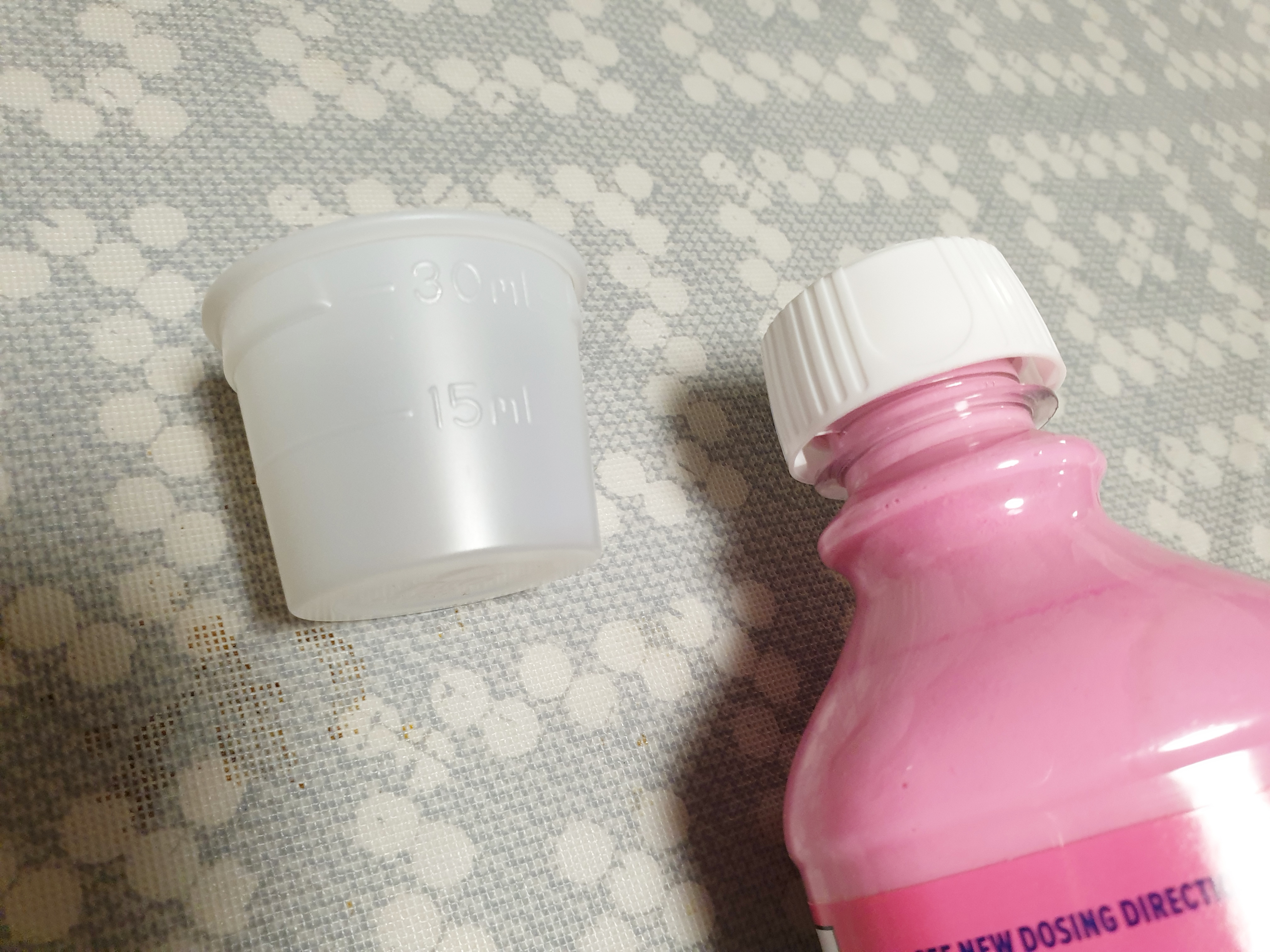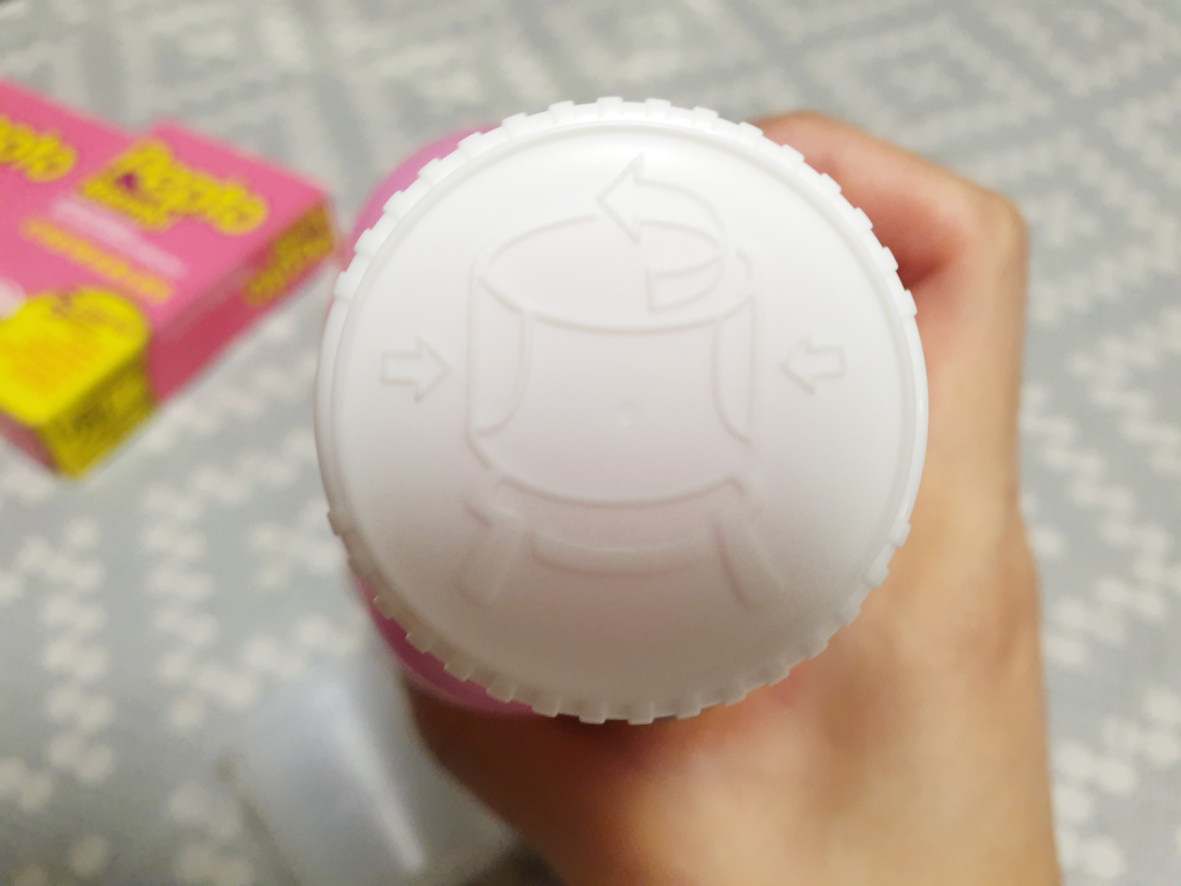 실링을 벗기면 이렇게 작은 계량컵을 볼 수 있어요~ 그리고 마개는 양쪽을 눌러서 열어주면 됩니다.