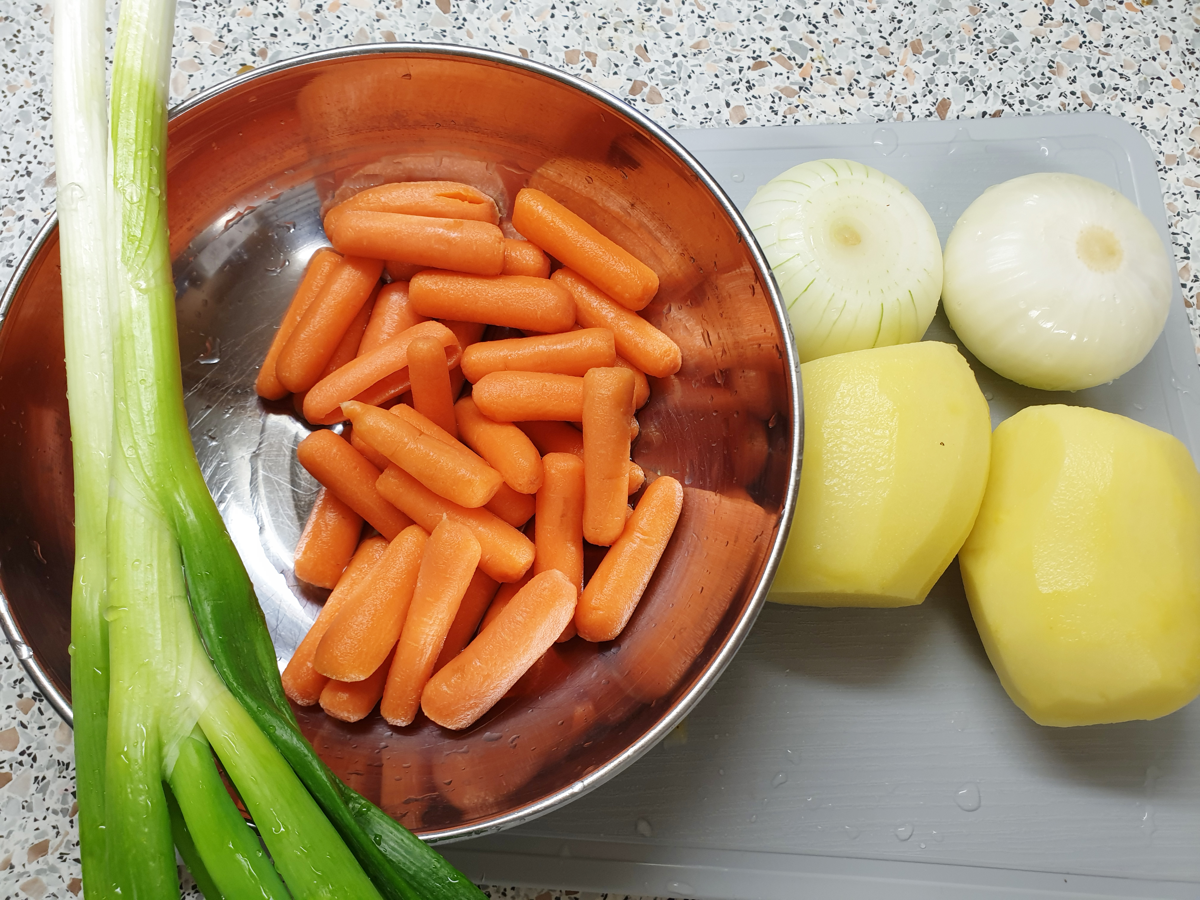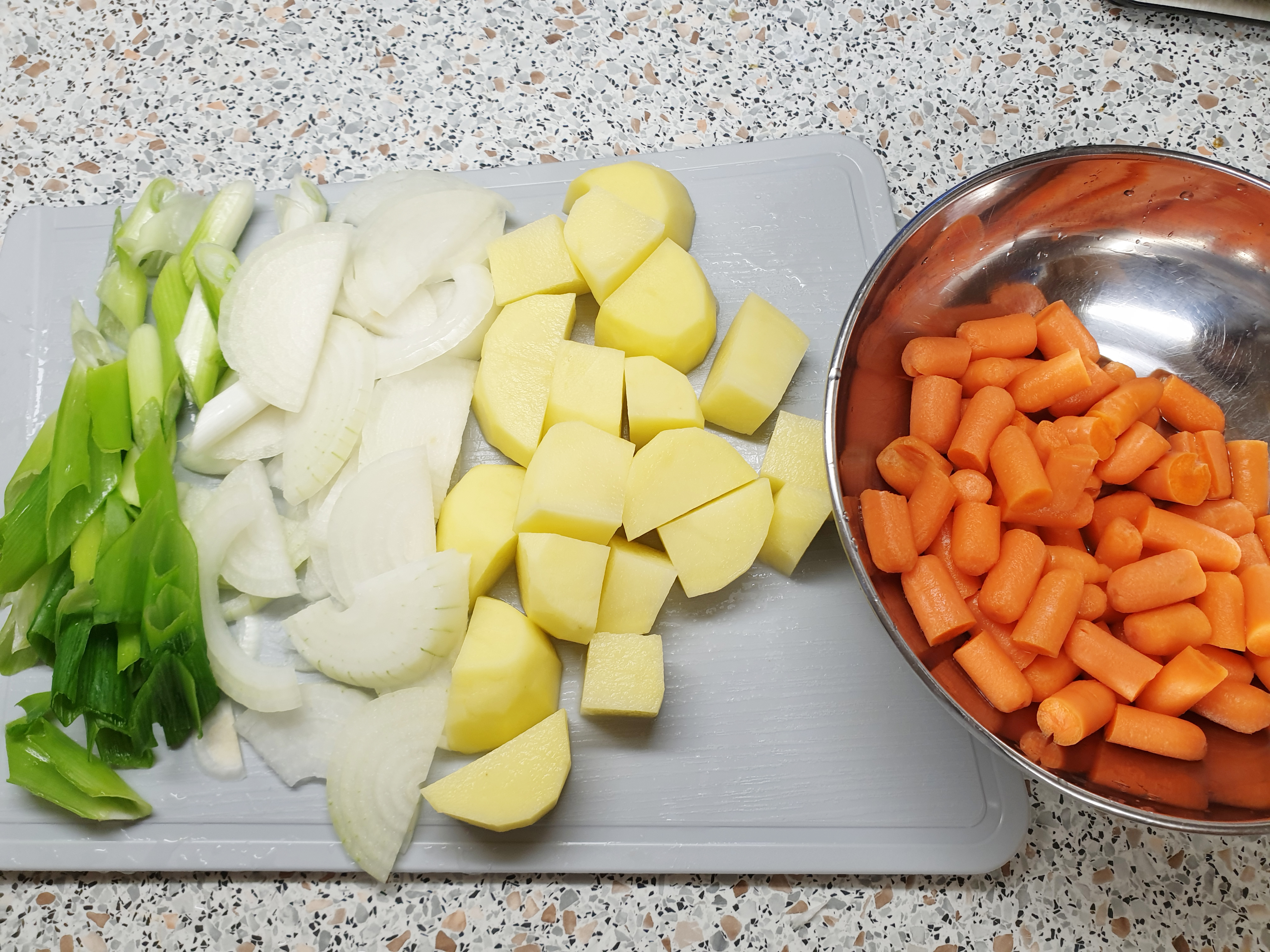 2. 파 2대는 큼지막하게 썰어주고 양파 1개는 채를 썰고 감자 2개는 크게 깍둑썰기를 해주고( 조리하는 동안 부서지지 않도록) 당근 2분의 1은 작은 깍둑썰기를 해줍니다.