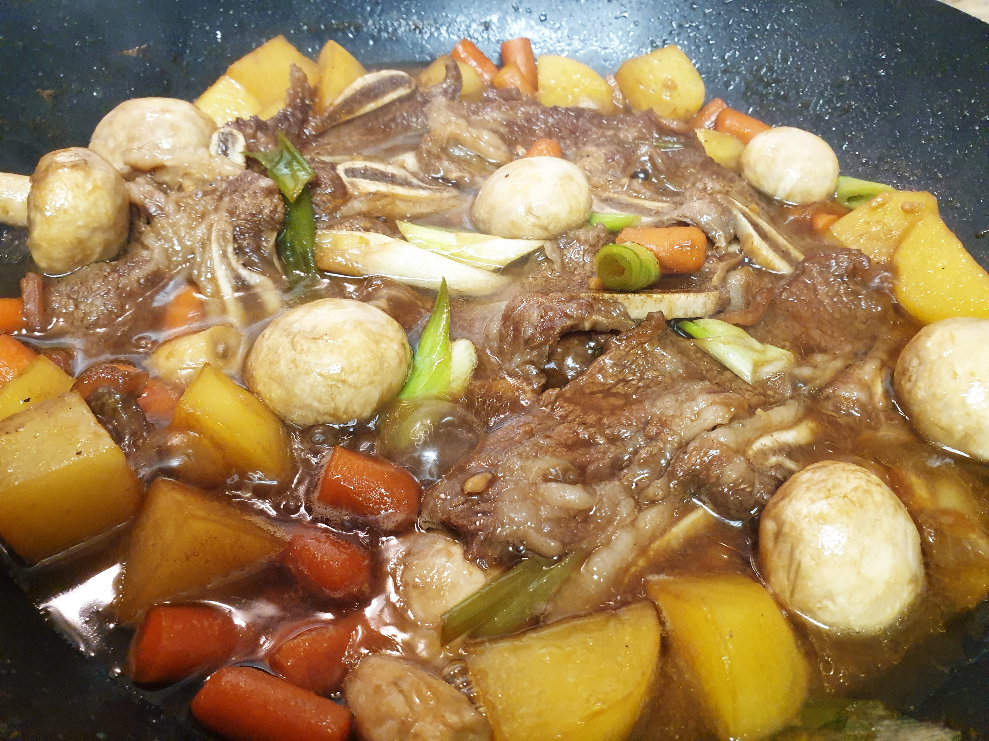 6. 고기가 완전히 익고 감자가 거의 다 익어 간다면 준비해둔 대파와 양송이버섯을 넣고 불을 줄인 뒤 재료가 완전히 익을 때까지 조리해주면 끝!
