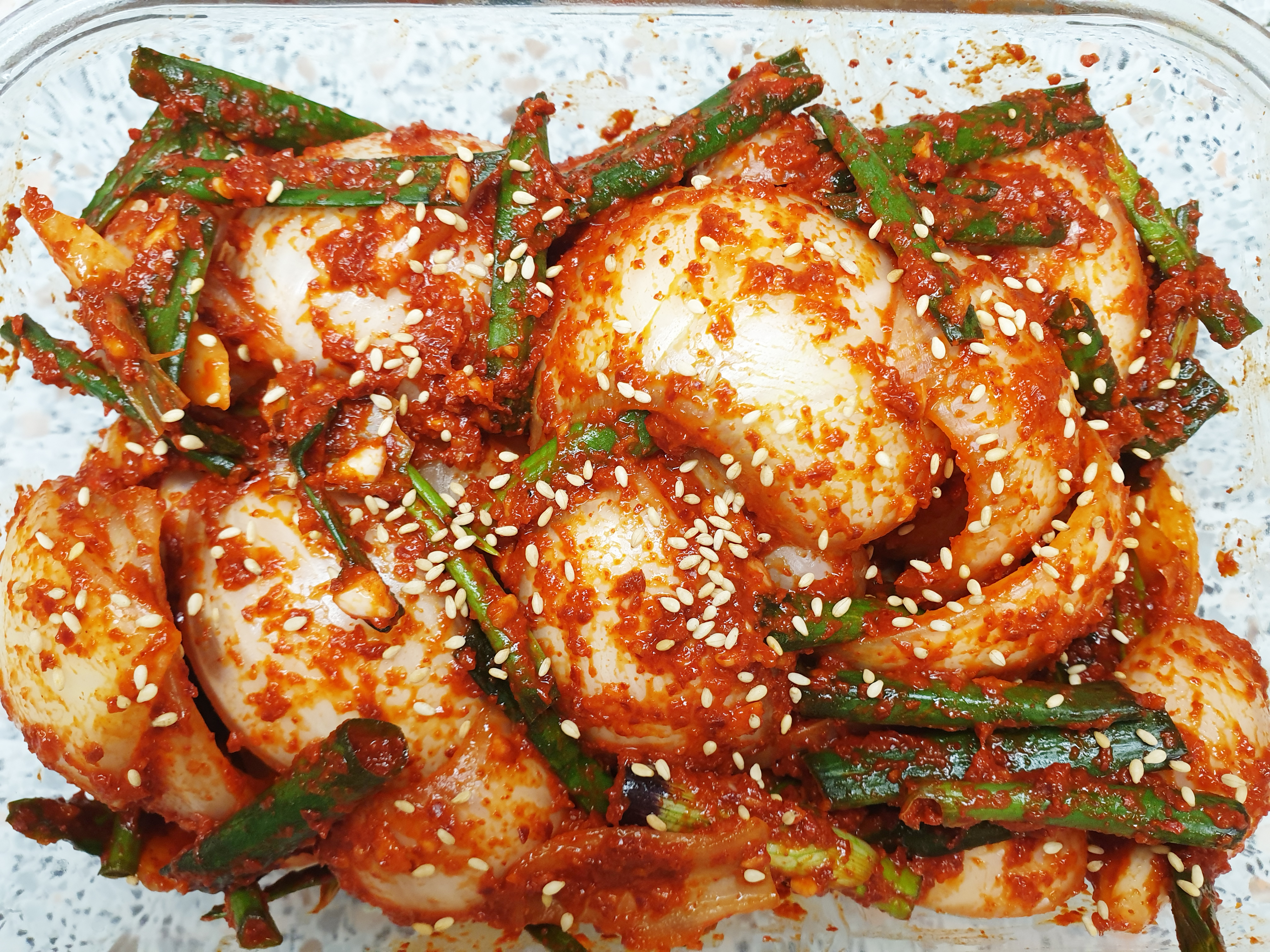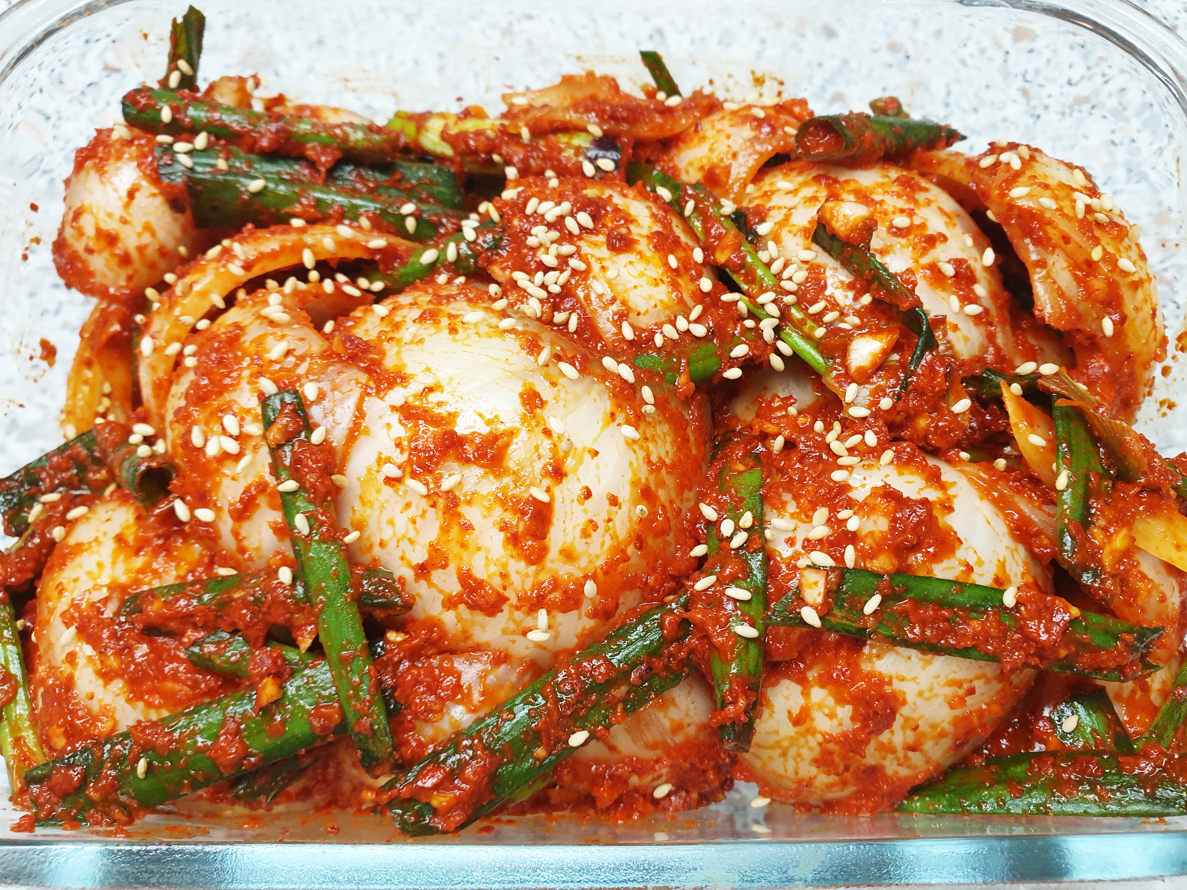 이렇게 맛있는 양파 김치가 완성 됐는데요, 완성된 양파김치는 통에 담아은 뒤 익히지 않고 바로 냉장고에 넣으시면 됩니다.