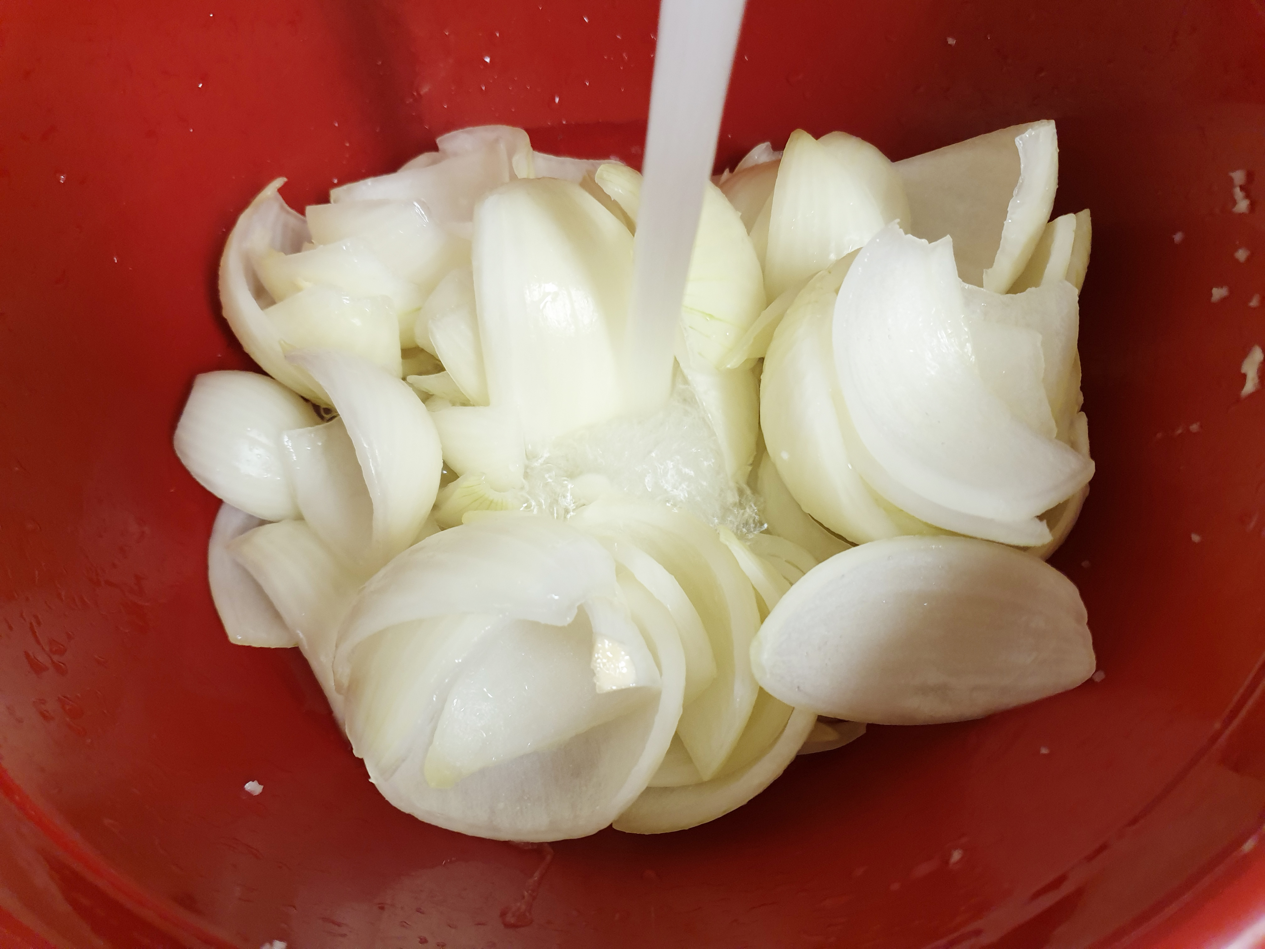 1시간 뒤 절인 양파를 흐르는 물에 헹궈 주고 물기를 쫙 빼주세요! 양파를 절이고 헹구는 과정에서 양파의 매운맛을 중화되기 때문에 부담 없이 먹을 수 있습니다.