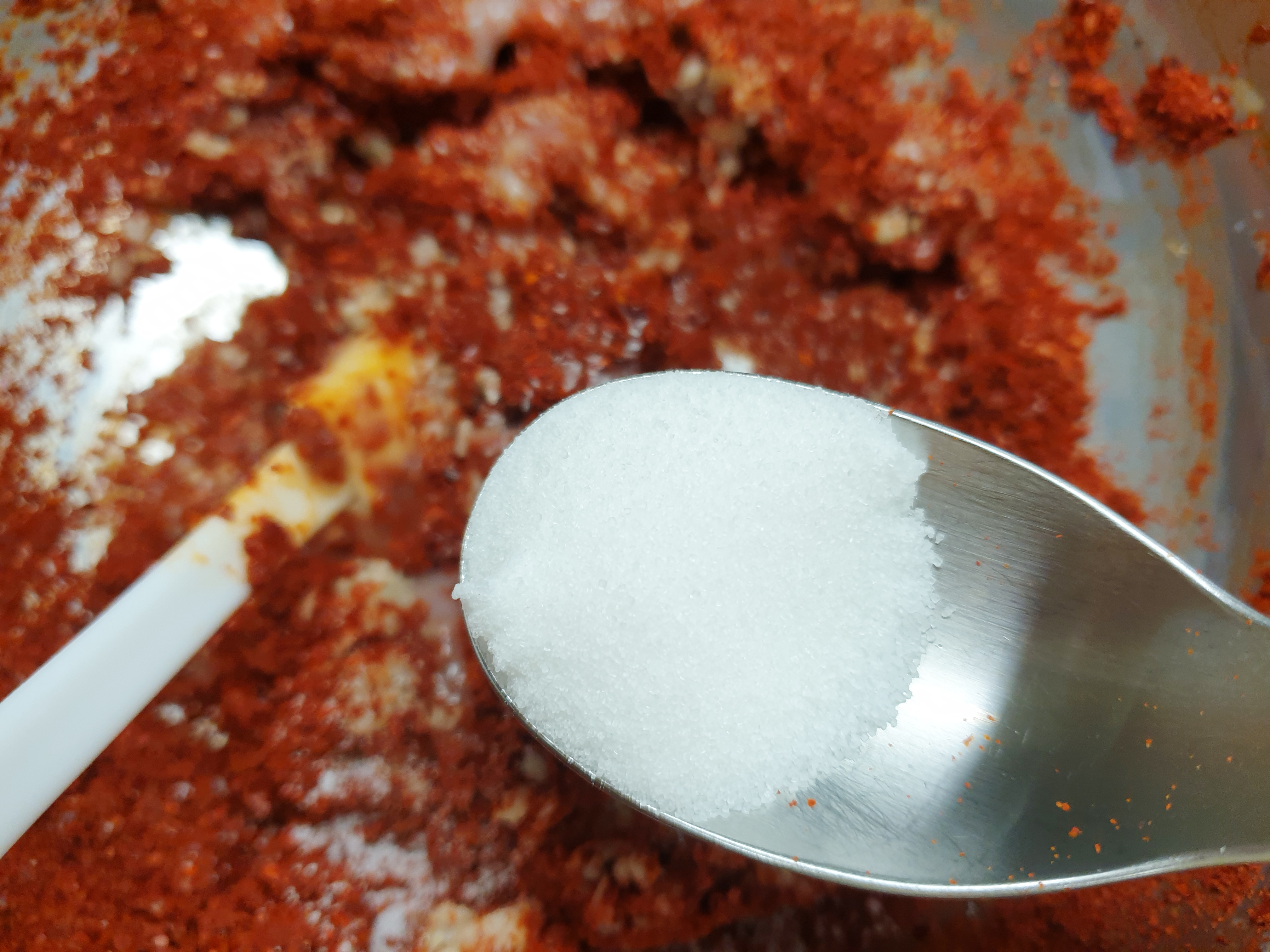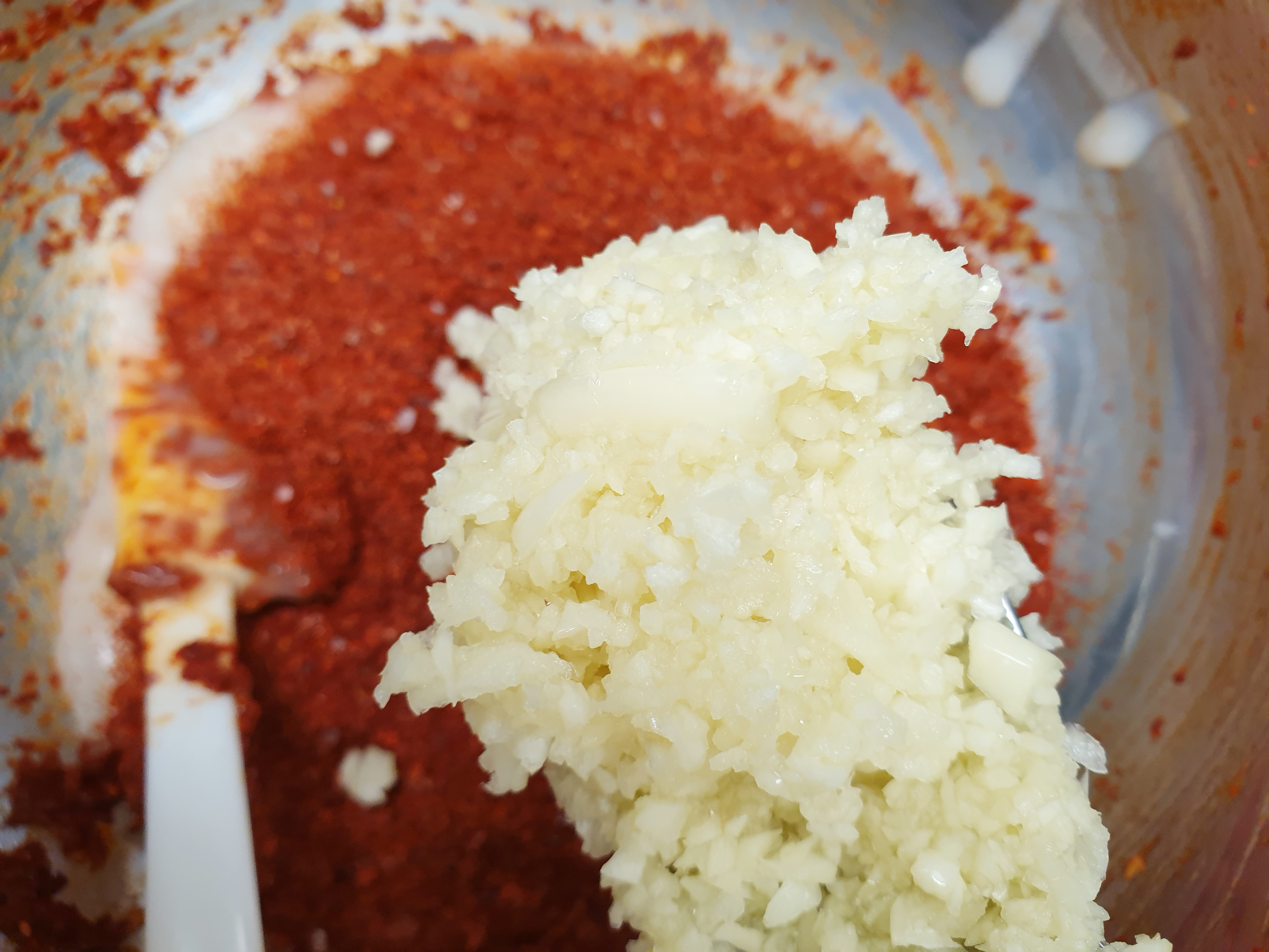 식힌 밀가루 풀에 고춧가루 반 컵 , 다진 마늘 1큰술, 설탕 반 큰 술, 미원 조금, 다진 생강 또는 생강가루 반 큰 술을 넣고 섞어 주세요! 전 알레르기 때문에 넣지 않았지만 새우젓이나 액젓을 추가해주셔도 됩니다.