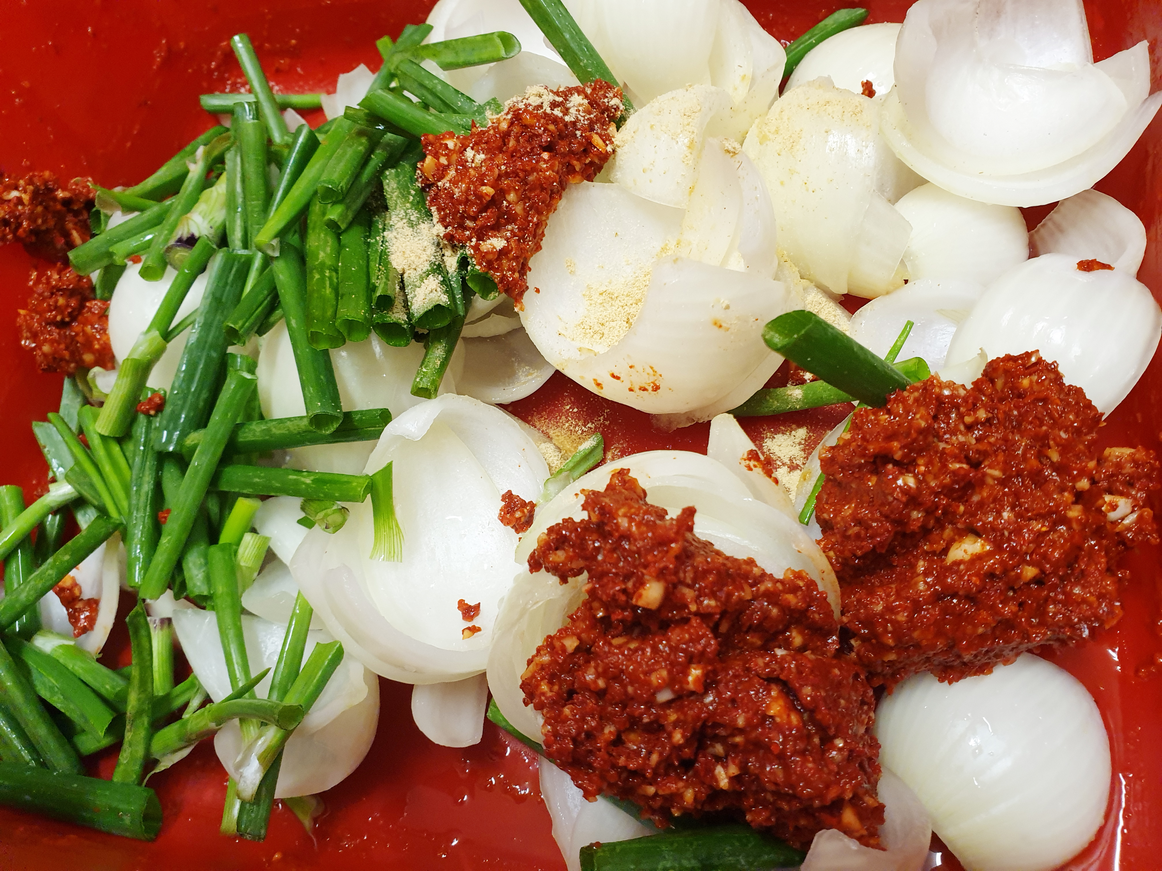 다라에 쪽파 , 양념, 양파를 넣고 양파가 부서지지 않게 살살 ~ 양파에 양념이 골고루 묻을 수 있도록 잘 버무려 주세요! 간이 부족하다면 소금(액젓으로 가능)이나 설탕으로 간을 맞춰 주시면 됩니다.