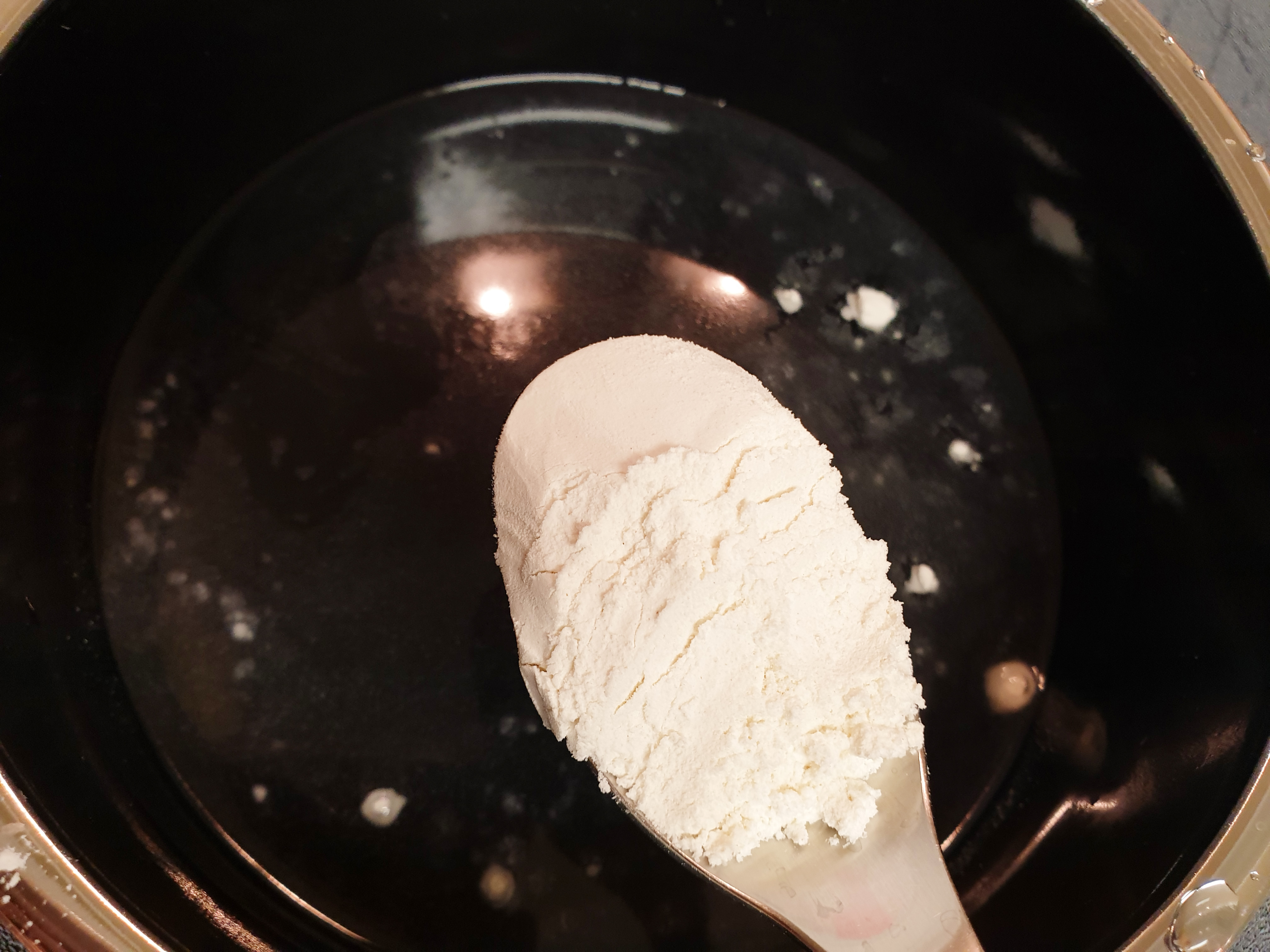 양파김치 양념에 필요한 밀가루 풀 만드는 방법을 알려 드릴게요! 냄비를 준비해 준 뒤 물 3분의 2컵과 밀가루 1큰술 반을 넣고 밀가루가 완전히 풀릴 때까지 저어줍니다.