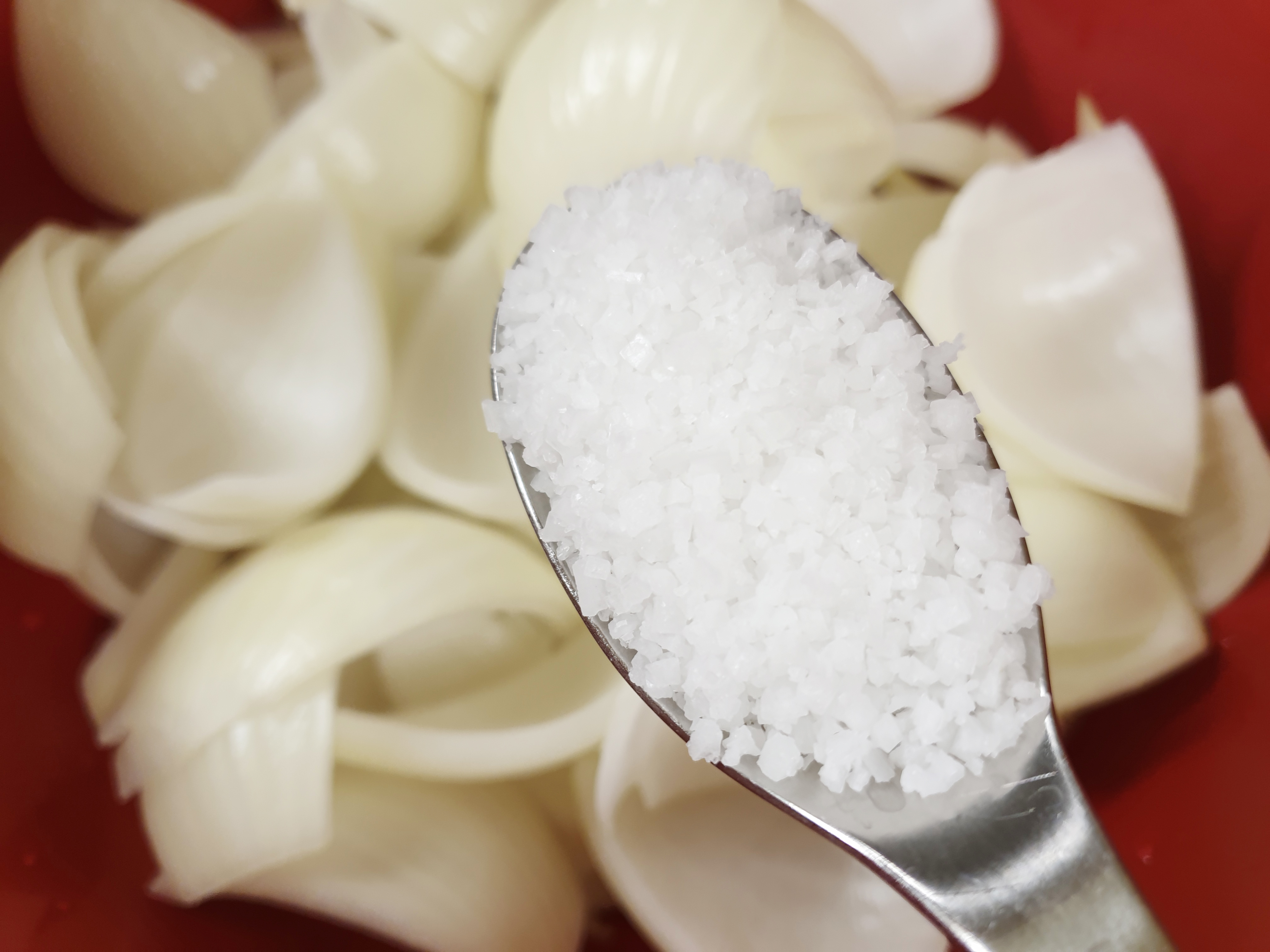 떼어낸 양파에 천일염 1큰술을 넣고 버무린 뒤 1시간 동안 절여줍니다. 골고루 잘 절여질 수 있도록 중간 한 두 번 정도 섞어줍니다.
