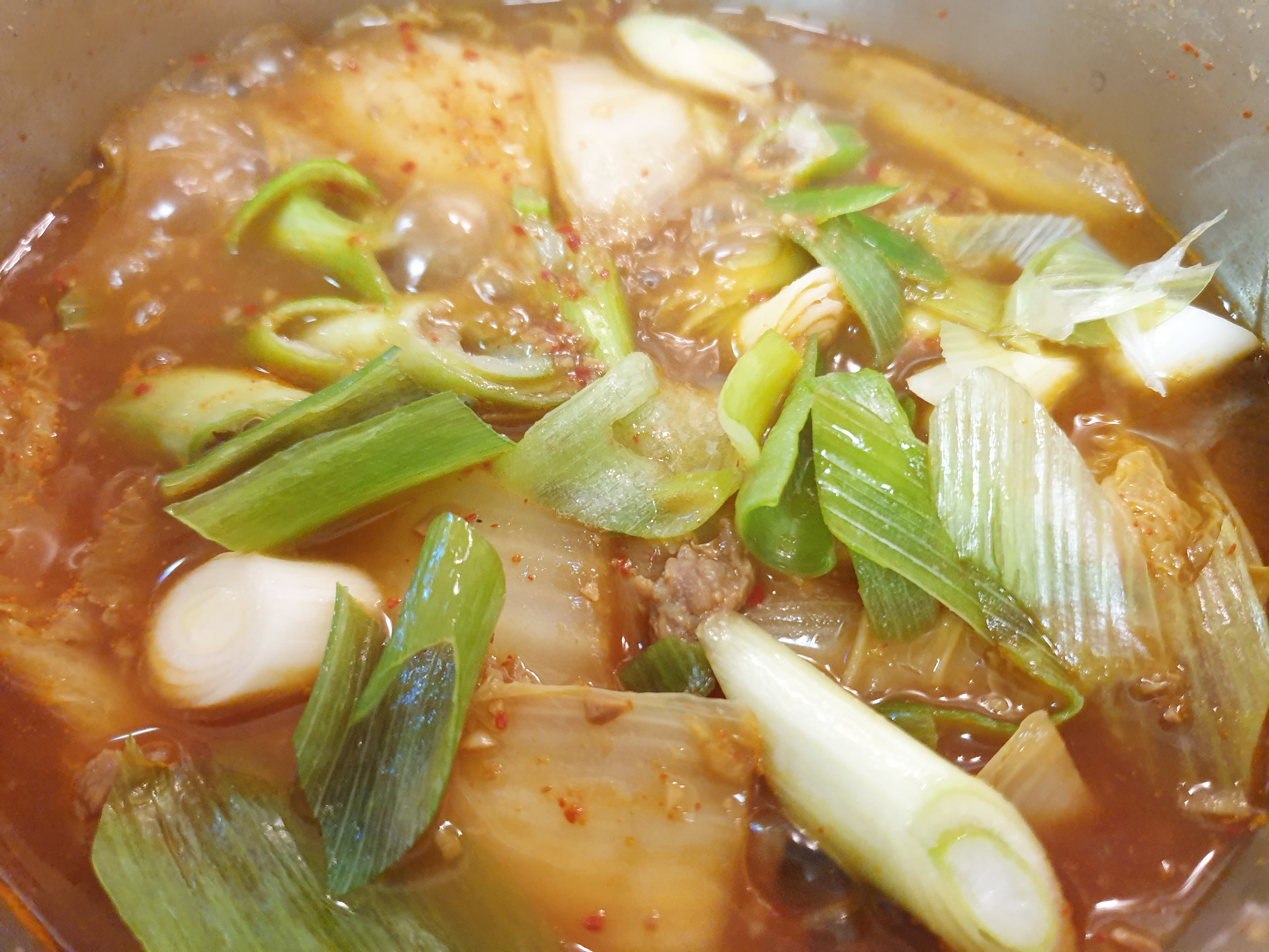 어느정도 배추가 흐물 하물 해 질 때쯤 불을 줄여주고 썰어둔 대파(1대), 양파(1/2), 고추(1~2개)를 넣어주고 배추가 완전히 푹 익을 때까지 끓여주면 끝! (배추 된장국은 오래오래 끓여줄수록 맛있습니다.)