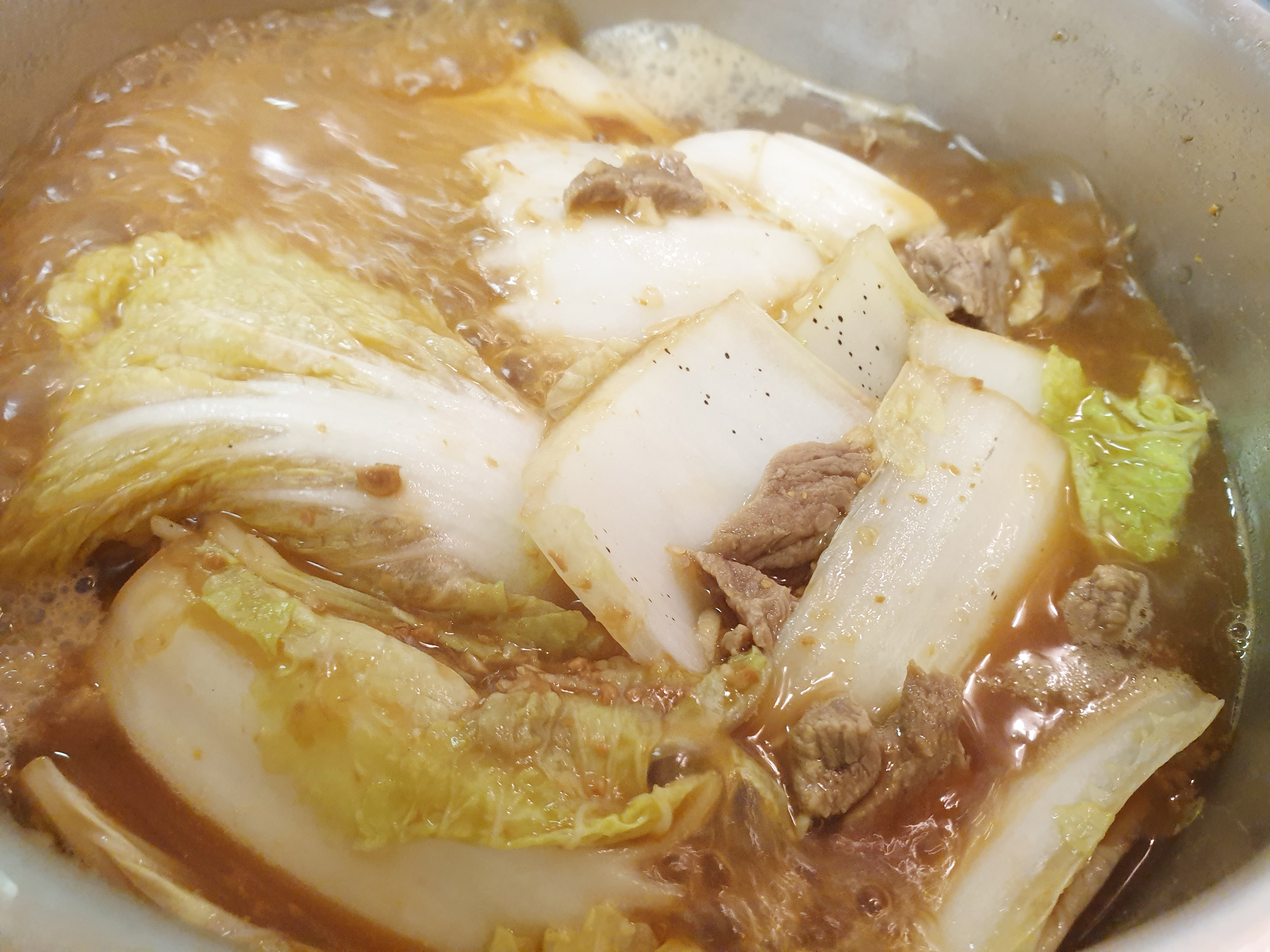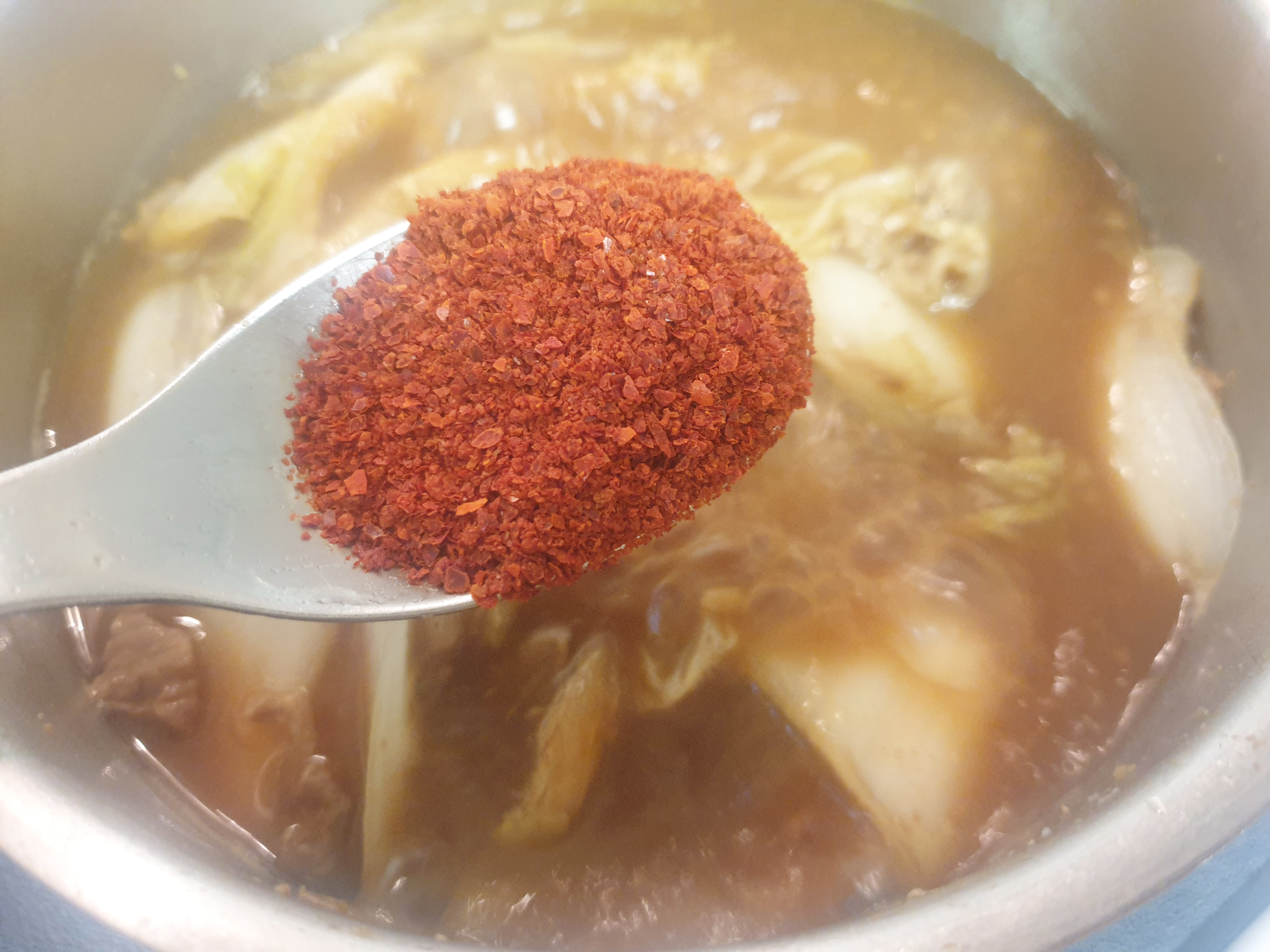 물 위에 떠오른 불순물은 걷어내고 썰어둔 배추, 고춧가루 2스푼 , 설탕 반~한 스푼 , 국간장 1스푼 을 넣고 15분간 푹 끓여줍니다.