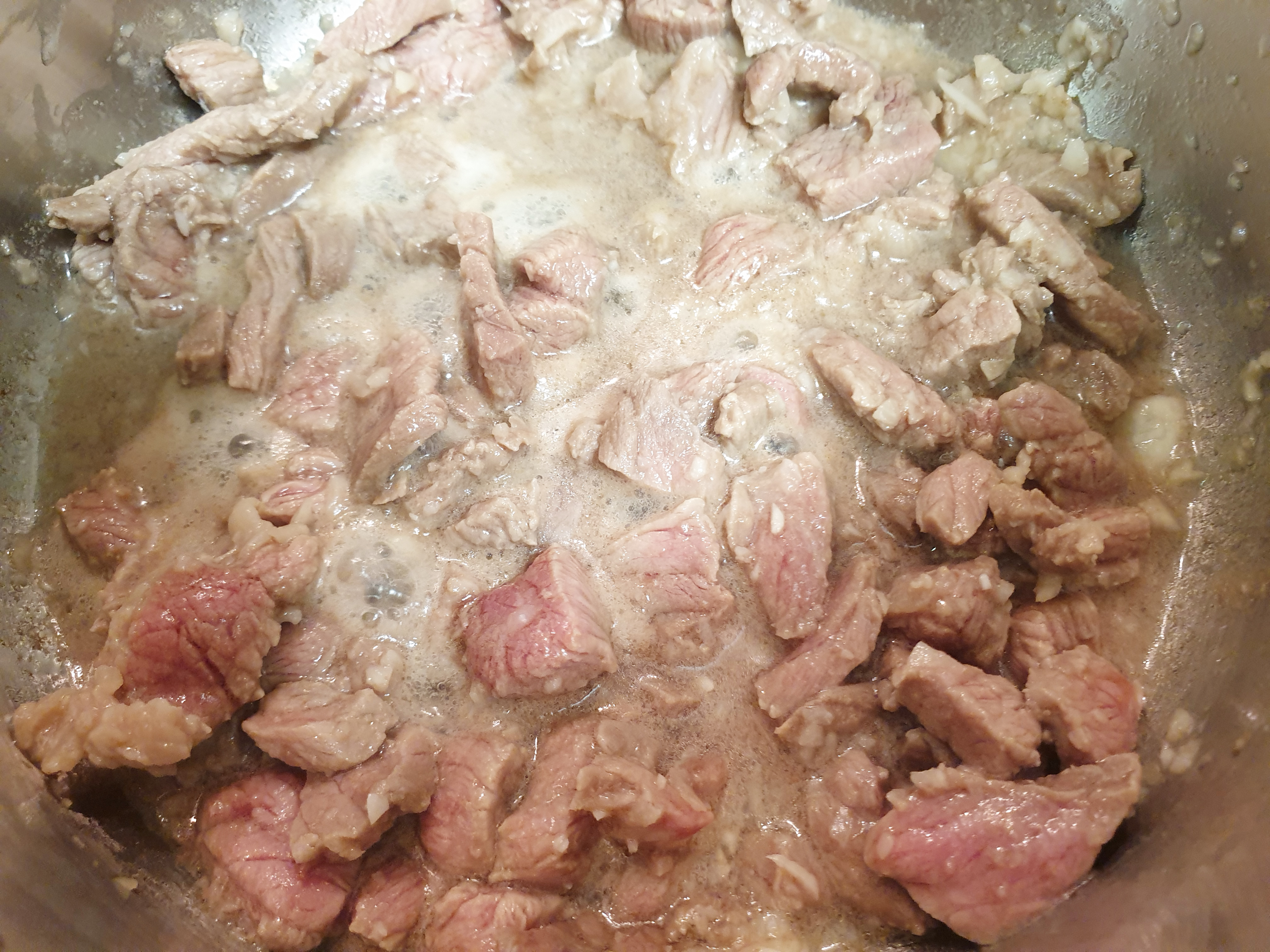 고기가 익었다면 육수물 또는 물 3컵 반 (약 800ml)를 부어주고 된장 3스푼을 넣어 잘 풀어줍니다.