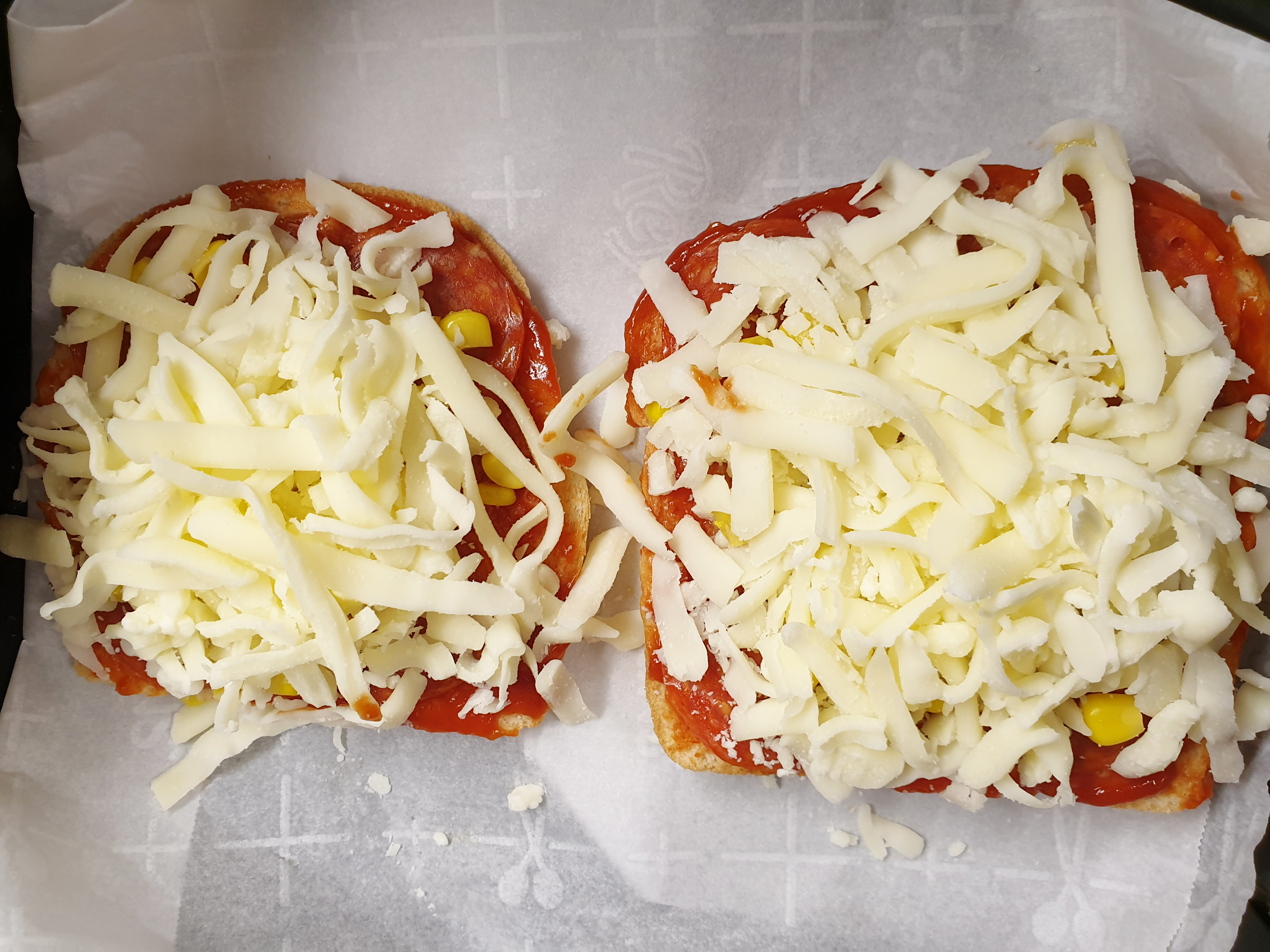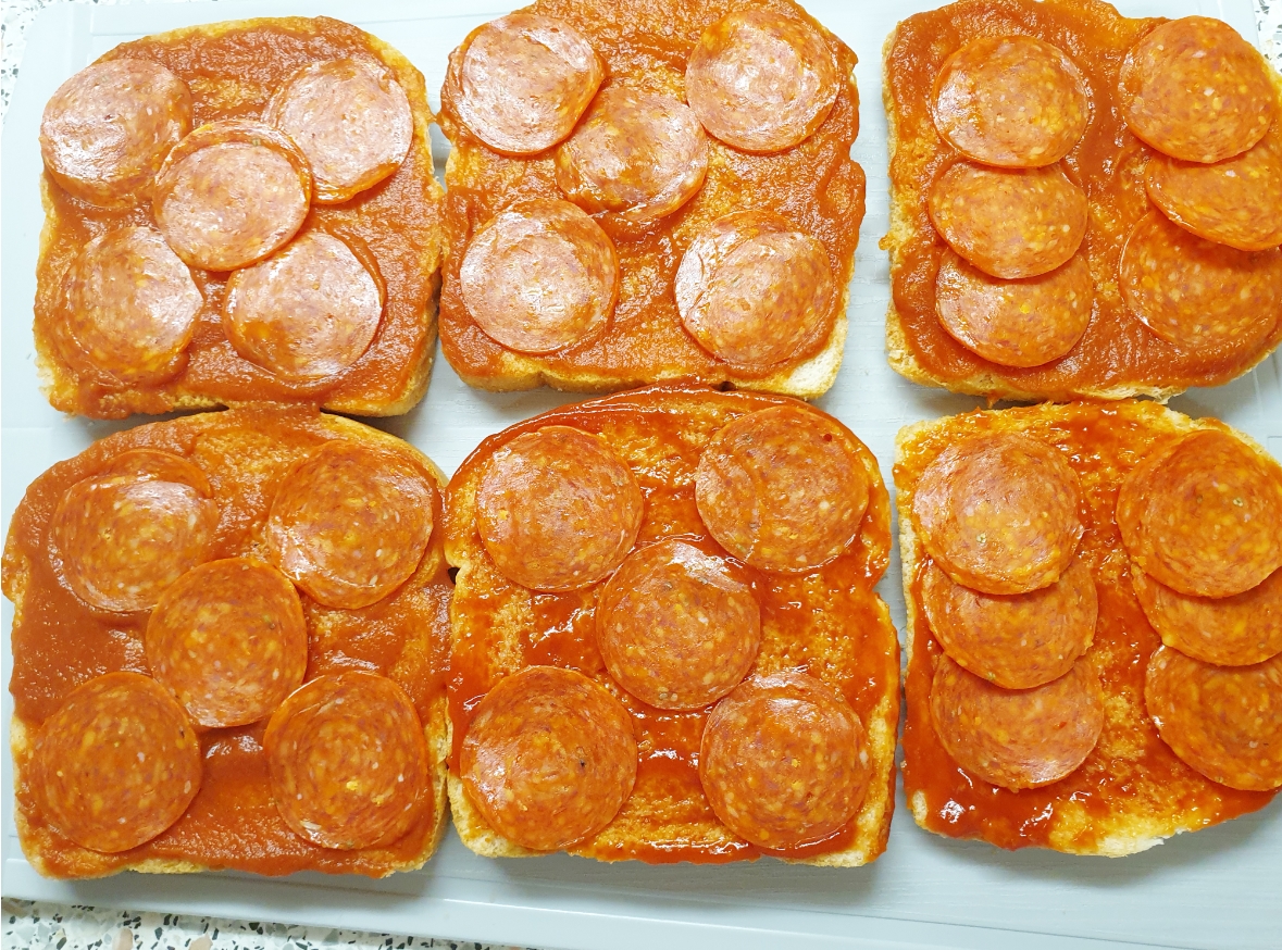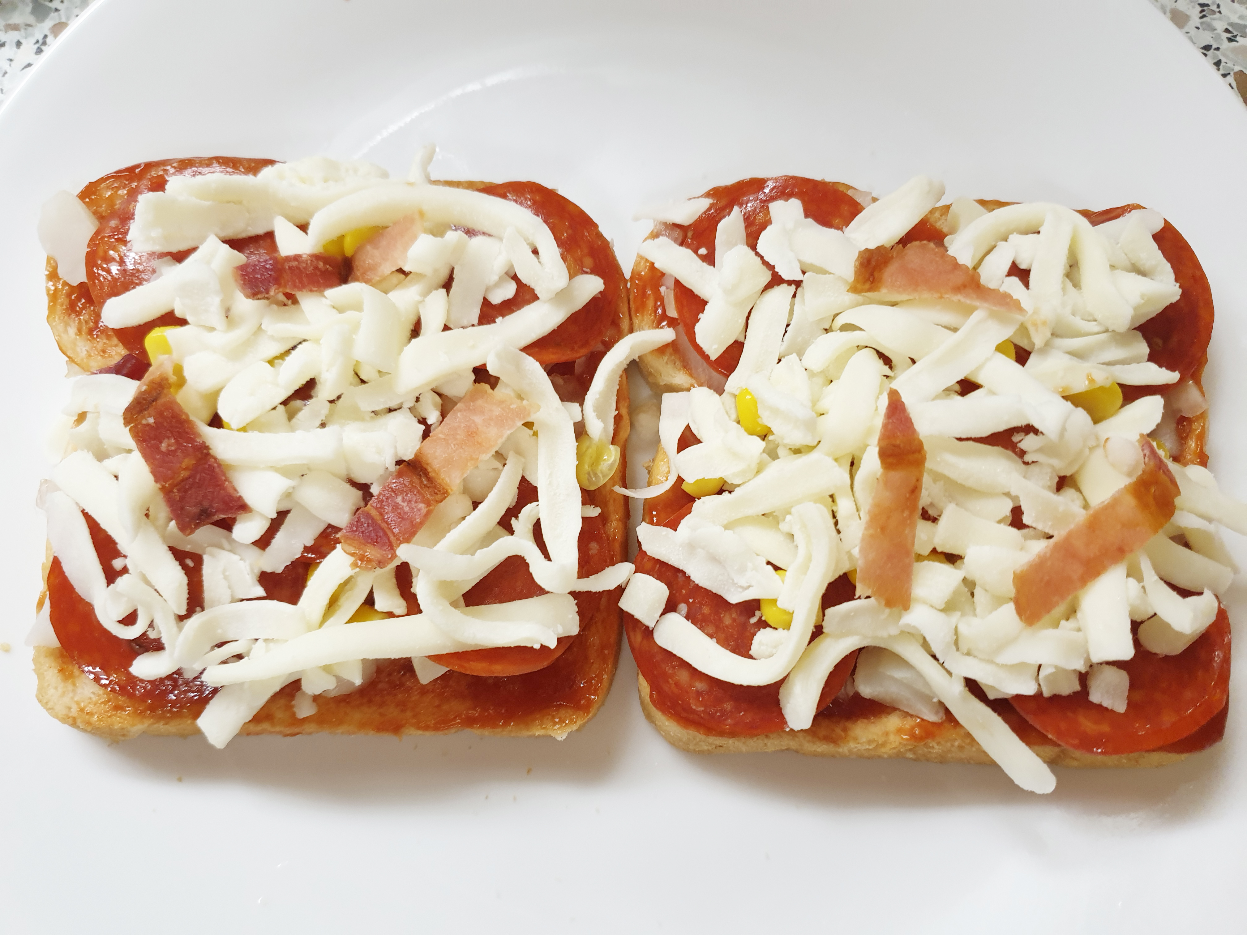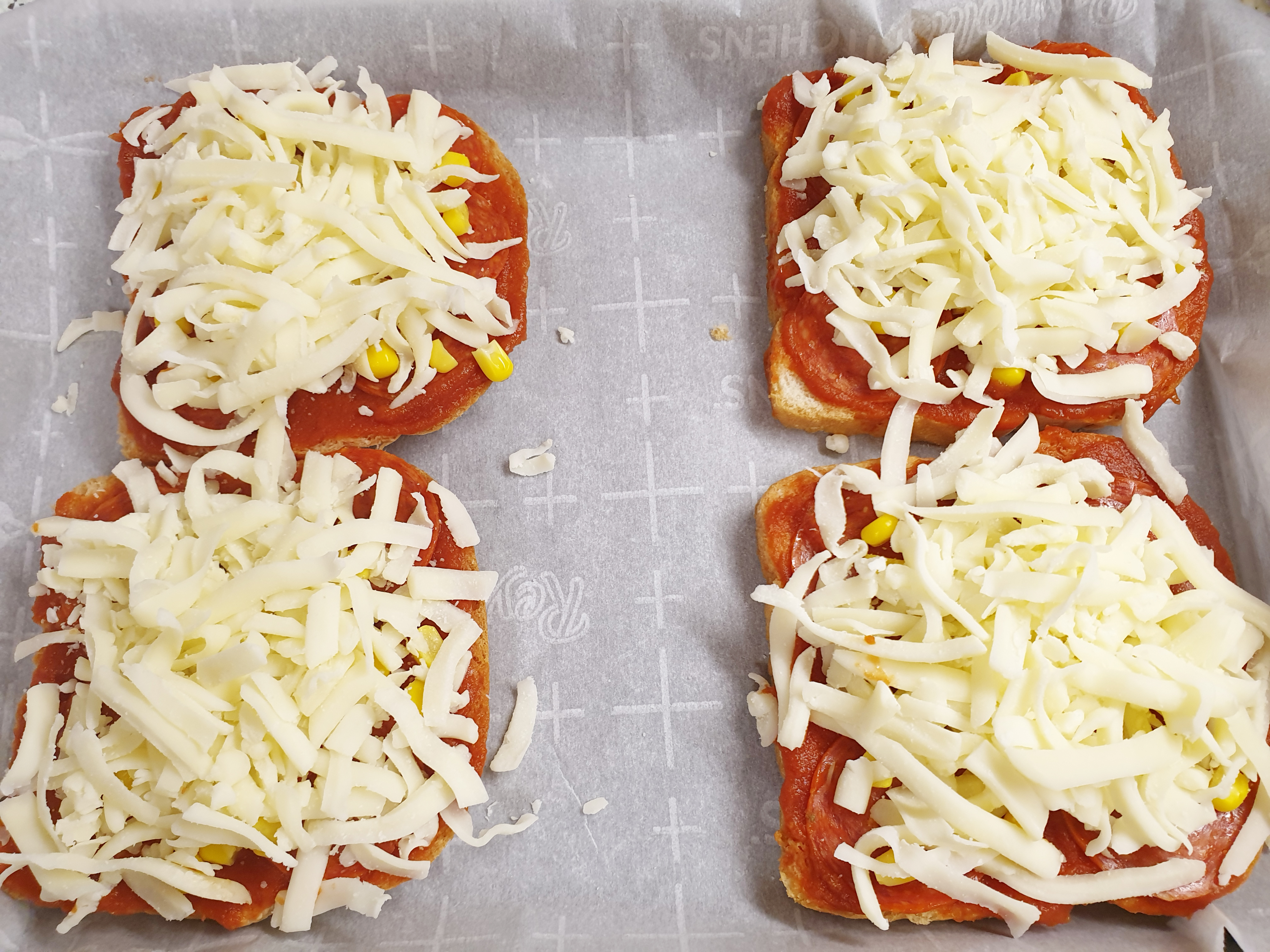 식빵 준비 - 케첩이나 토마토소스 바르기 - 토핑 올리기 - 오븐을 200도에 맞추고 15~20분 간 구워주기