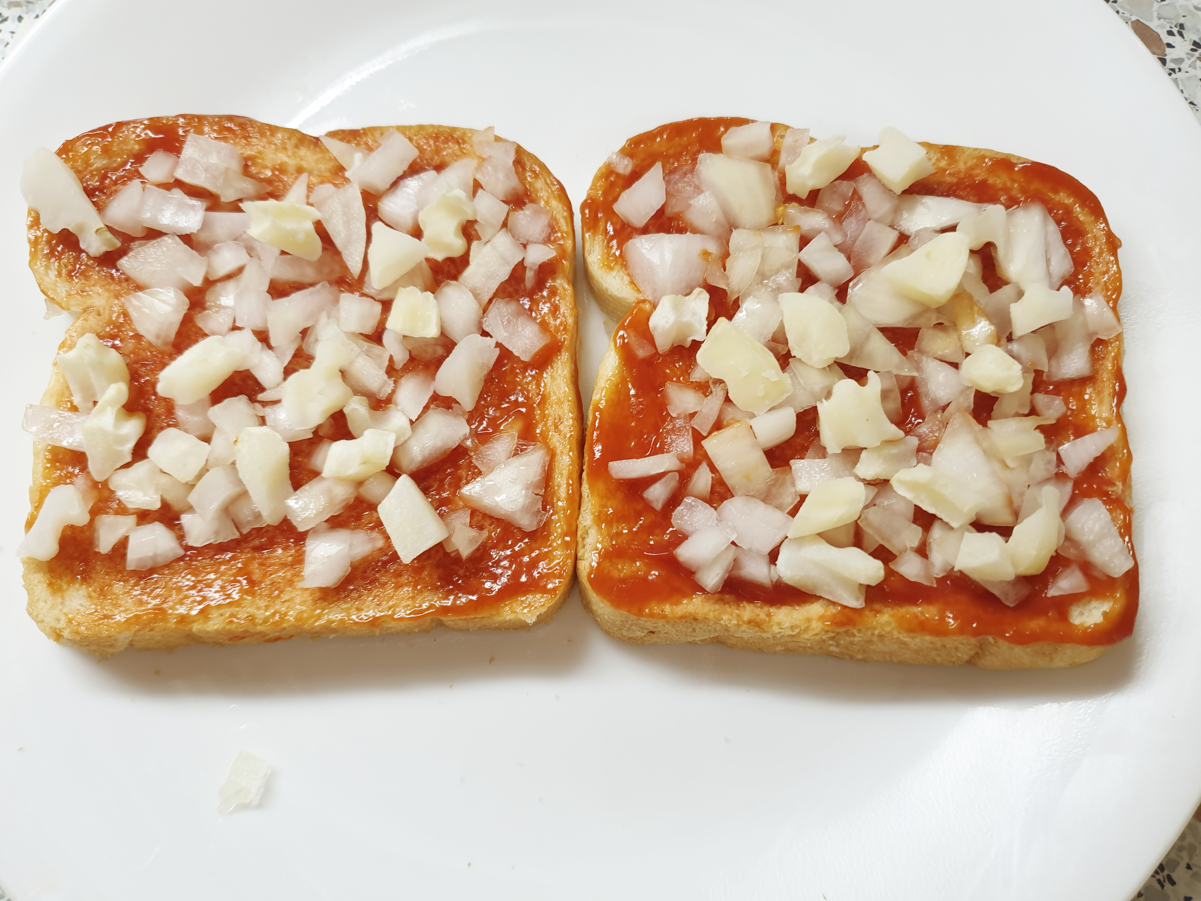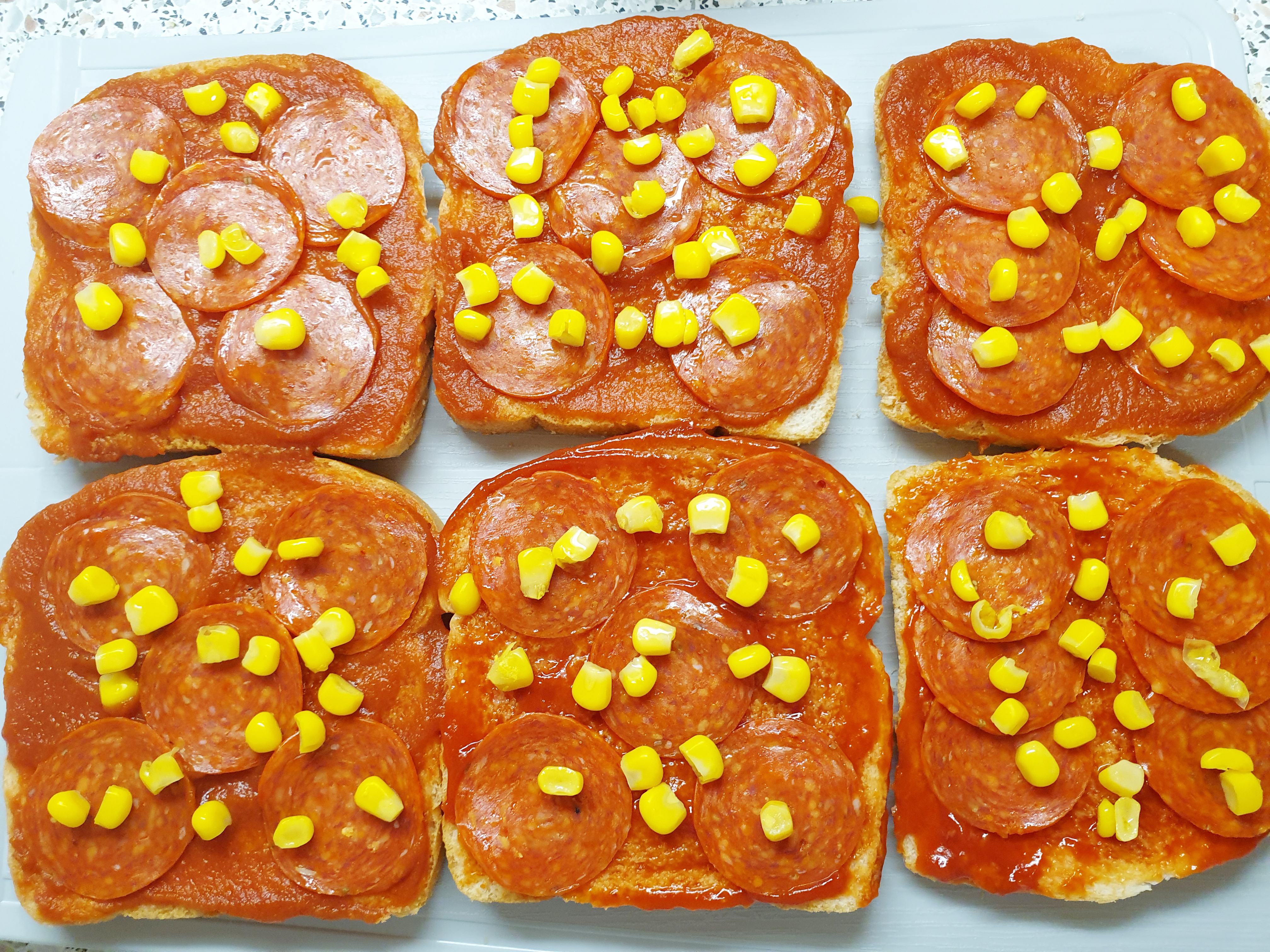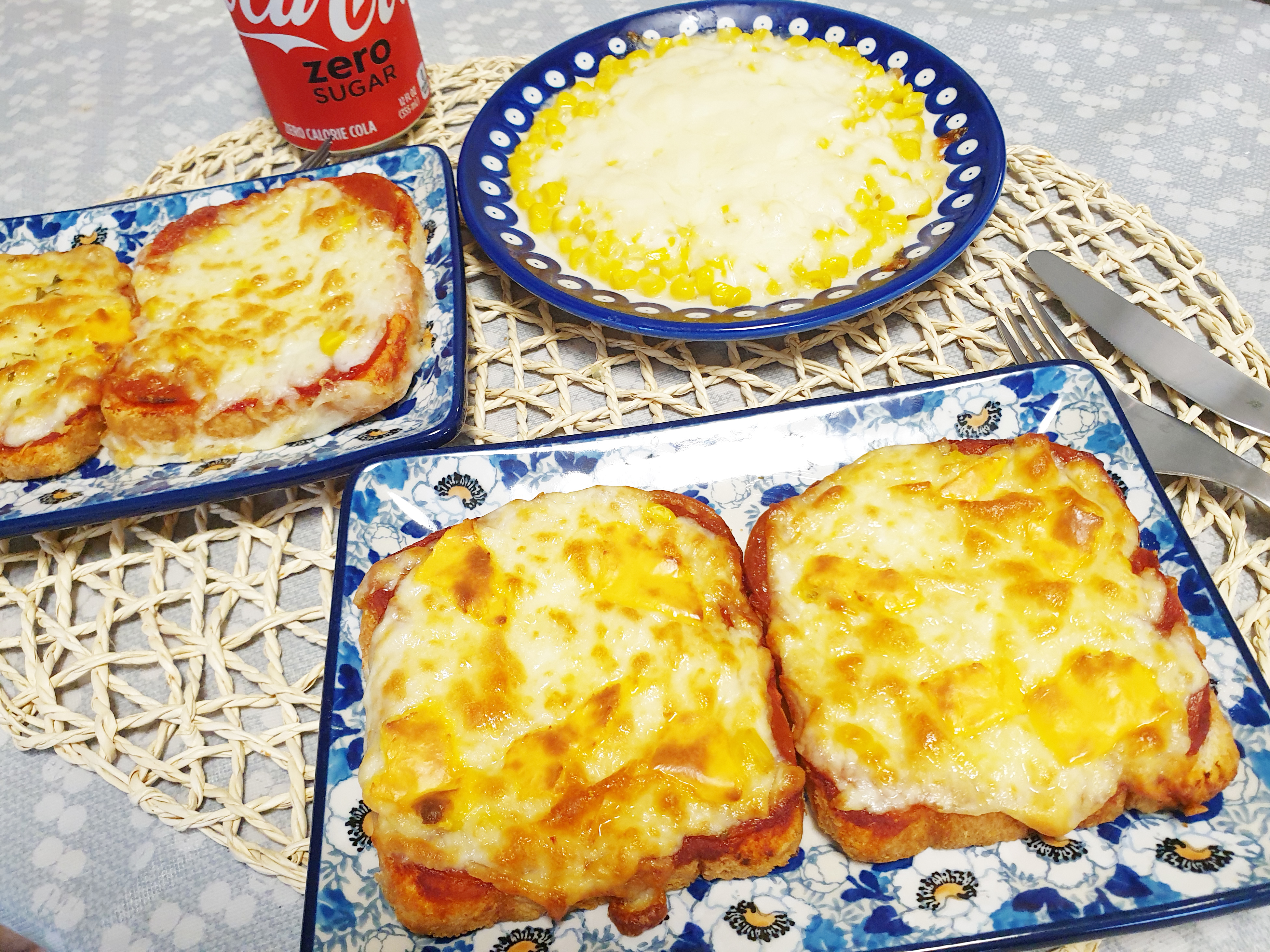 식빵 준비 - 케첩이나 토마토소스 바르기 - 토핑 올리기 - 오븐을 200도에 맞추고 15~20분 간 구워주기