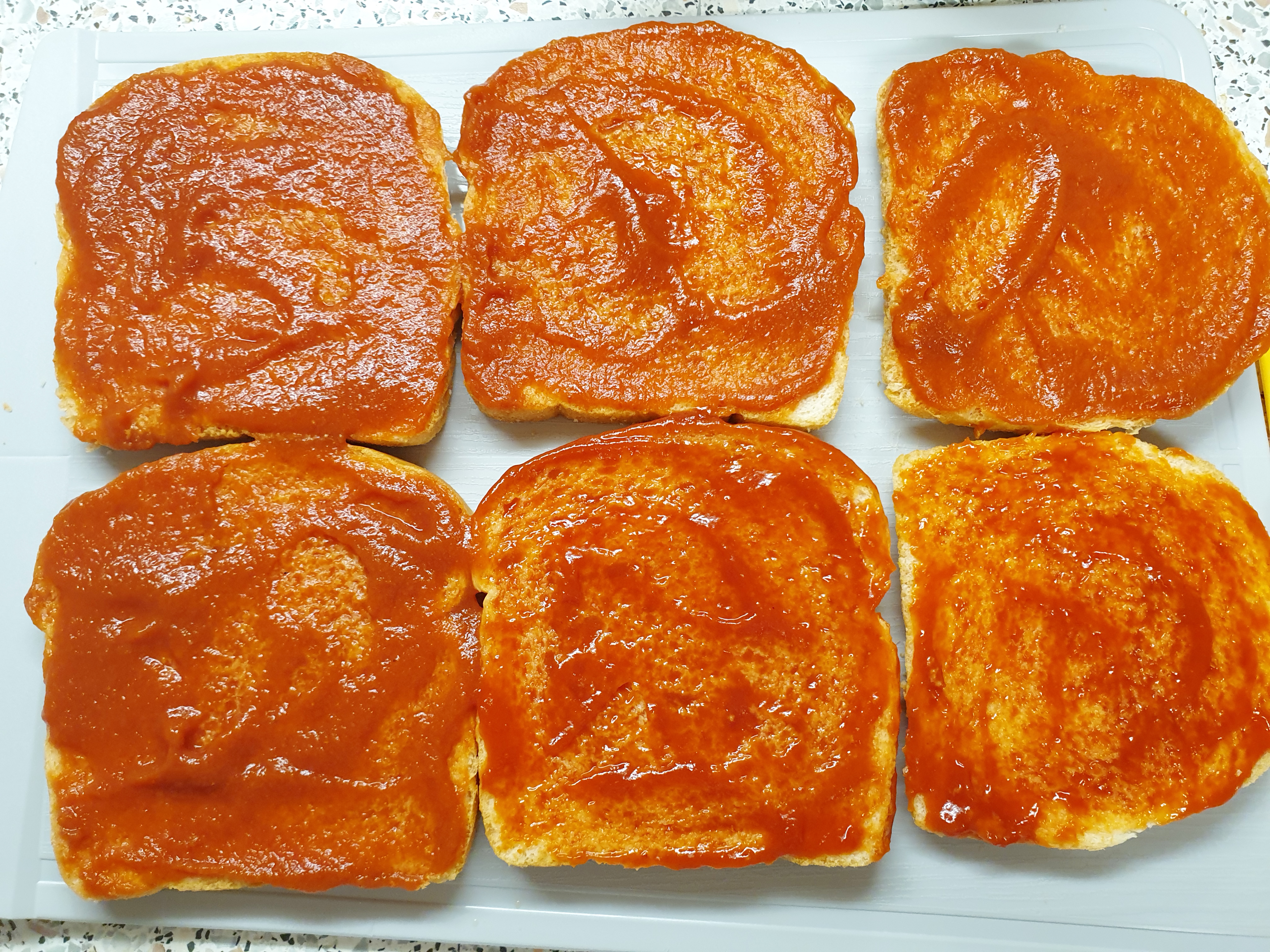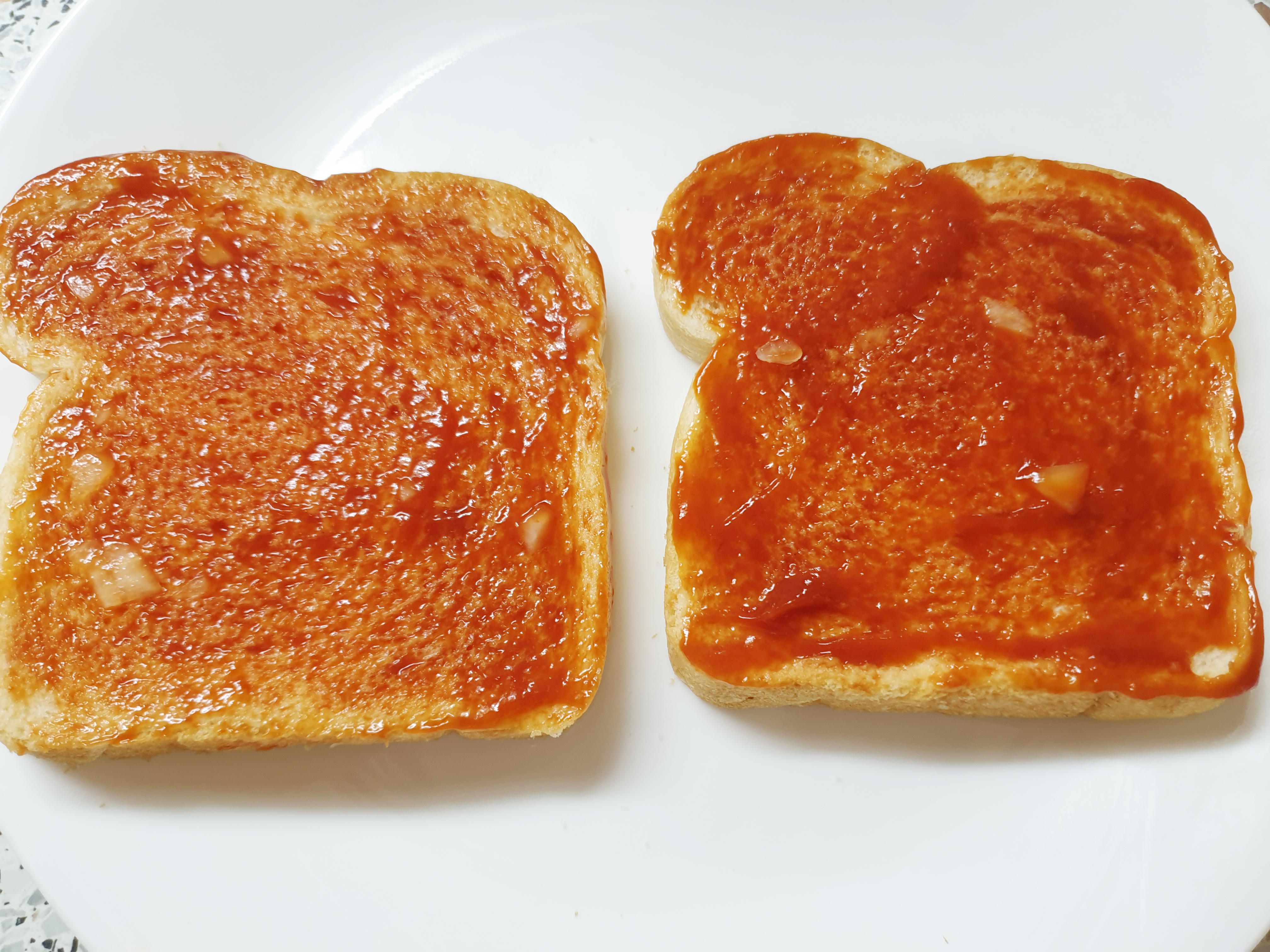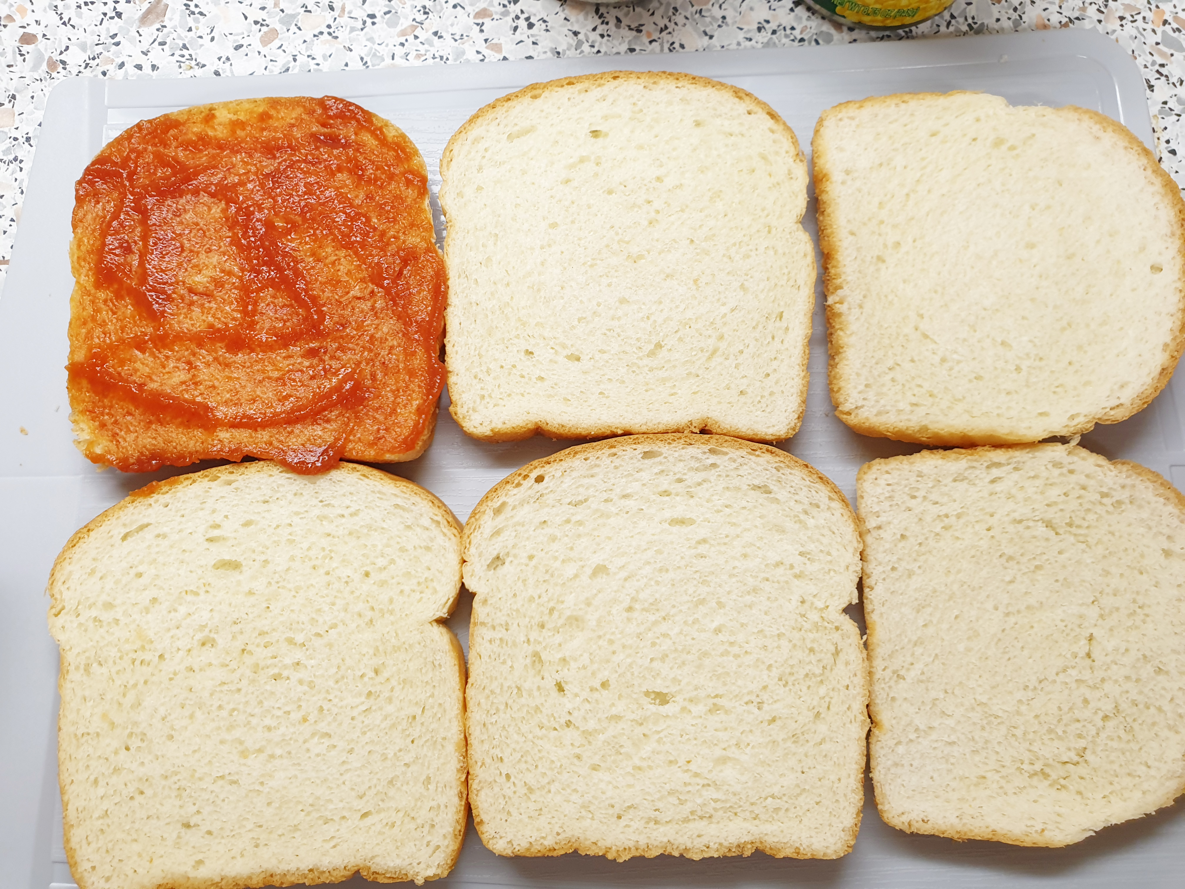 식빵 위에 케첩 또는 토마토소스를 한 스푼 정도 발라 주세요~ 케첩이랑 토마토소스를 둘 다 사용해 봤는데 맛의 차이가 거의 없어서 토마토소스를 따로 살 필요 없이 케첩을 사용하면 될 것 같아요!