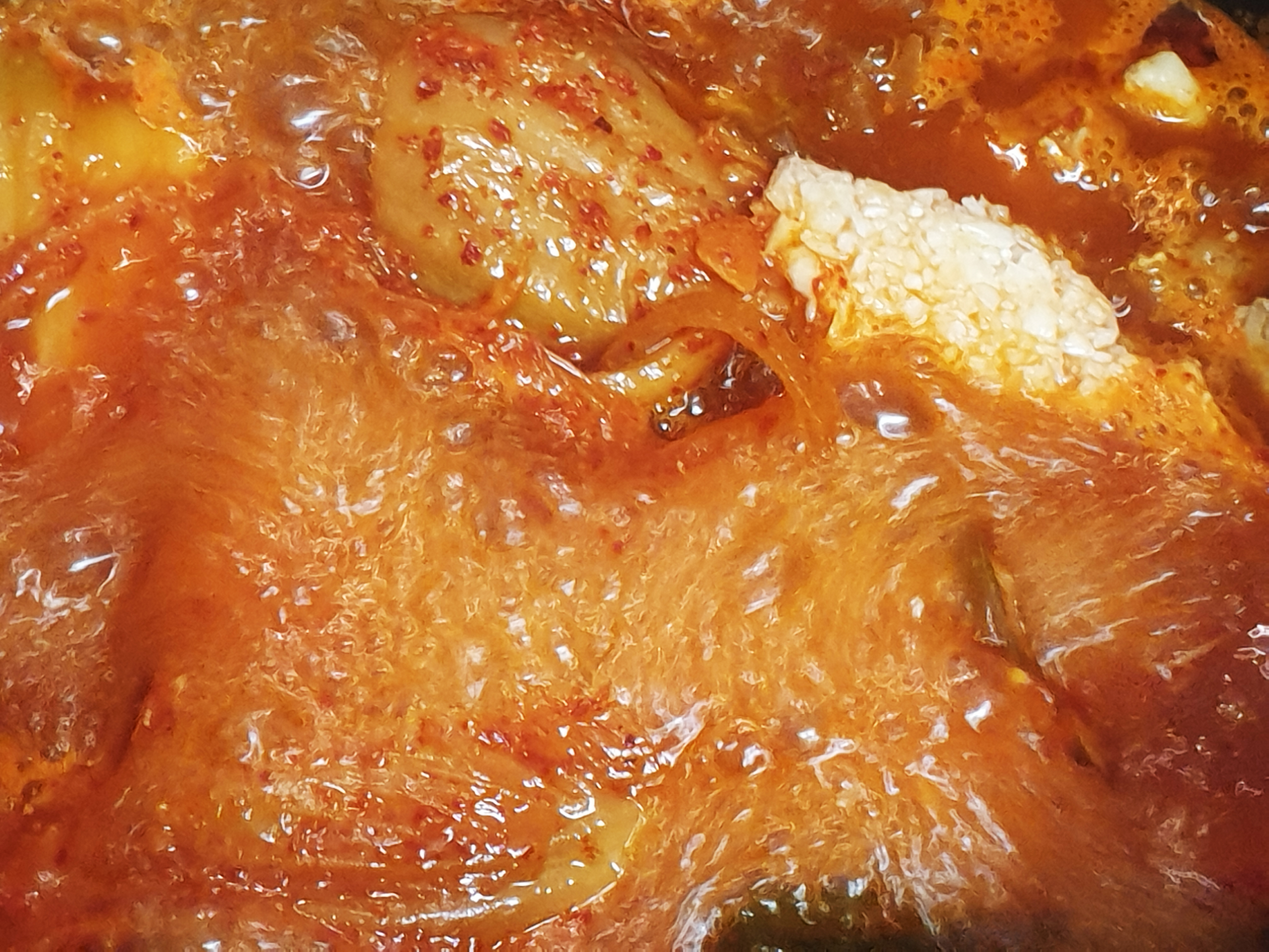 5. 국물이 진해지고 김치가 잘 익어 흐물흐물해지면 썰어둔 양파 1/4개 , 대파 1 대 , 고추 1~2개를 넣고 5분간 끓여줍니다. 전 간이 살짝 부족해서 약간의 소금을 넣어 줬어요!