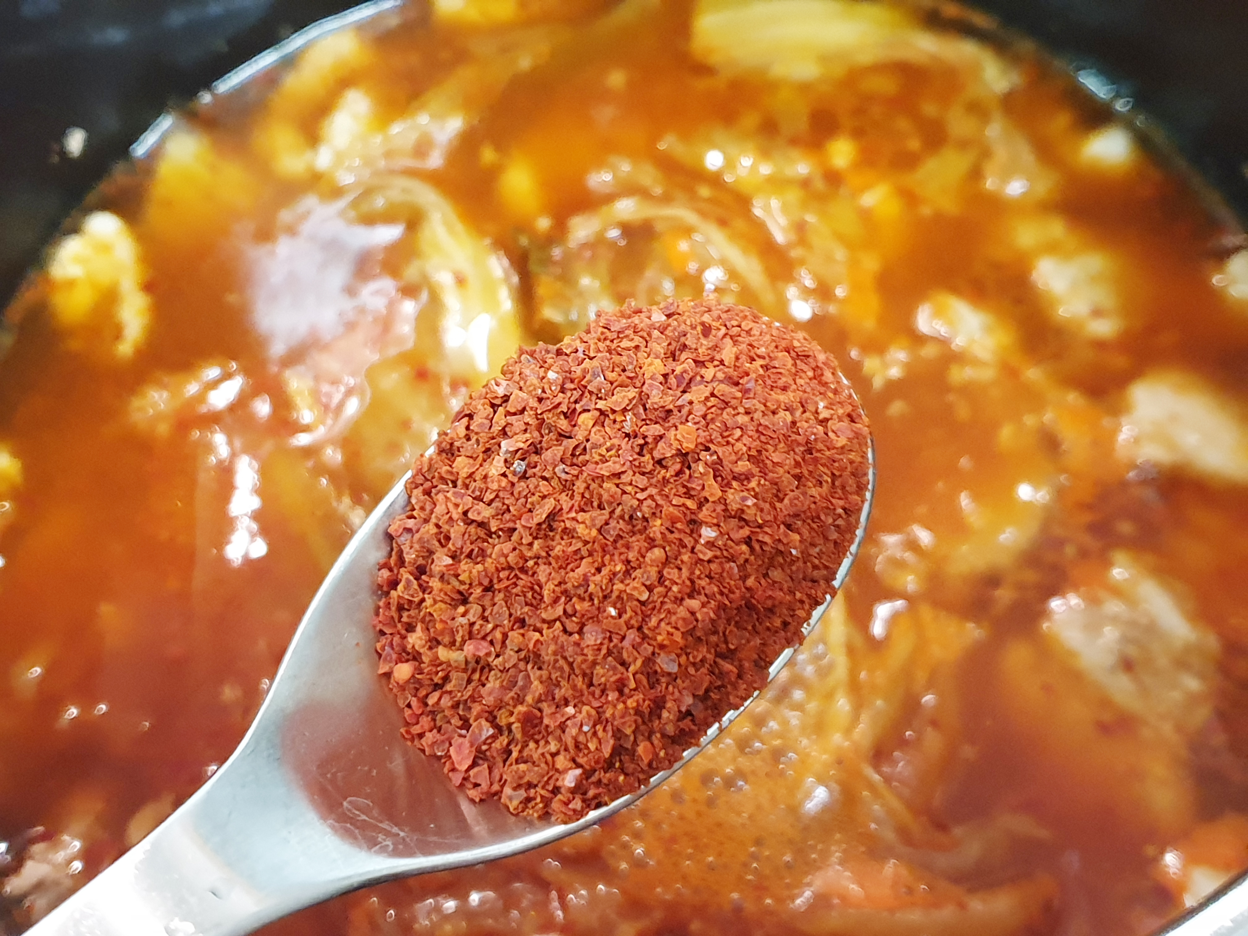 4. 돼지고기가 잘 익고 고기에서 기름이 나온 것이 보이면 신김치 390g 고춧가루 2큰술 , 설탕 1큰술 , 다진 마늘 1큰술 , 국간장 1큰술을 넣고 김치가 푹~ 익을 때까지 20~30분간 끓여주세요~ (중간에 물이 부족하다면 보충해주세요!)