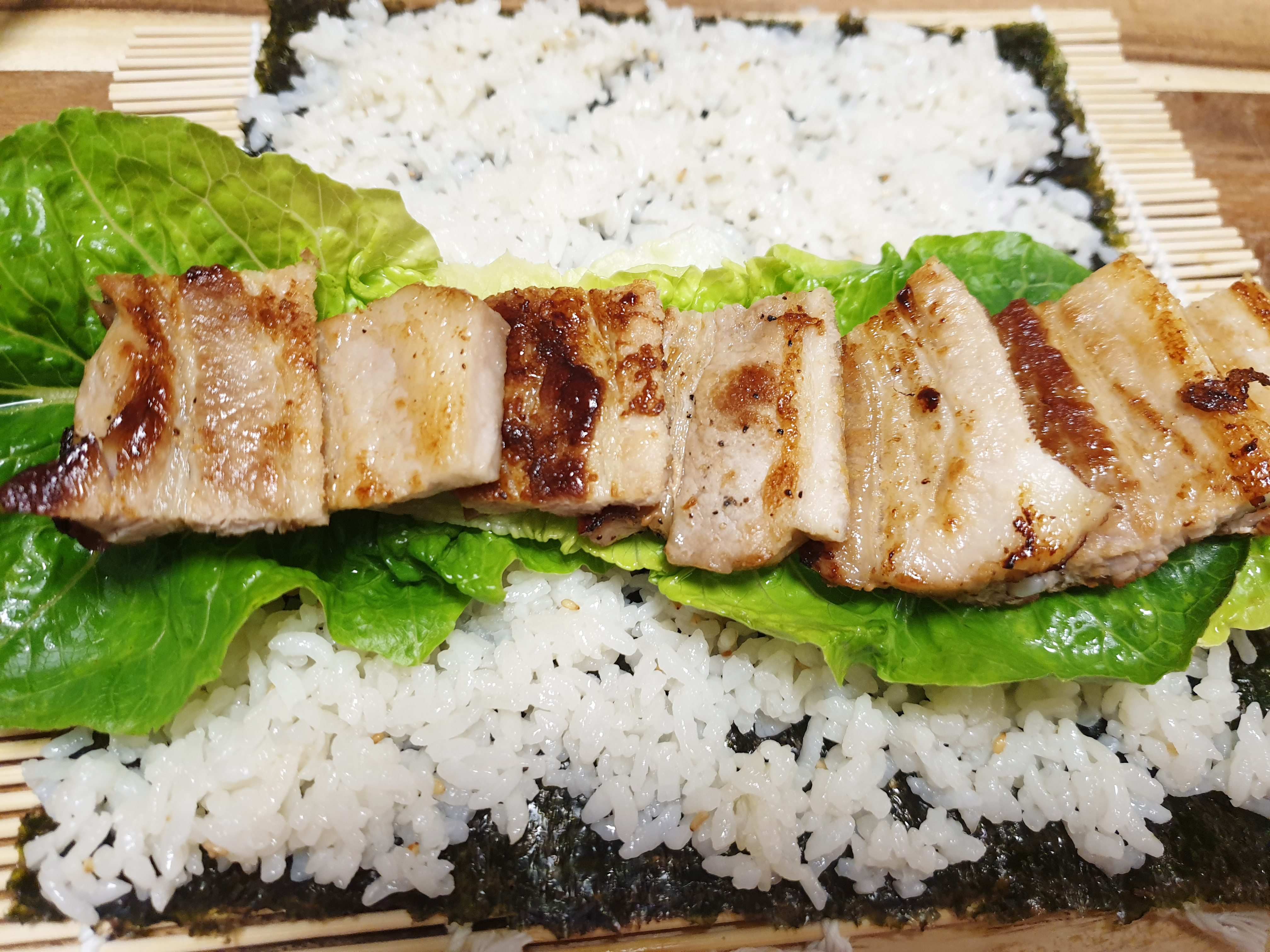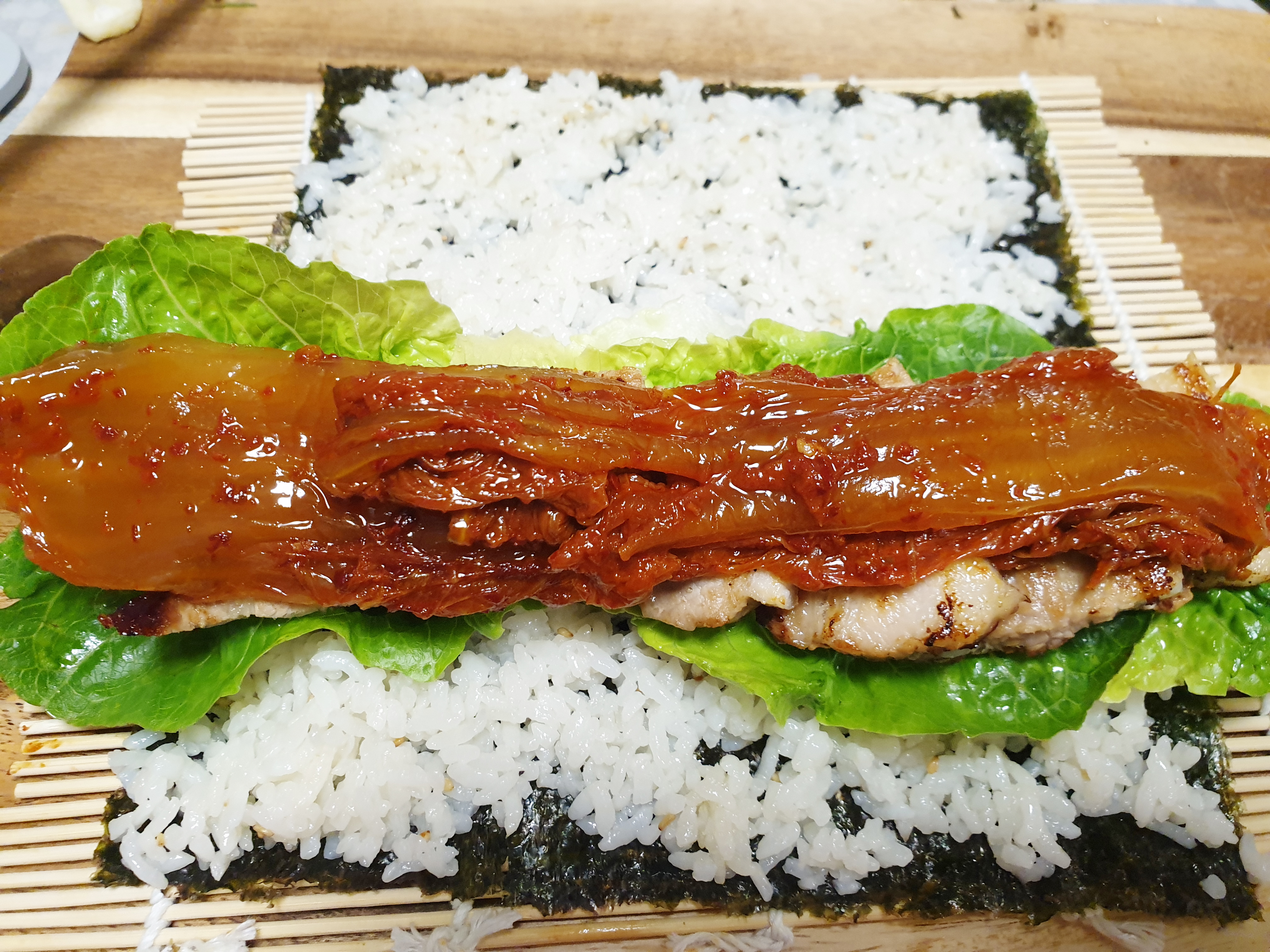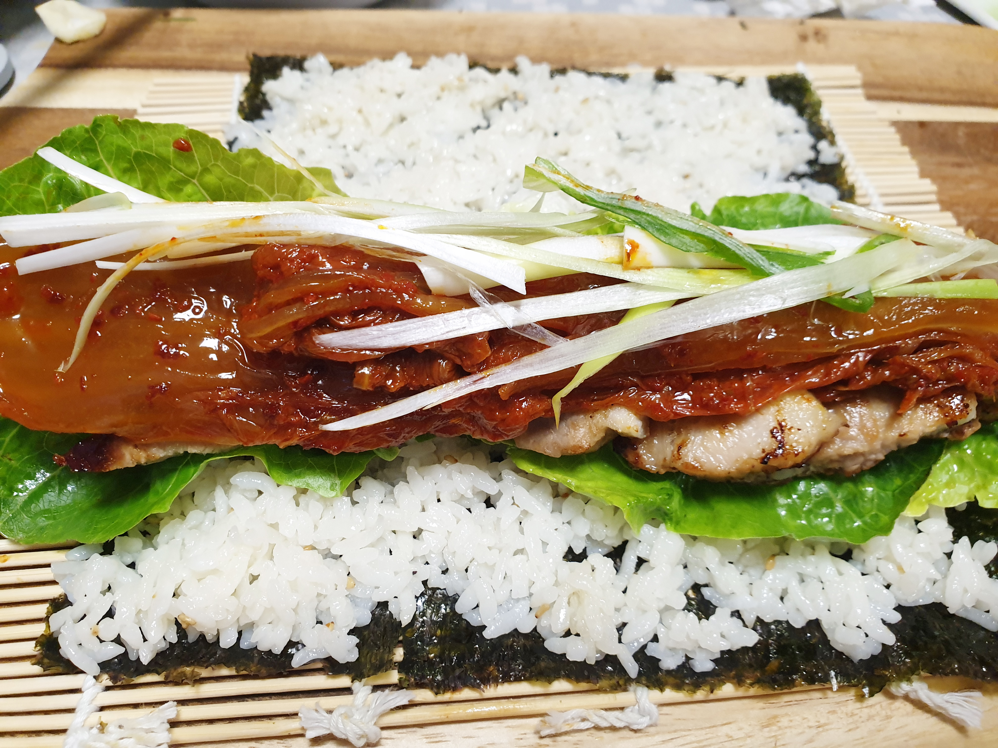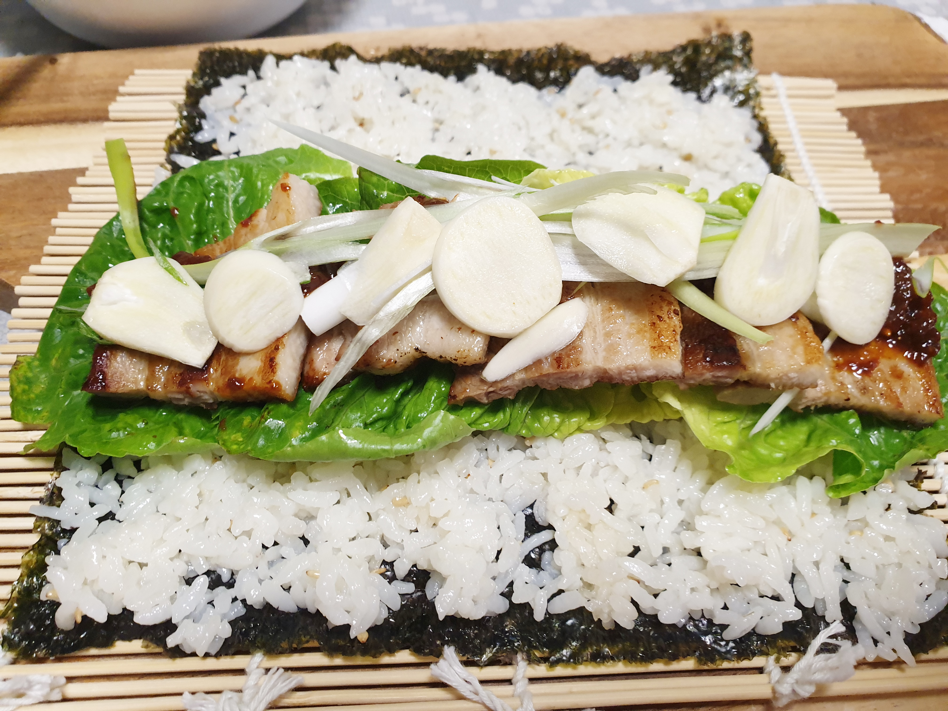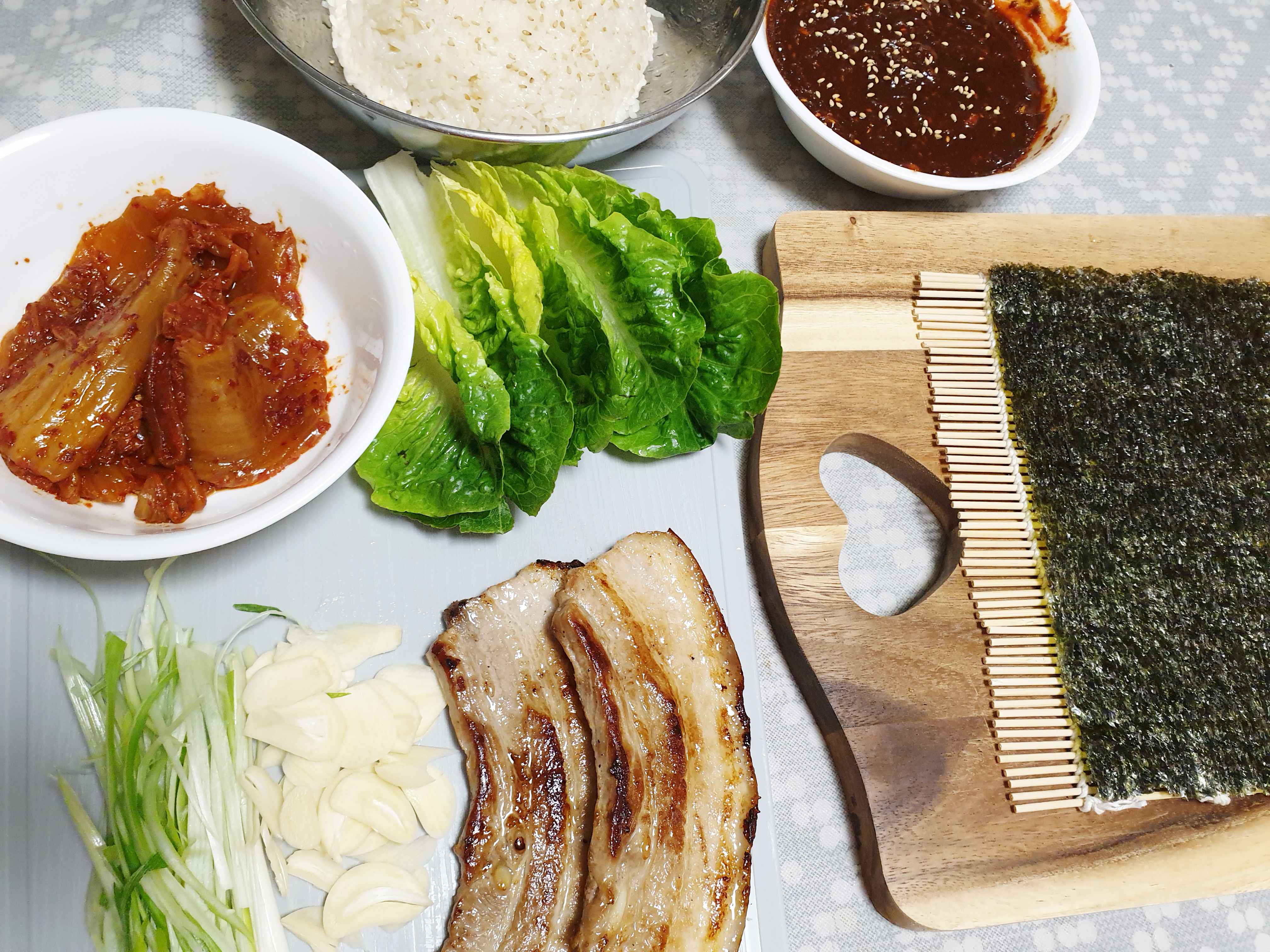 필요한 재료 : 상추 , 마늘 , 밥, 김밥전용 김 , 대파 1/2 , 삼겹살 , 쌈장 , 참기름 , 소금, 후춧가루 , 볶음 깨 , 신김치