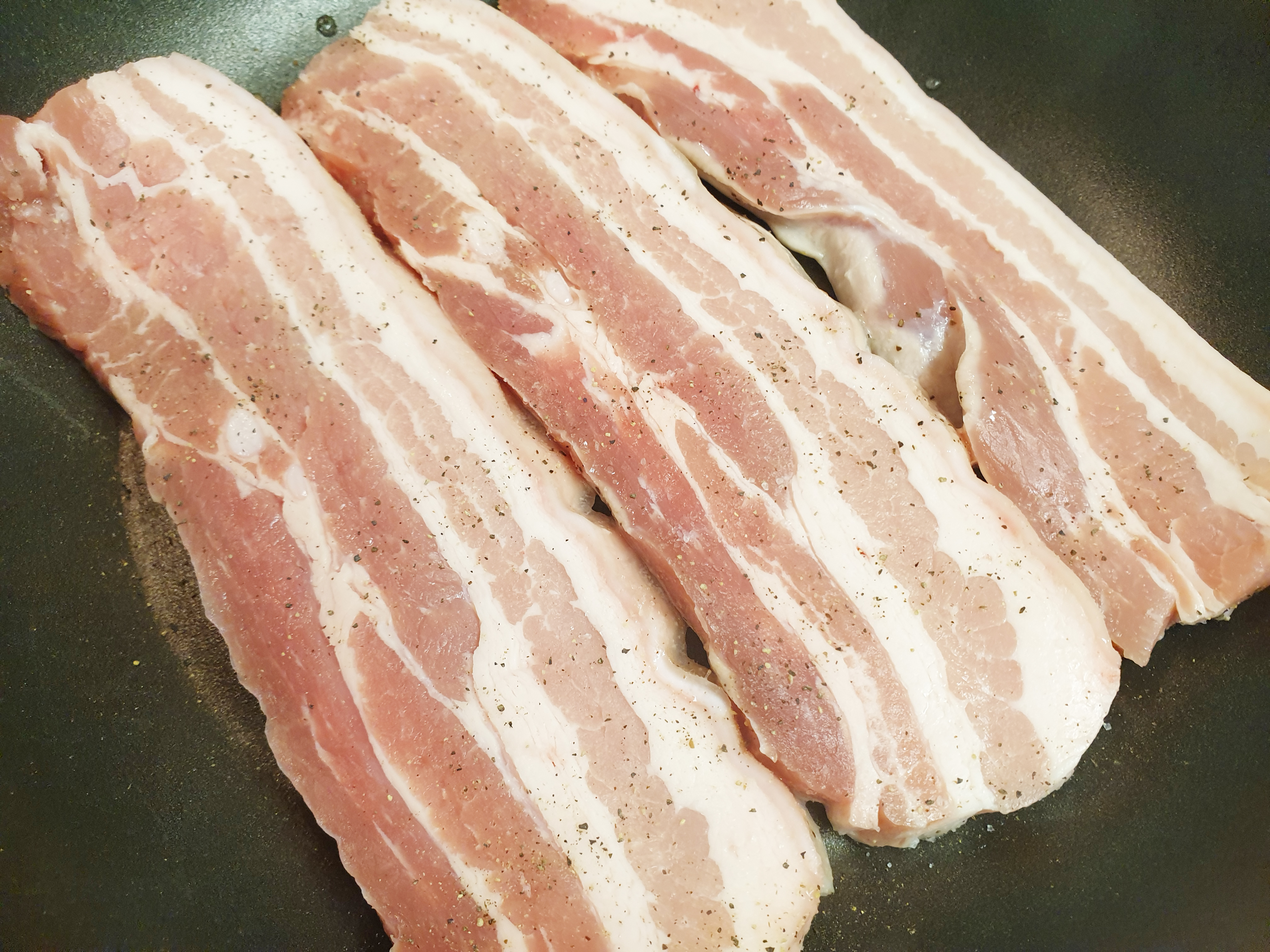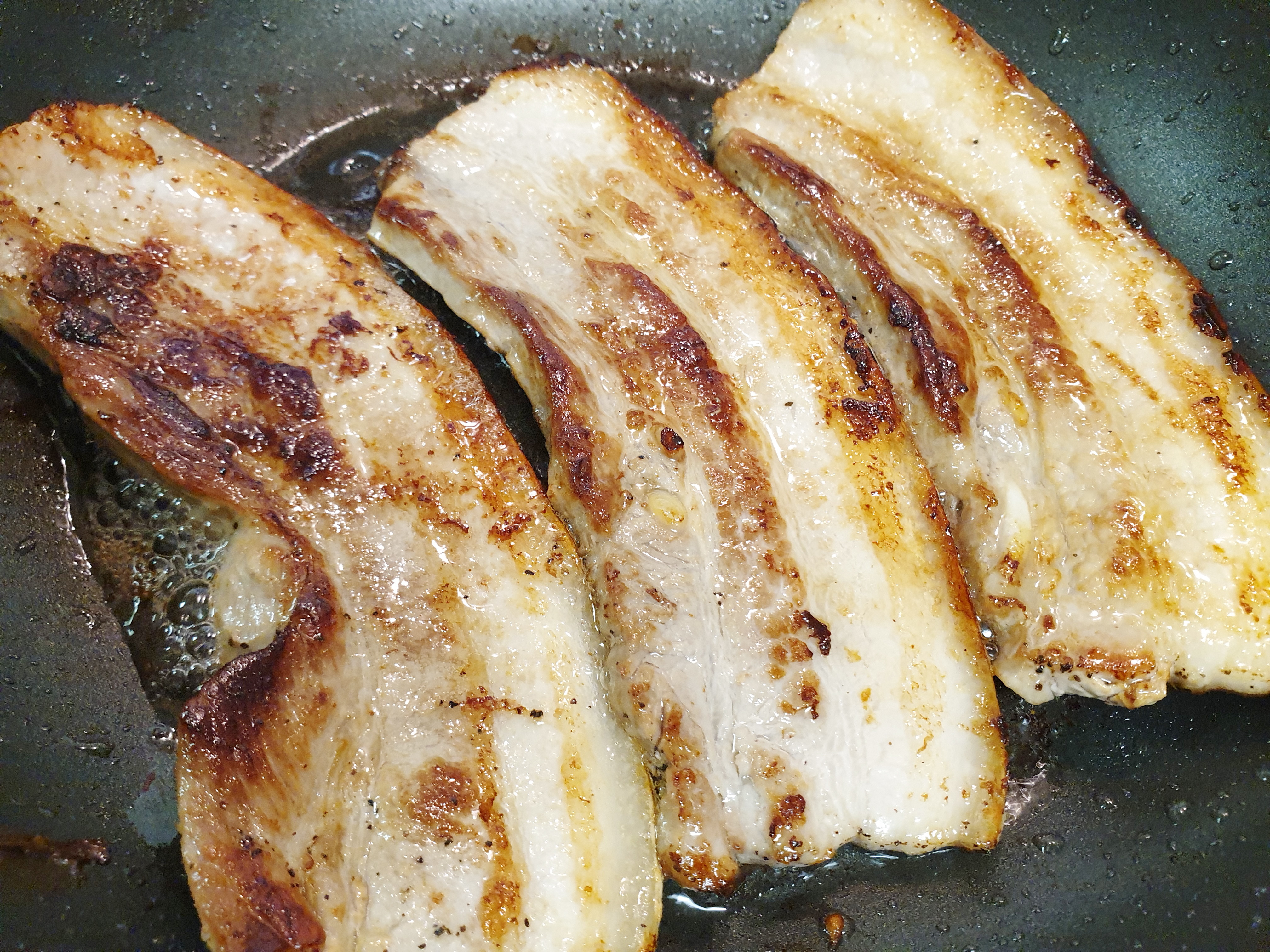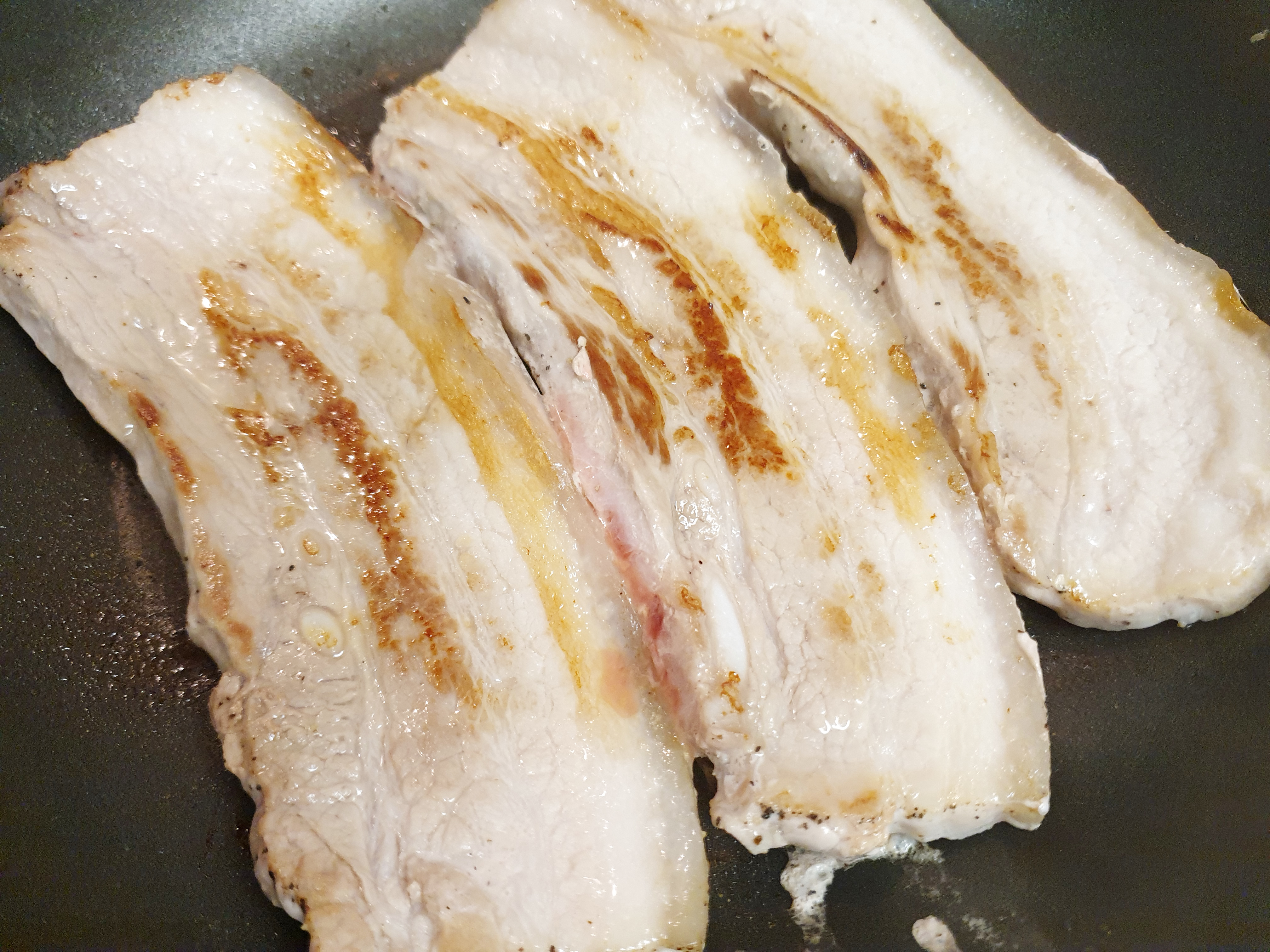 4. 프라이팬에 삼겹살을 올리고 소금과 후춧가루를 뿌려 중불 보다 센 불에 두고 앞뒤로 노릇노릇하게 구워 줍니다.