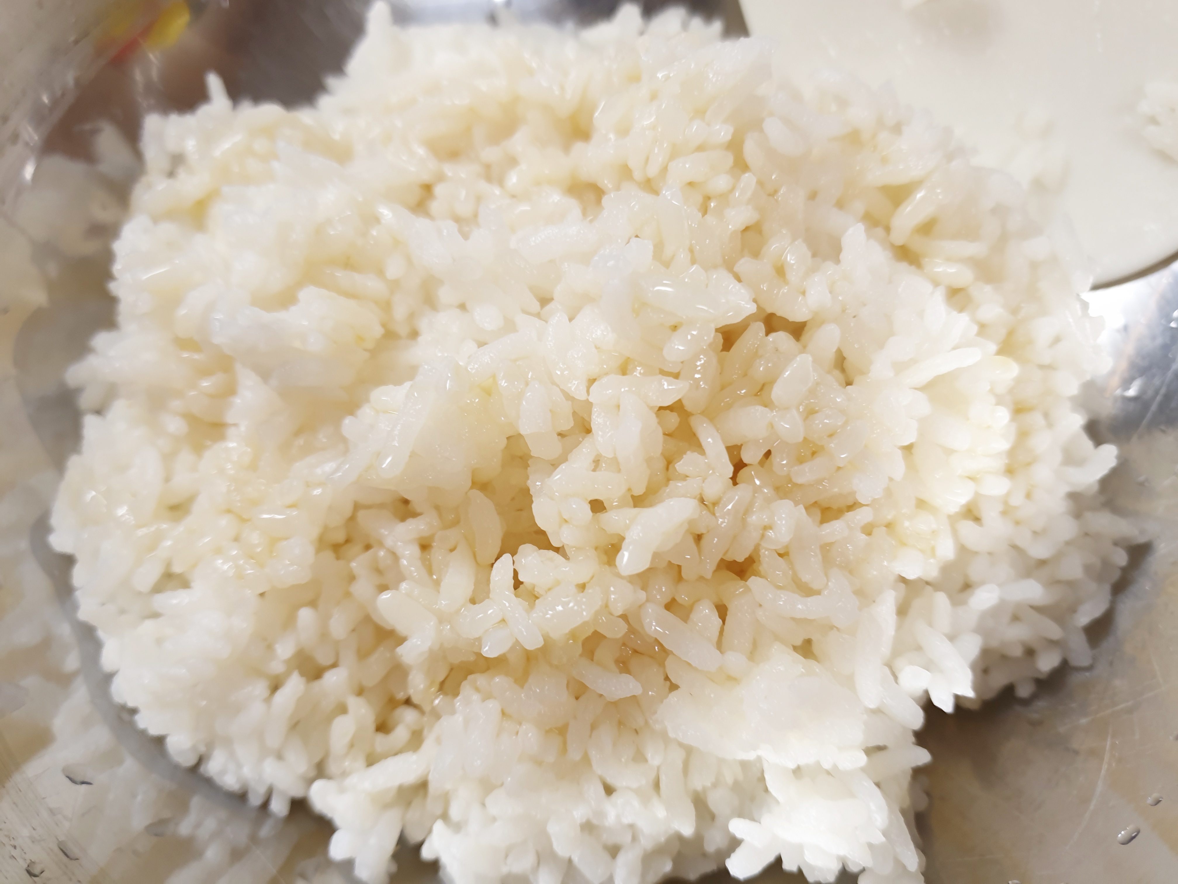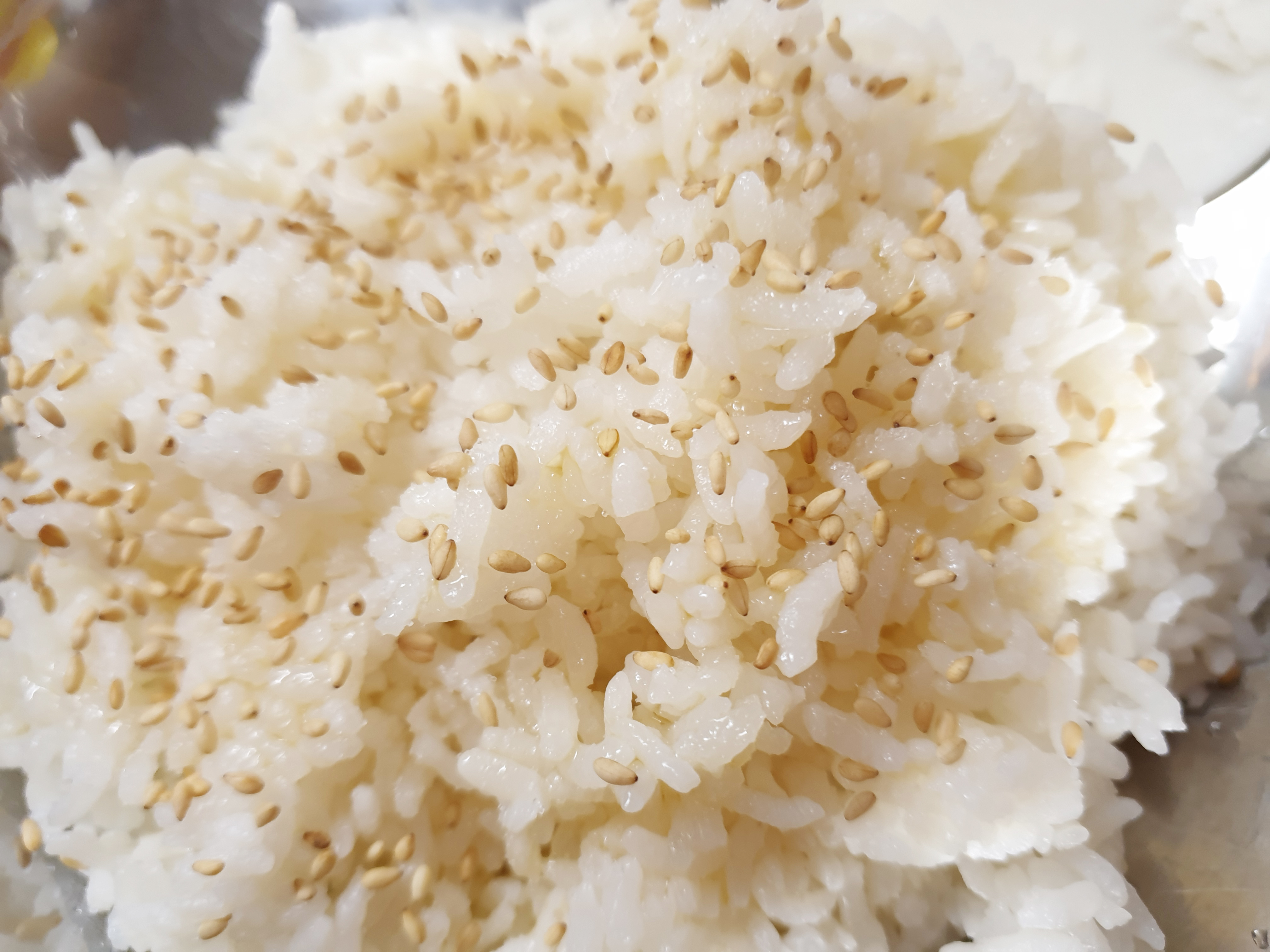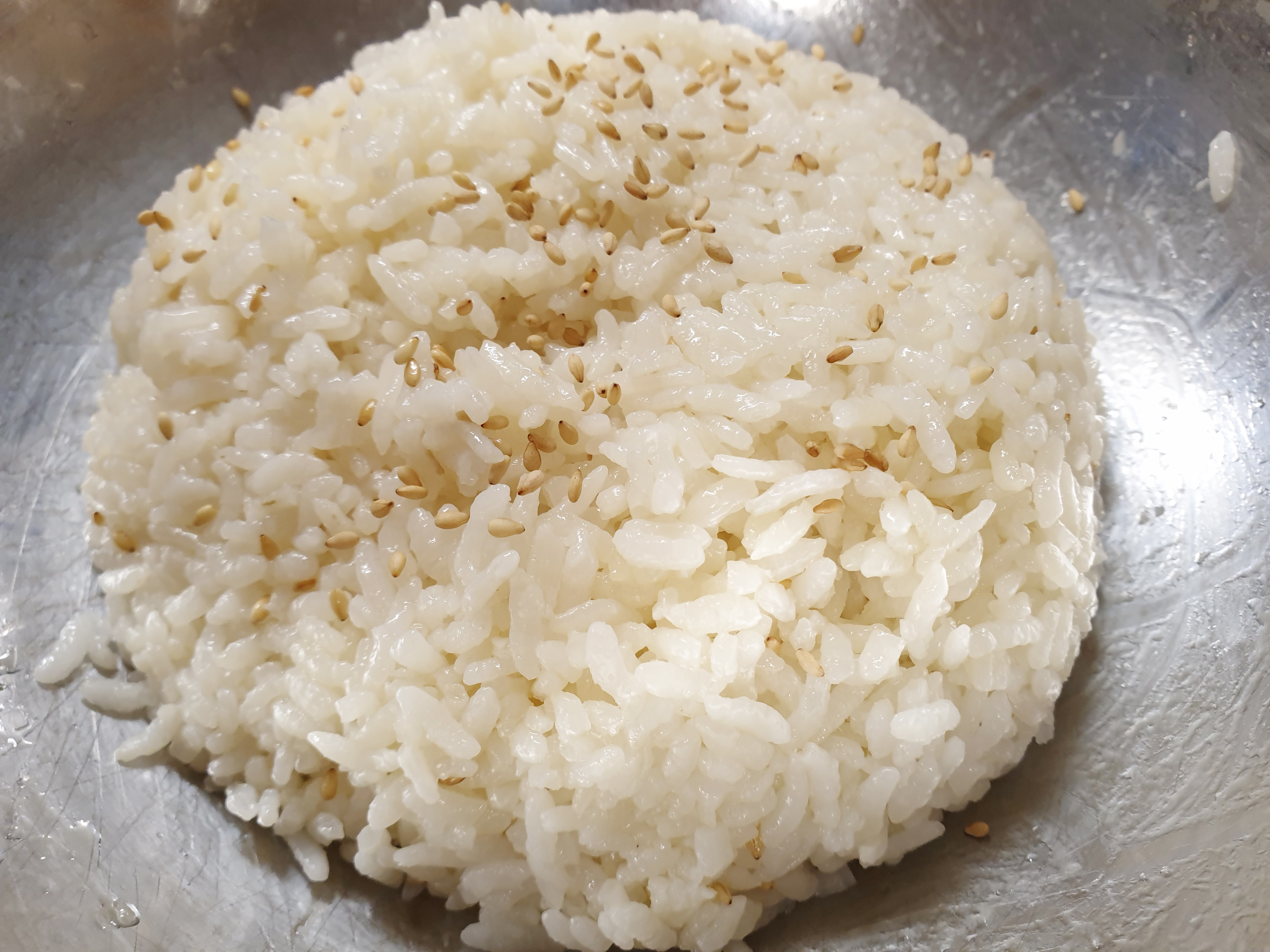 2. 만들 만큼의 밥을 덜어 참기름을 두르고 약간의 소금과 볶음 깨를 넣어 간을 해줍니다.