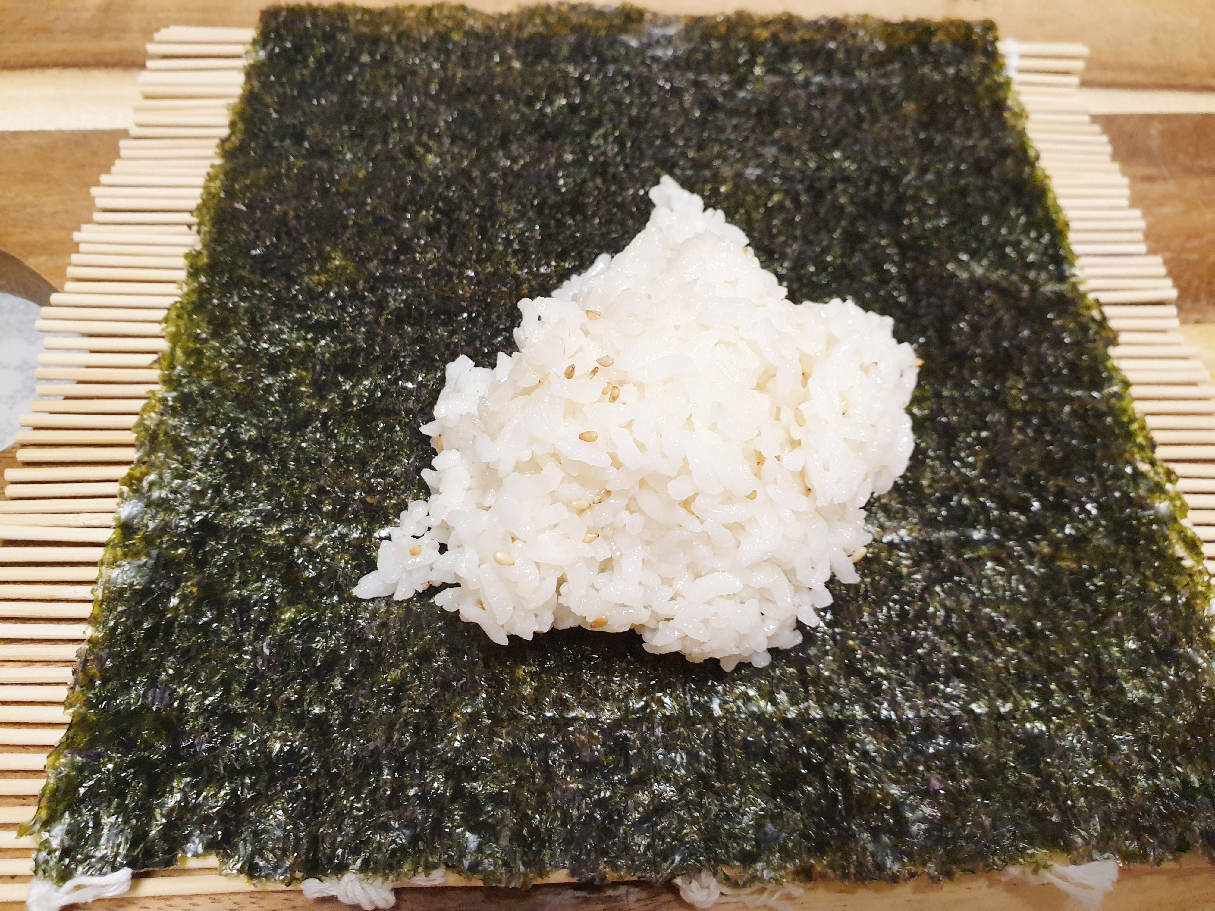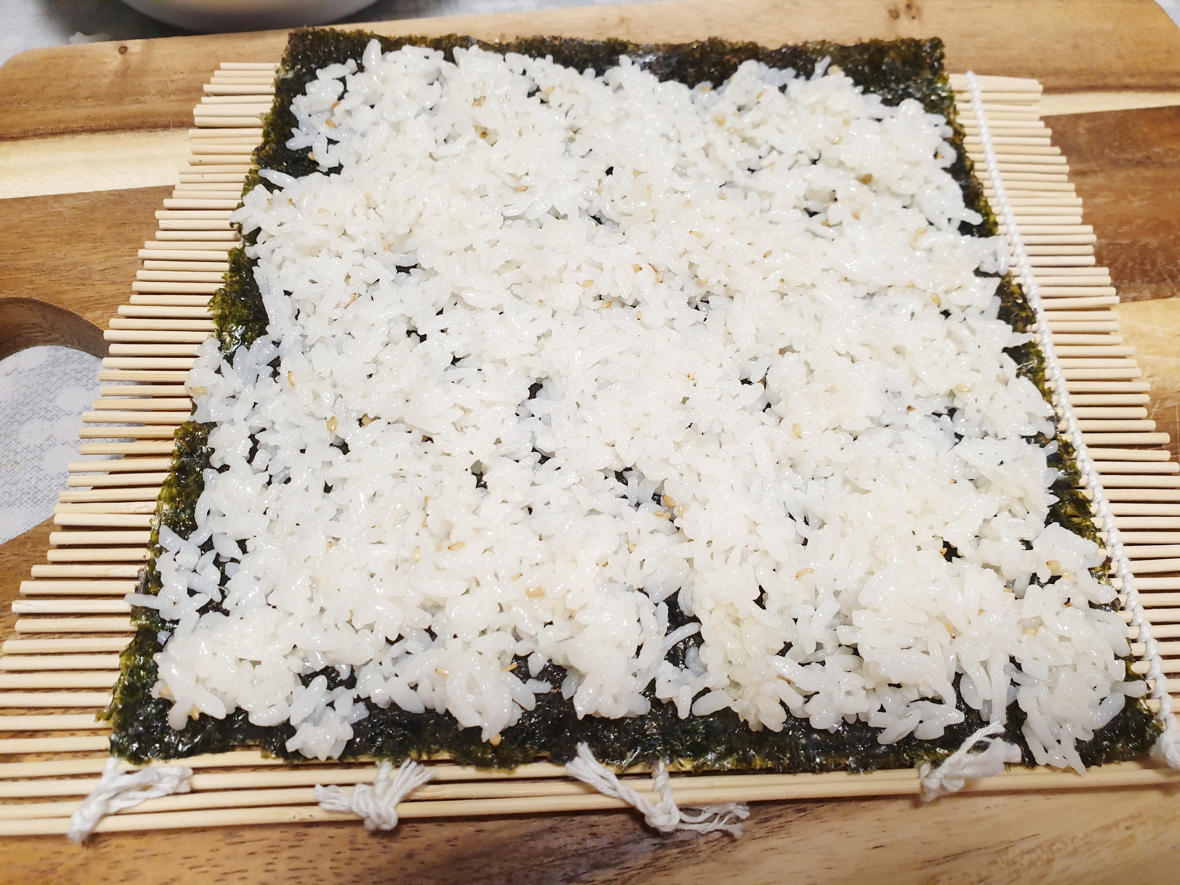 6. 김발 위에 김밥전용 김을 올리고 밥을 올려 넓고 얇게 깔아줍니다.