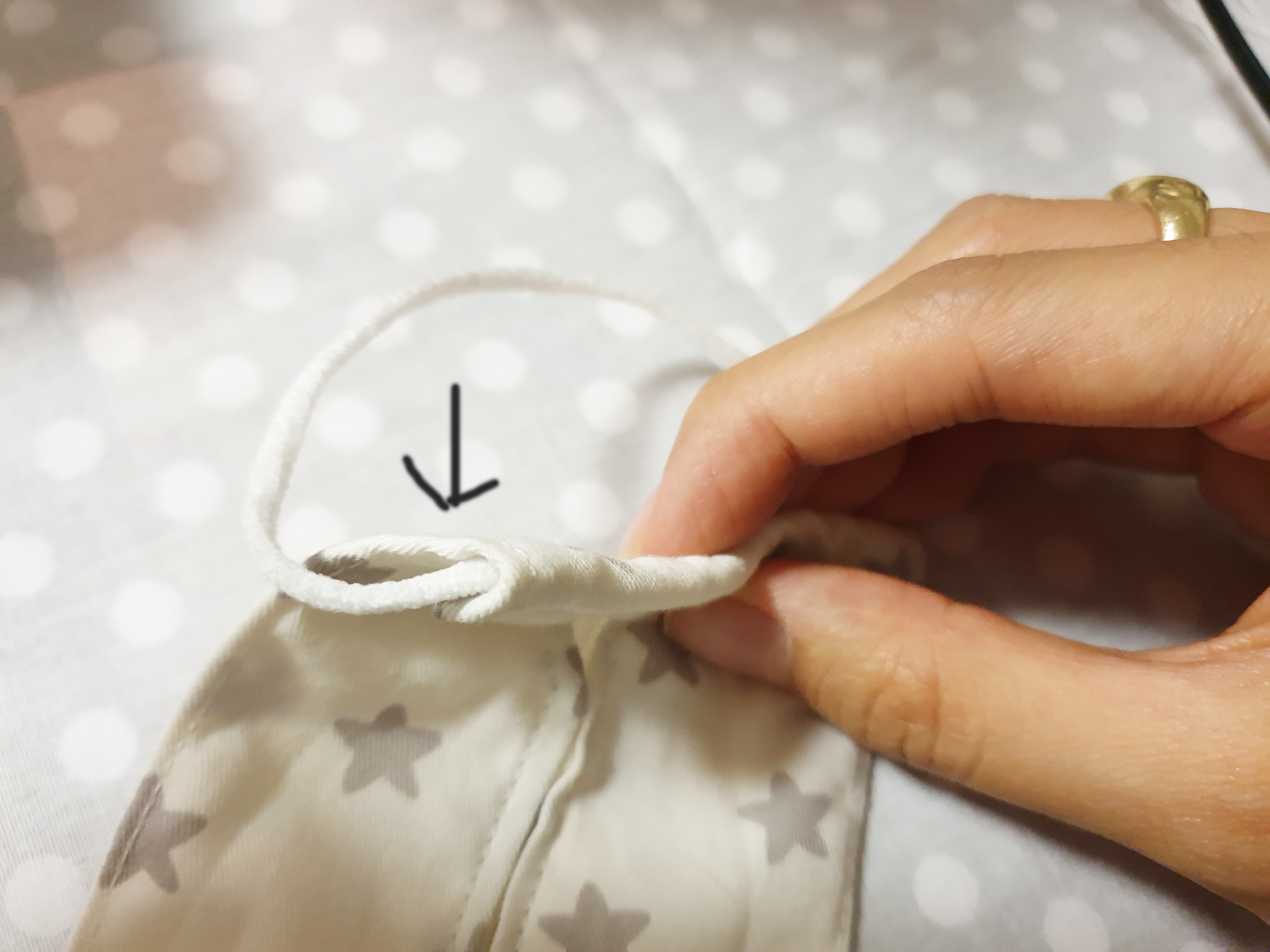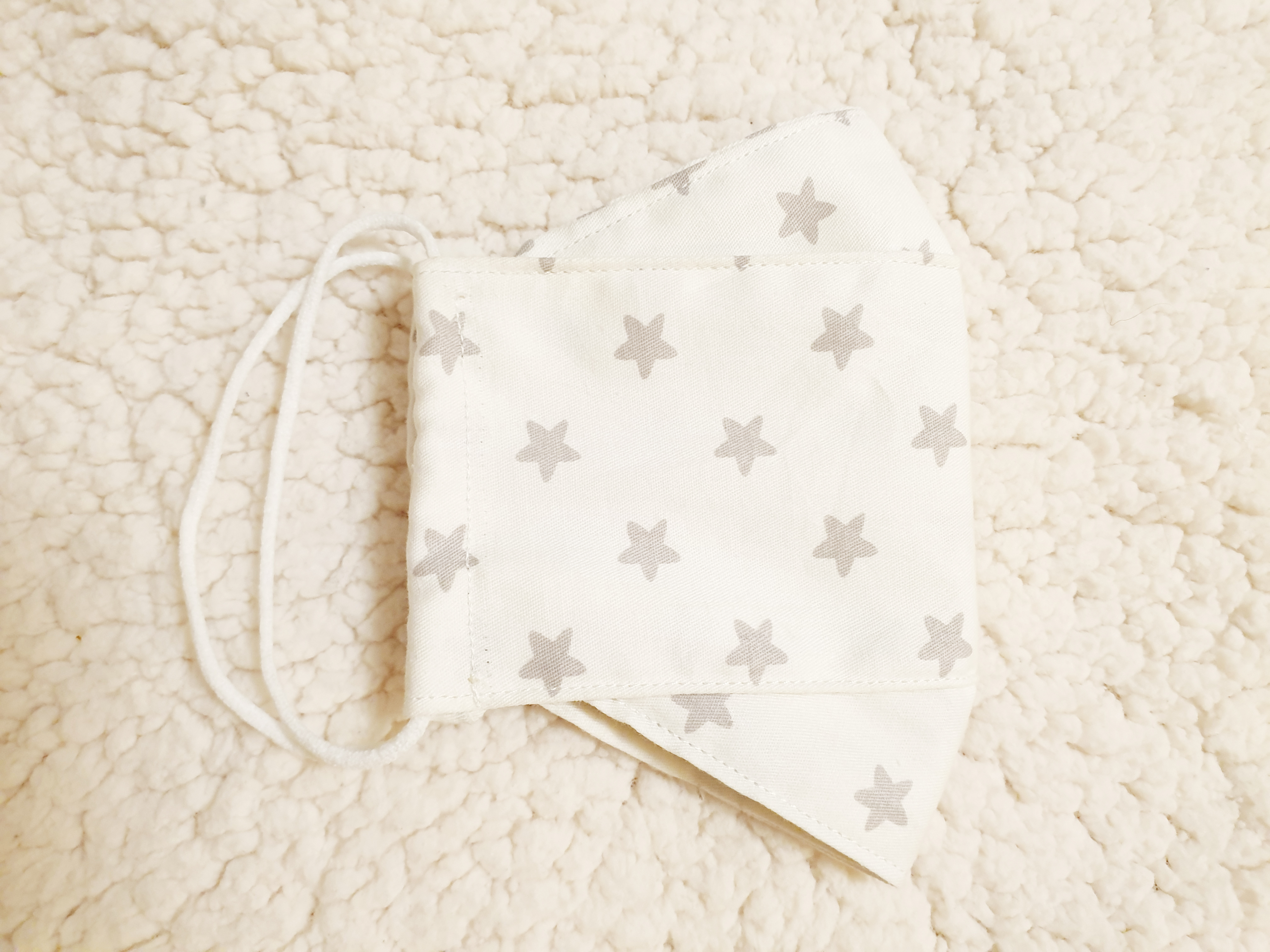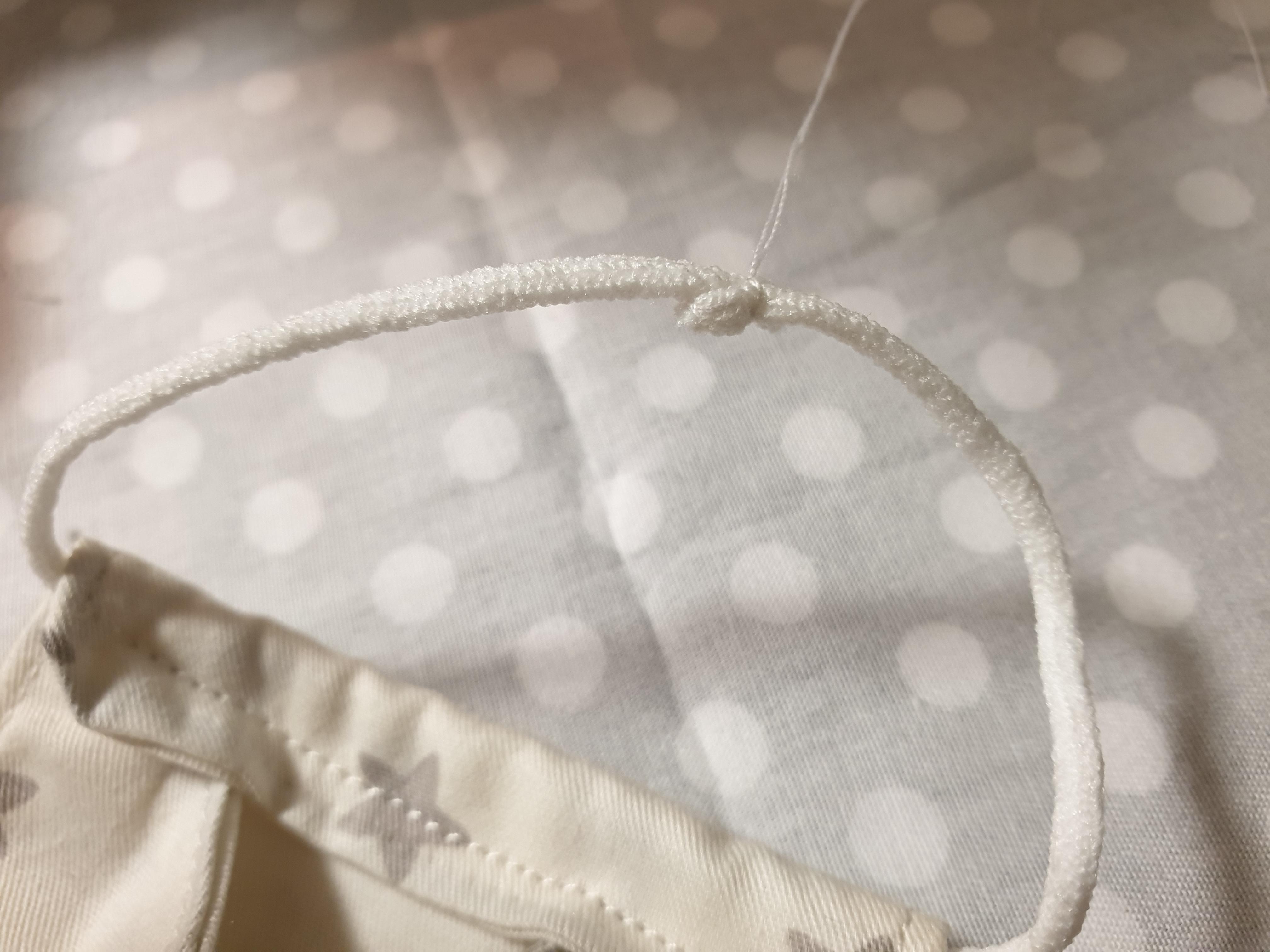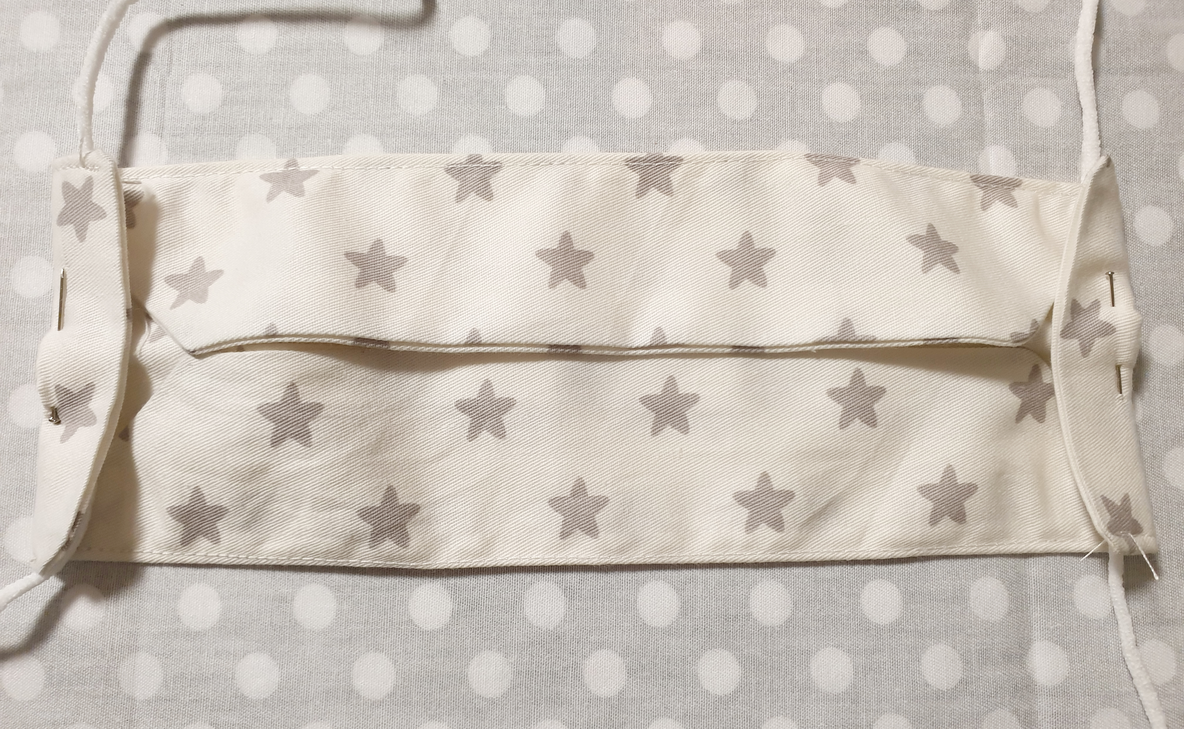 10. 다시 위아래를 접고 양 끝에 마스크 끈을 넣고 접은 뒤 박음질을 해주세요! (마스크 끈의 길이는 넉넉하게 각 23cm로 잘라줍니다.)