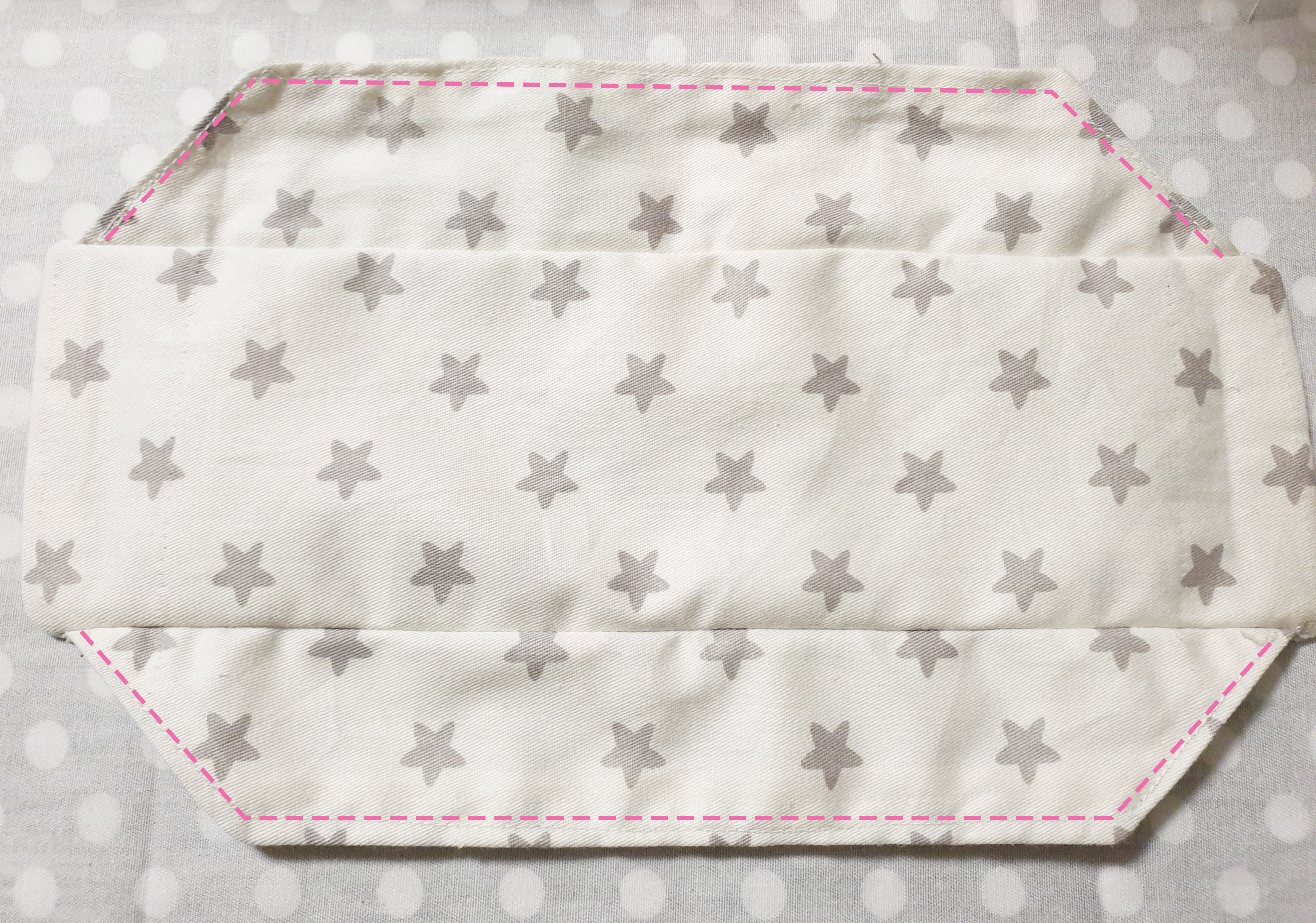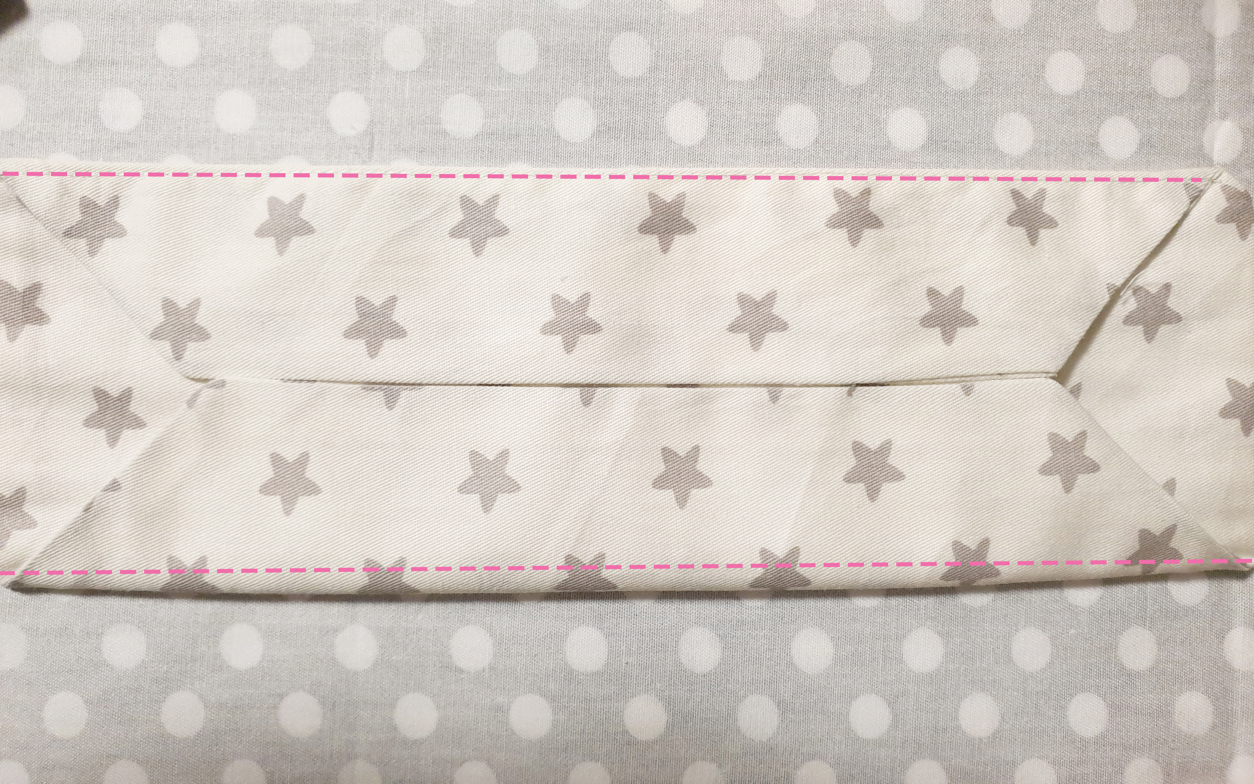 9. 접은 상태에서 위아래를 2mm 안쪽으로 박음질 해준 후, 다시 펴서 위아래 2mm 안쪽으로 박음질해줍니다.