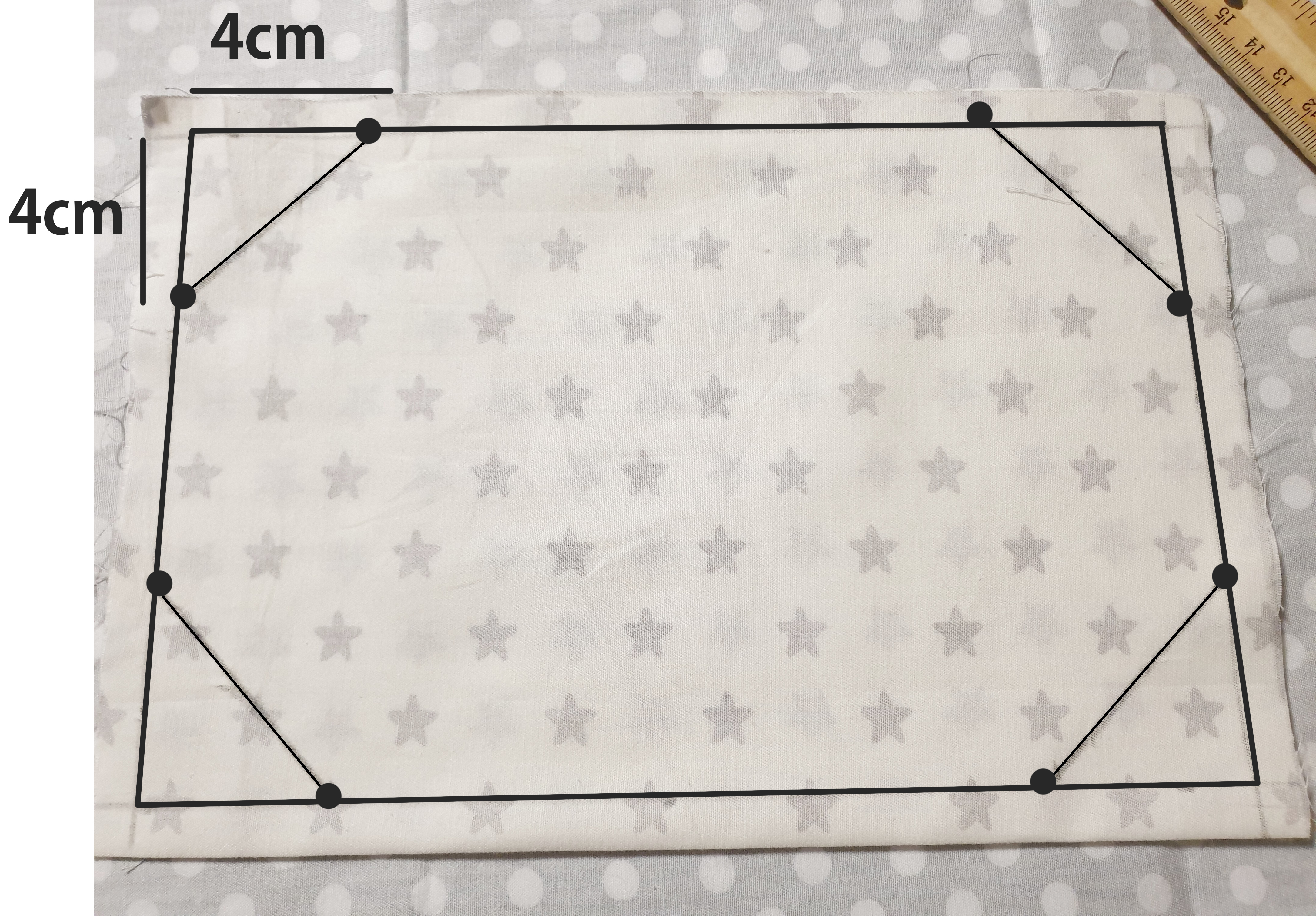 4. 1cm 간격을 두고 그린 선 안쪽으로 모서리 각 4cm씩 표시를 한 다음 대각선을 그어 그려줍니다.