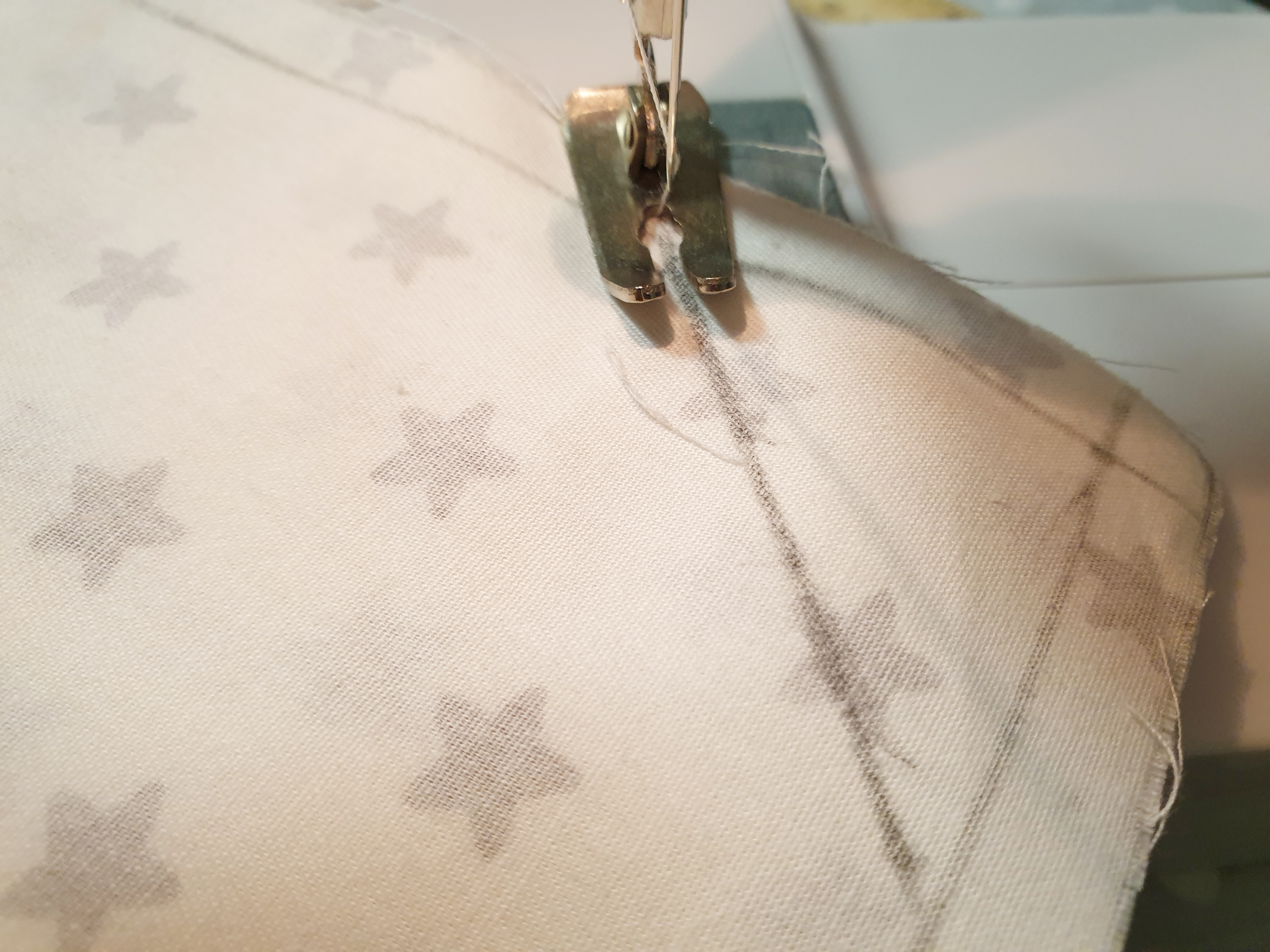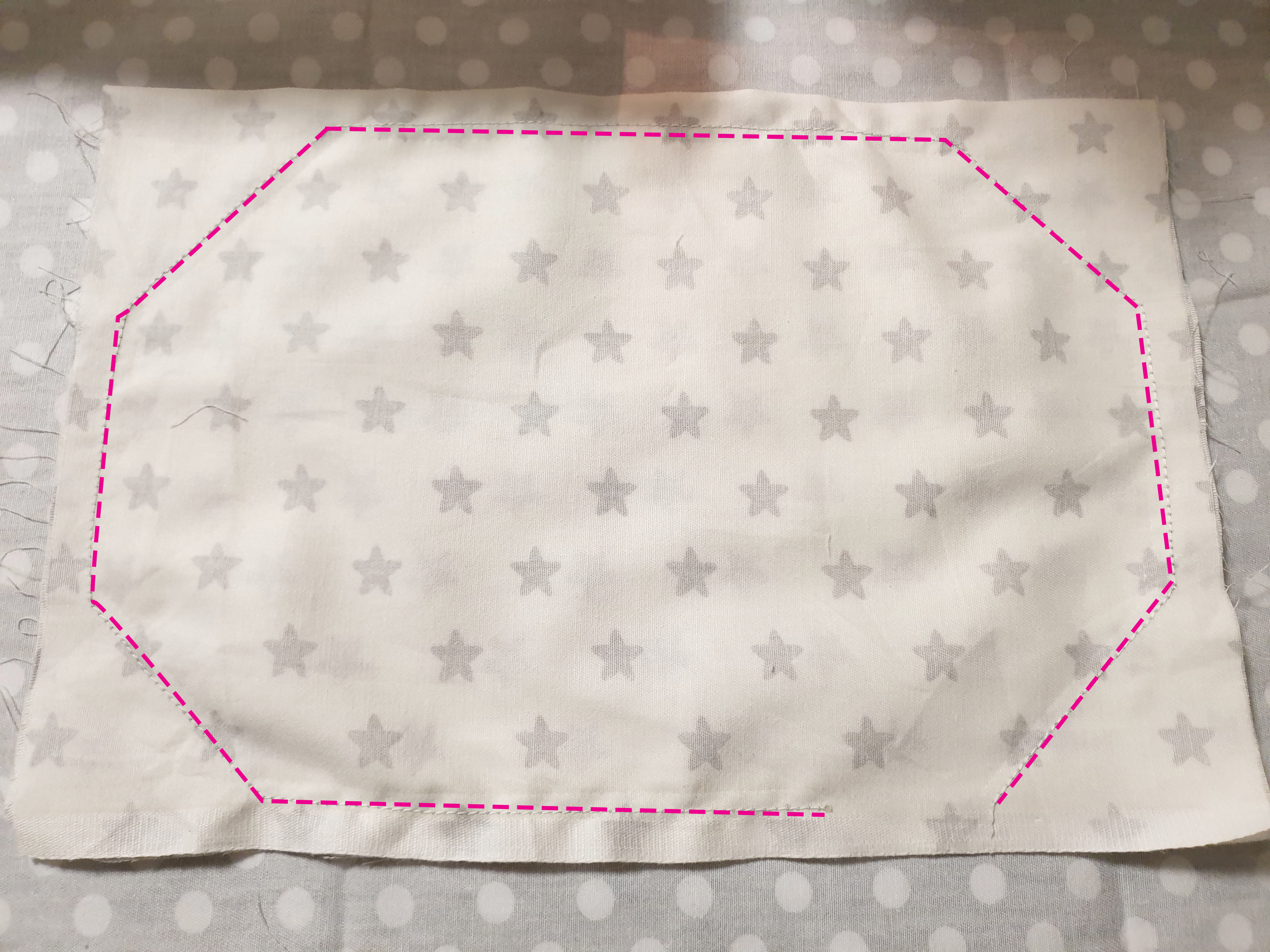 5. 천을 뒤집을 수 있도록 약간의 공간을 두고 그린 선을 따라 위에 사진처럼 박음질을 해주세요!