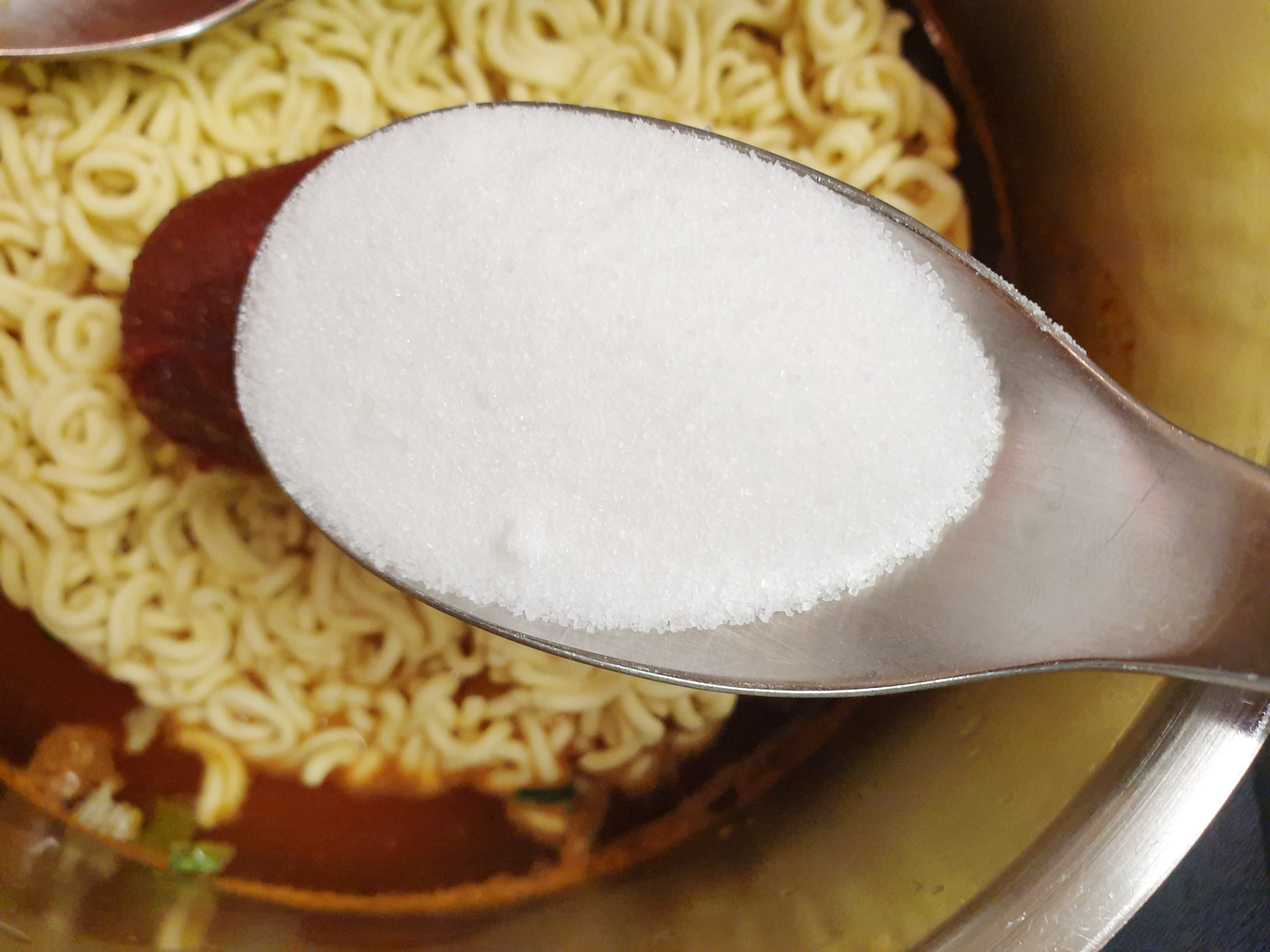 3. 물이 끓기 전에 라면을 넣고 고추장 1큰술, 설탕 1큰술을 넣고 잘 풀어주세요~!