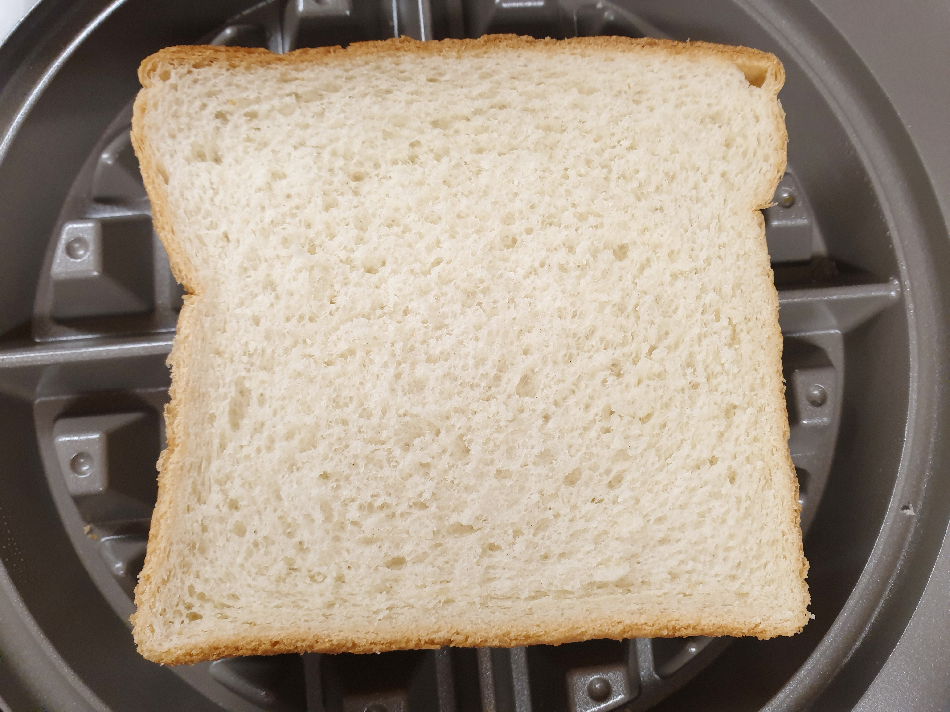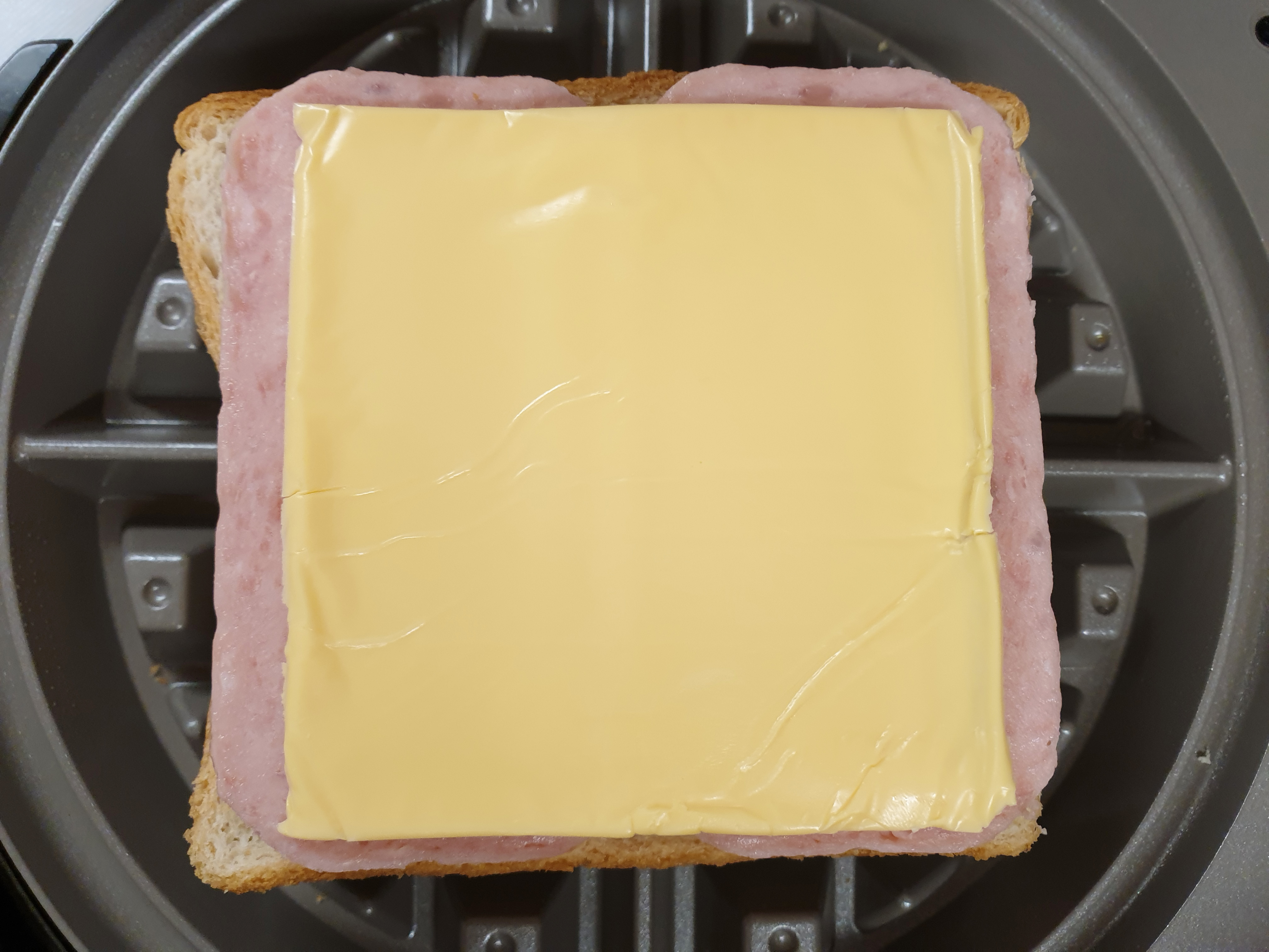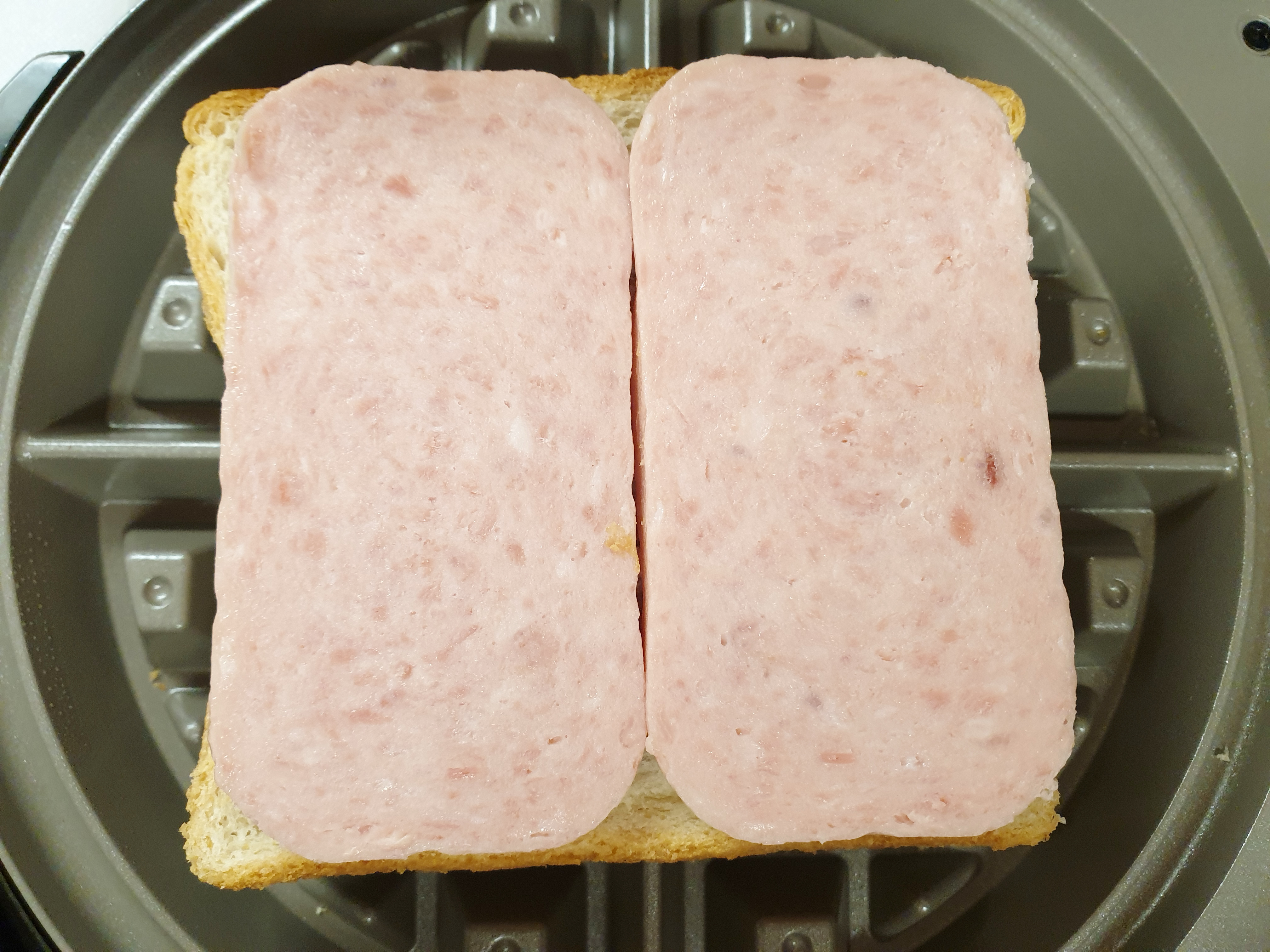 4. 그다음 와플 기계에 식빵 - > 햄 -> 체다 치즈 -> 식빵 순서대로 올려줍니다.