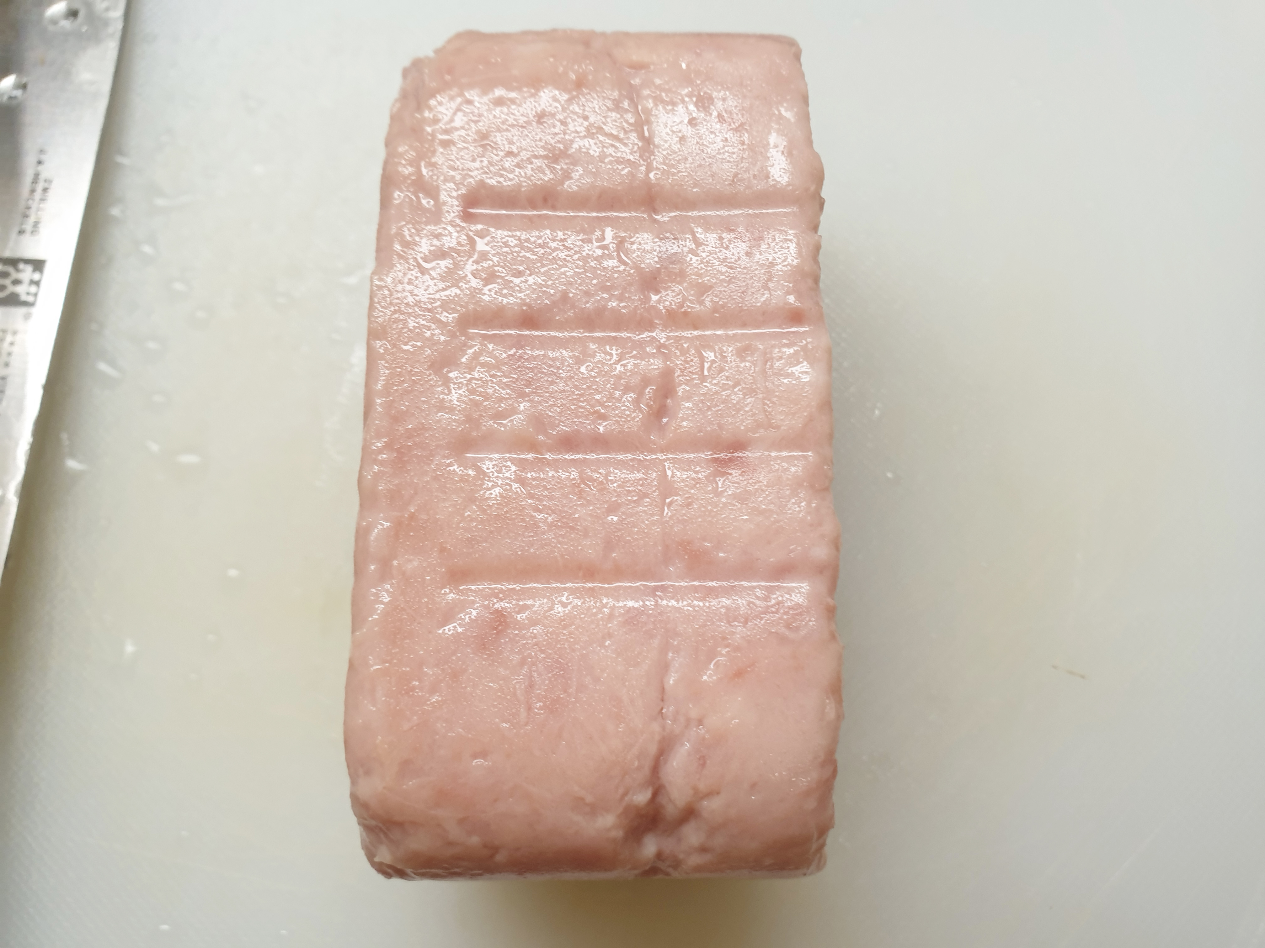 2. 스팸(198g)을 6등분으로 썰어줍니다. (슬라이스 햄을 준비하신 분들은 그대로 사용하시면 돼요~)